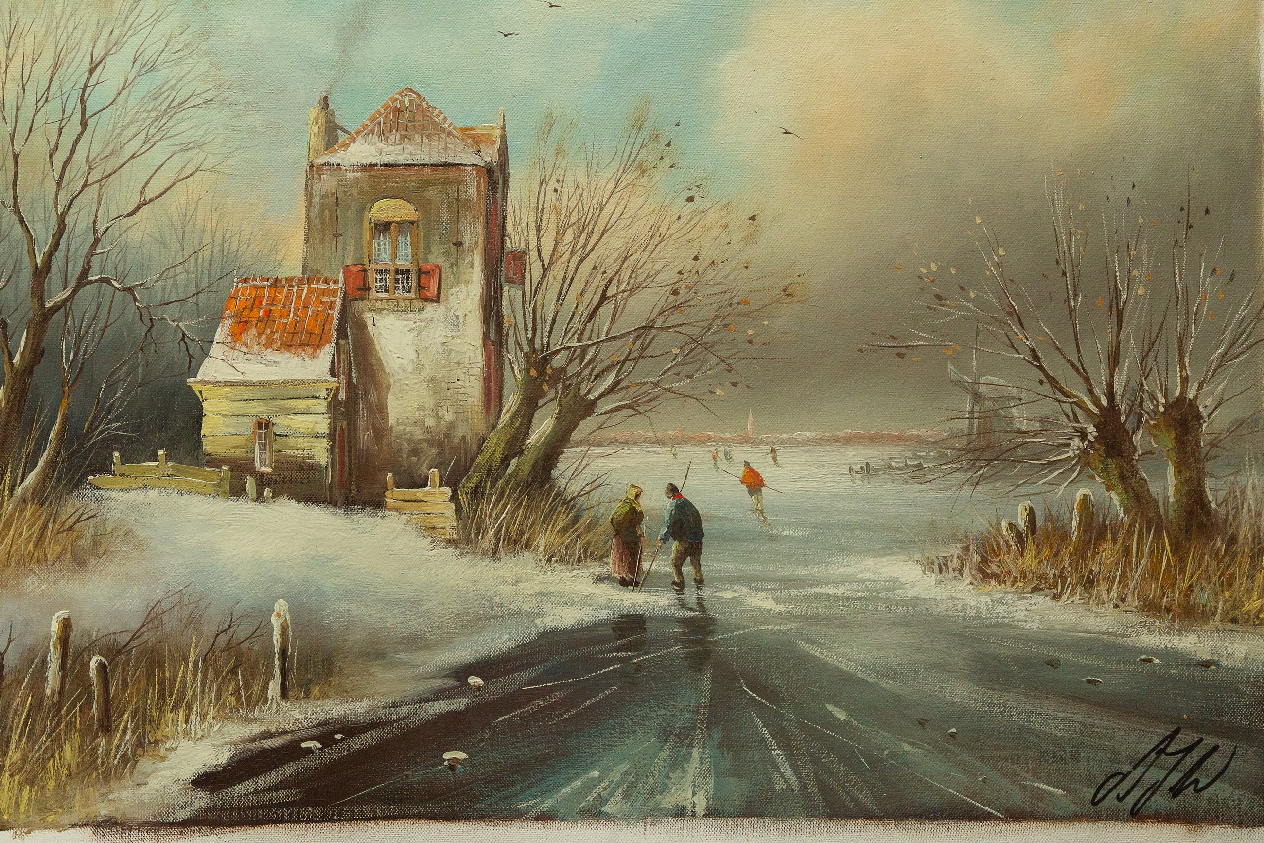 Mooi winterlandschap met figuren op het ijs van de Hilversumse kunstenaar Toon Wildeboer,