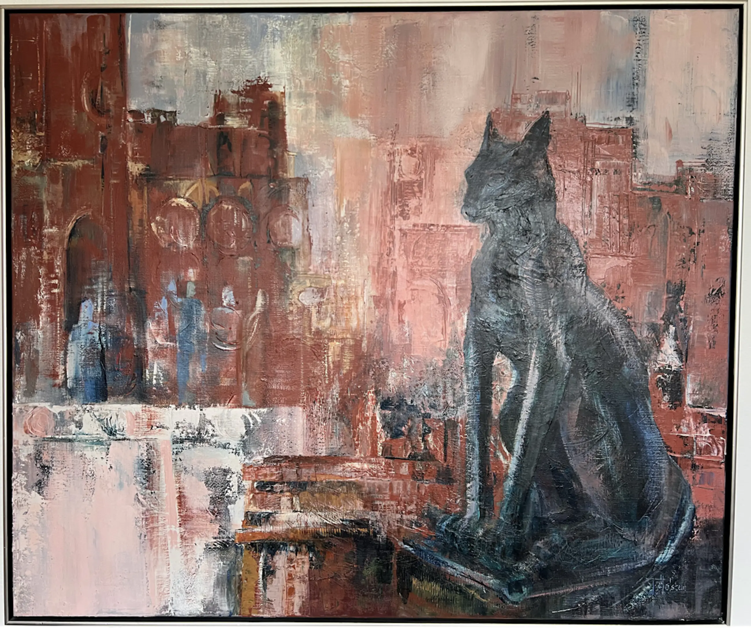 Het schilderij heeft een impressie van Caïro met ‘Bastet’ op de voorgrond. Bastet was in de Egyptische mythologie een vruchtbaarheidsgodin, voorgesteld als een kat.