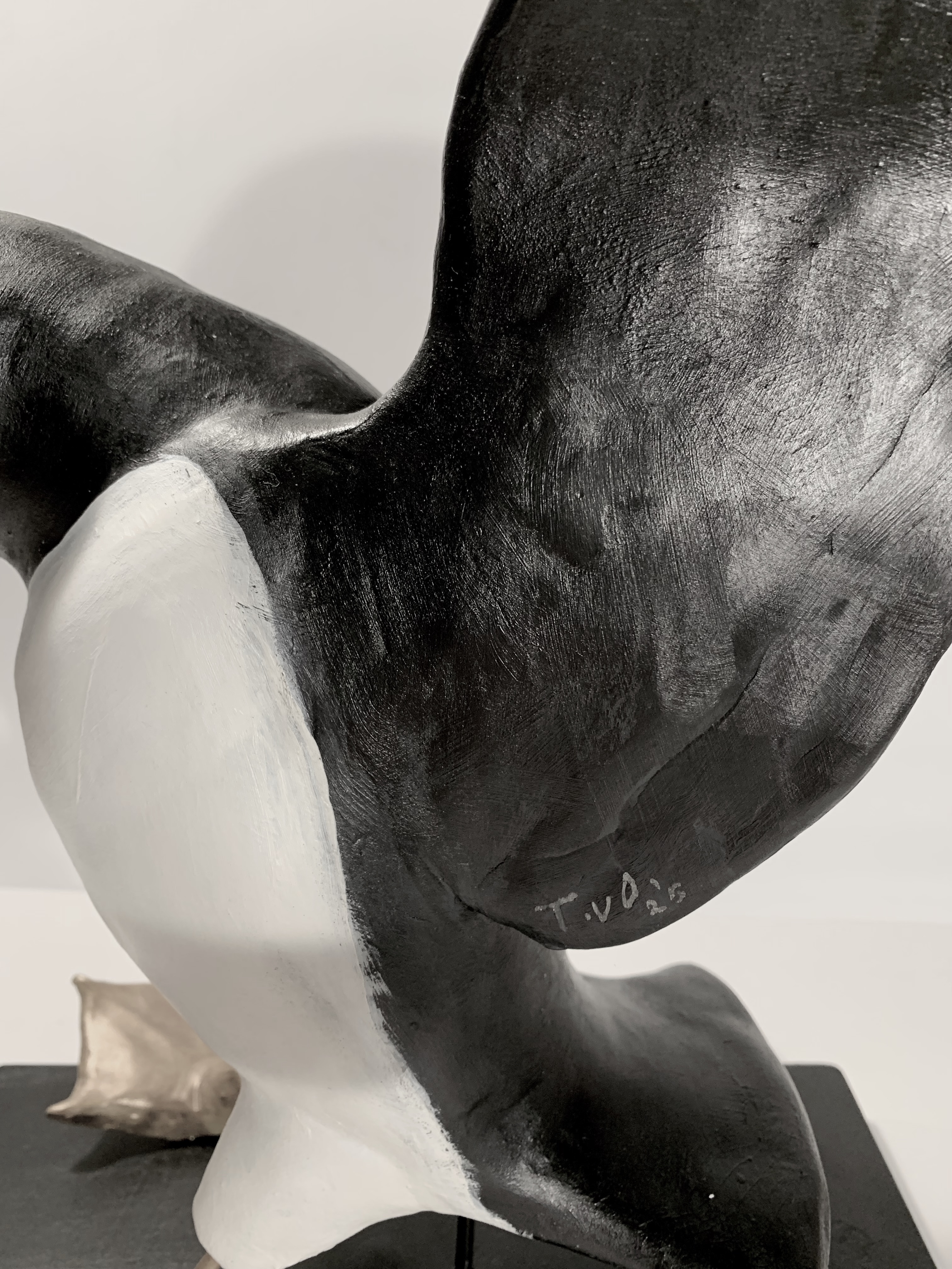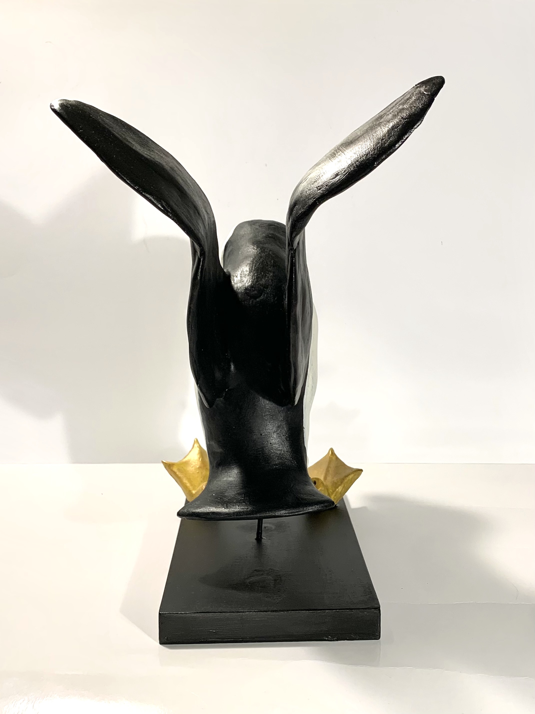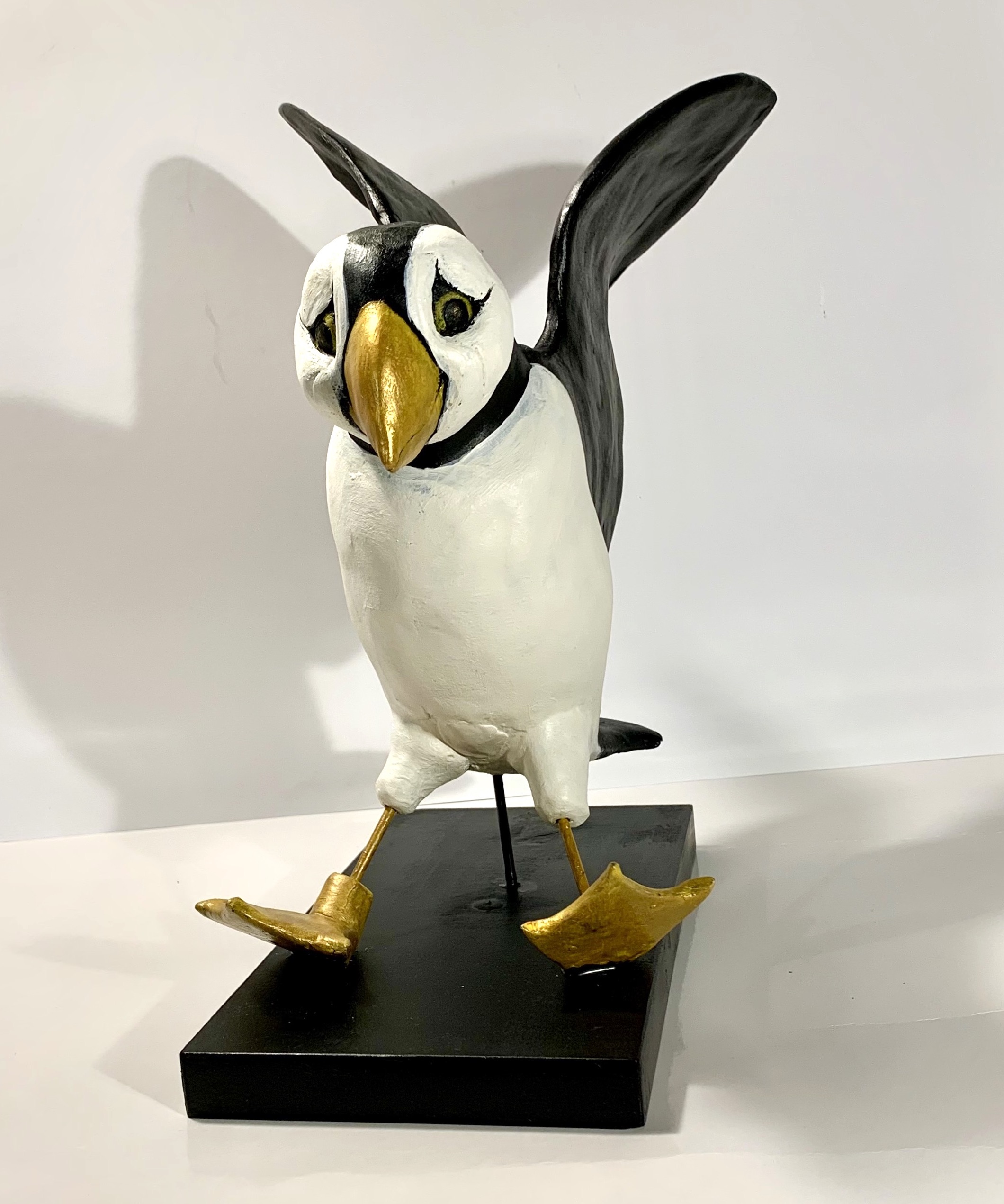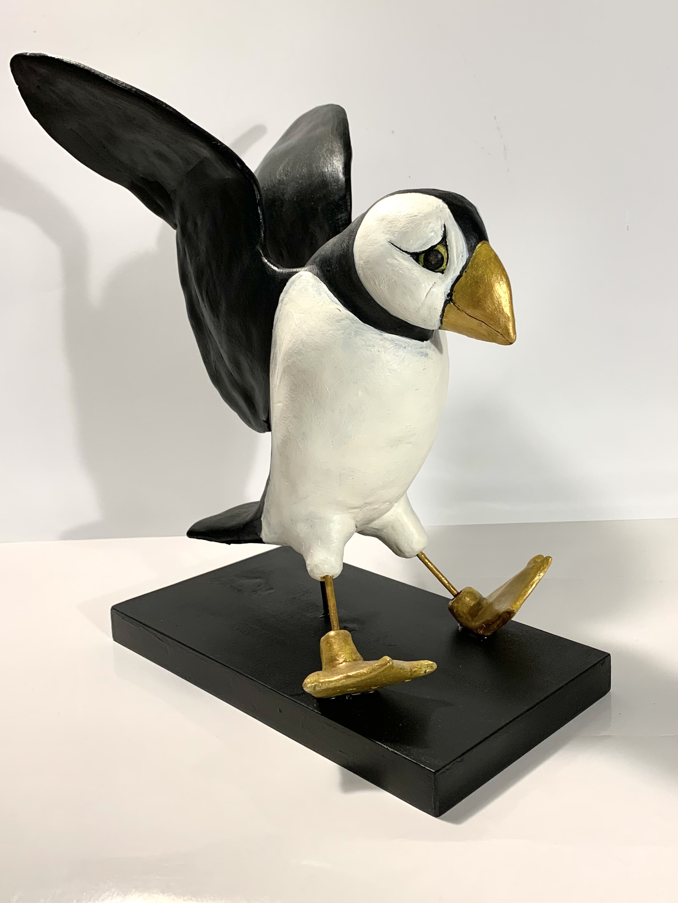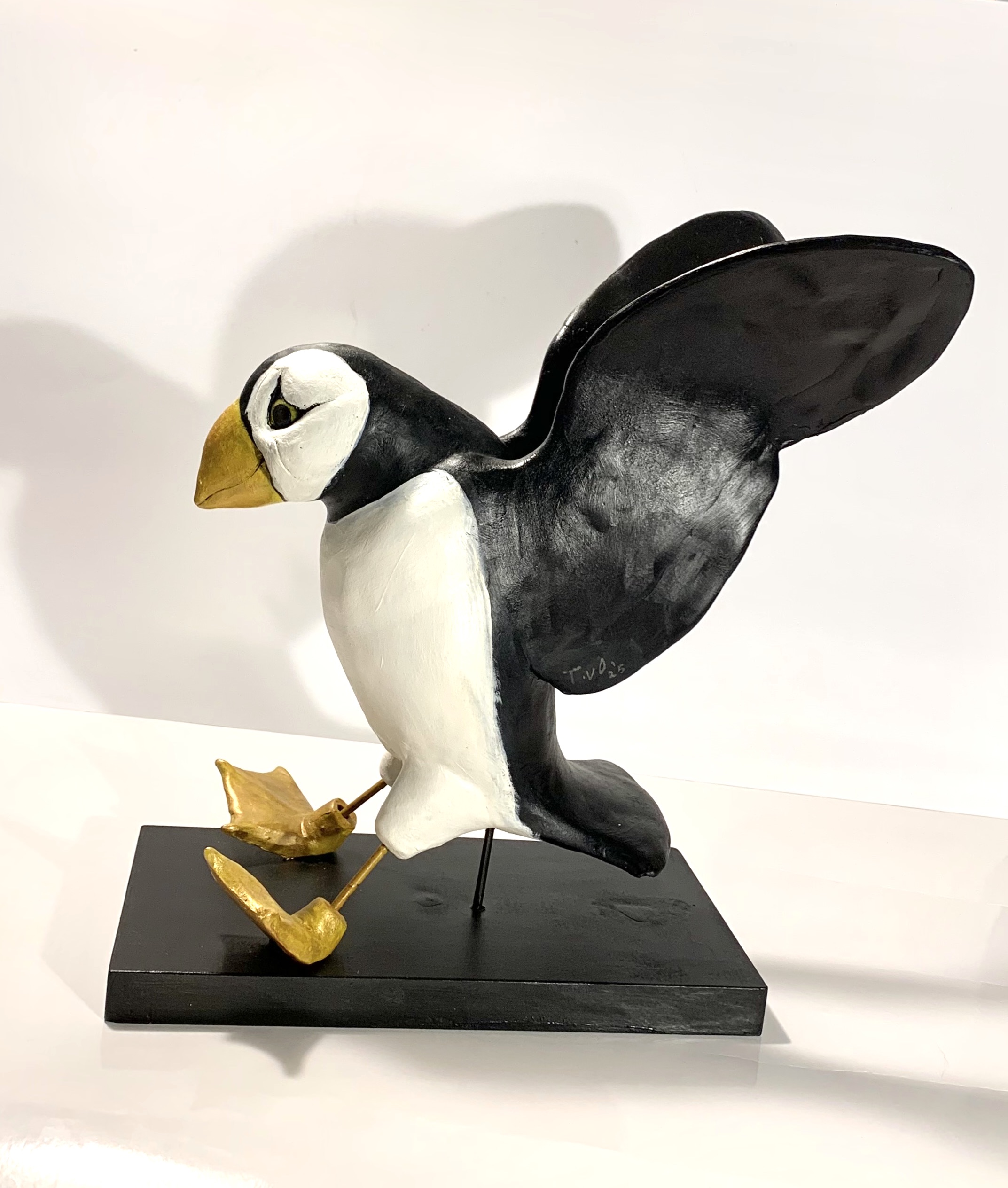 Dit beeld is gemaakt door Tosca van Oorschot (1965, Amsterdam) woont en werkt in Leerdam. Het is van keramiek en staat op een houten sokkel. Zij heeft de landing van een papegaaiduiker in dit werk vastgelegd. De schoonheid en humor van het dierenrijk intrigeren haar. Het werk van hedendaagse animaliers inspireert haar. Haar bedoeling is de toeschouwer plezier te laten beleven aan haar creaties. Voor haarzelf is werken aan haar diersculpturen een bron van vreugde. Zij heeft opleidingen gevolgd aan de Wackers Academie en de Hoge School voor de Kunsten in Amsterdam. Haar werk wordt verkocht in zowel binnen- als buitenland en is geëxposeerd in verschillende galeries in Nederland.