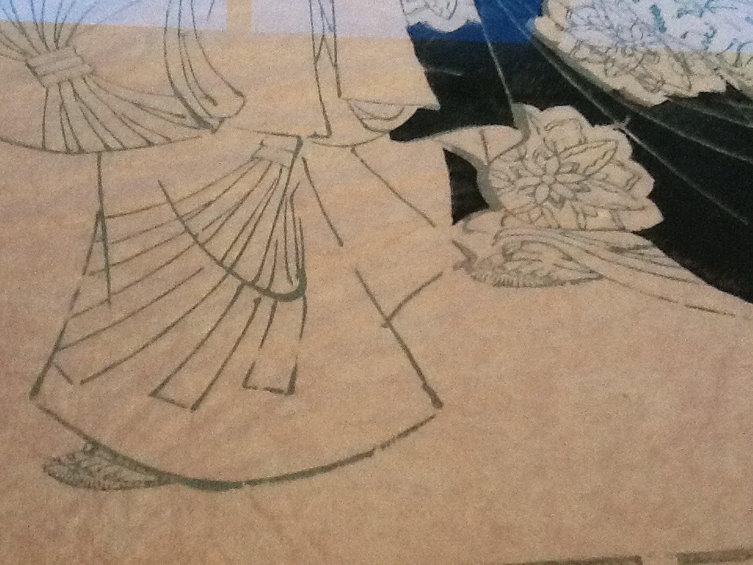 Het betreft waarschijnlijk een tekening of een eerste afdruk van het zwarte sleutelblok van een prent, gemaakt door de Japanse kunstenaar Mizuno Toshikata (1866-1908)