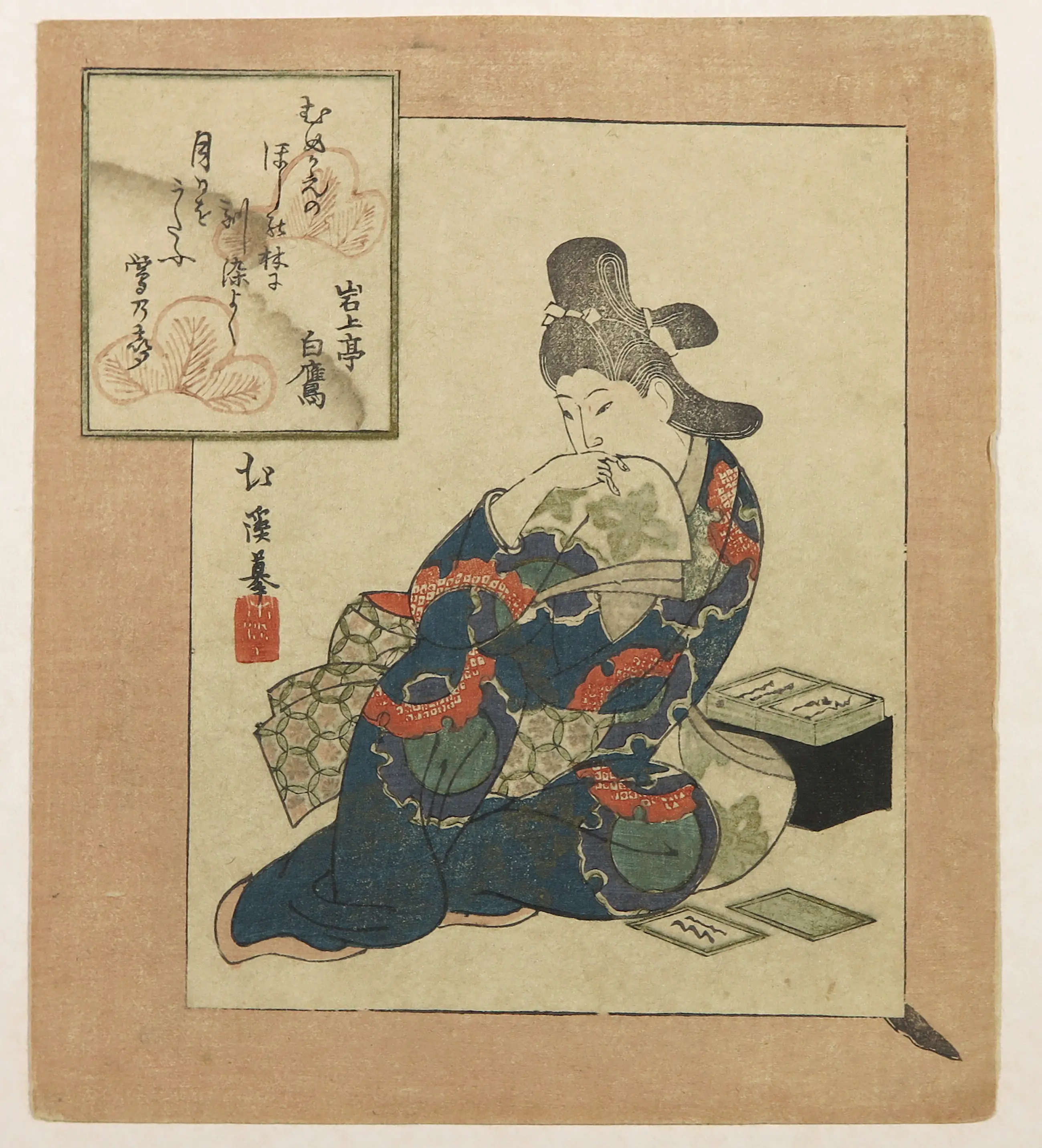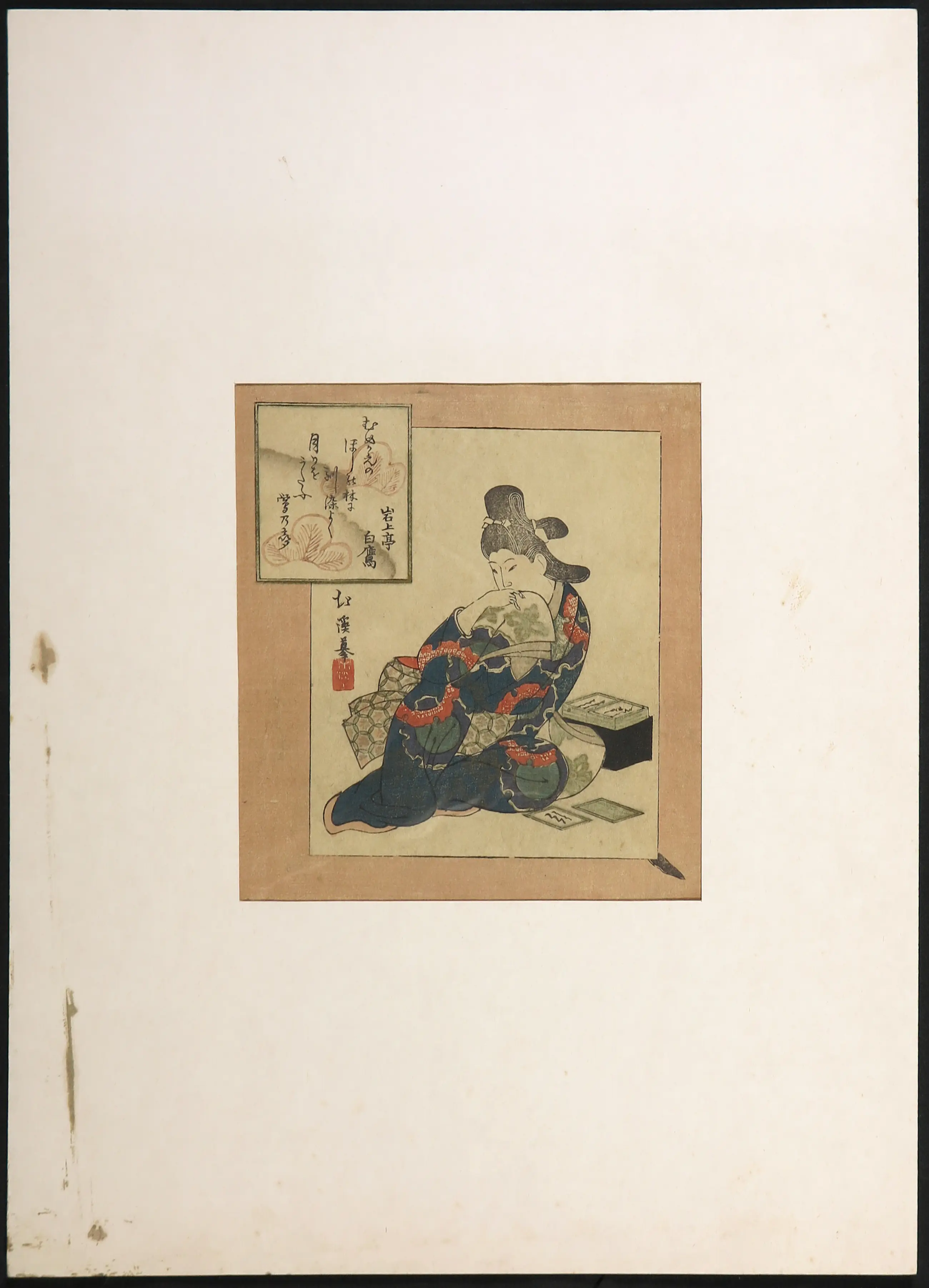 | Zeer goede staat gezien leeftijd, met vergeling. Passe-partout is aan vervanging toe. Het melinex venster is los. Onduidelijk of er een vlek/kring is ontstaan in het vakje linksboven (met de karakters). | |||