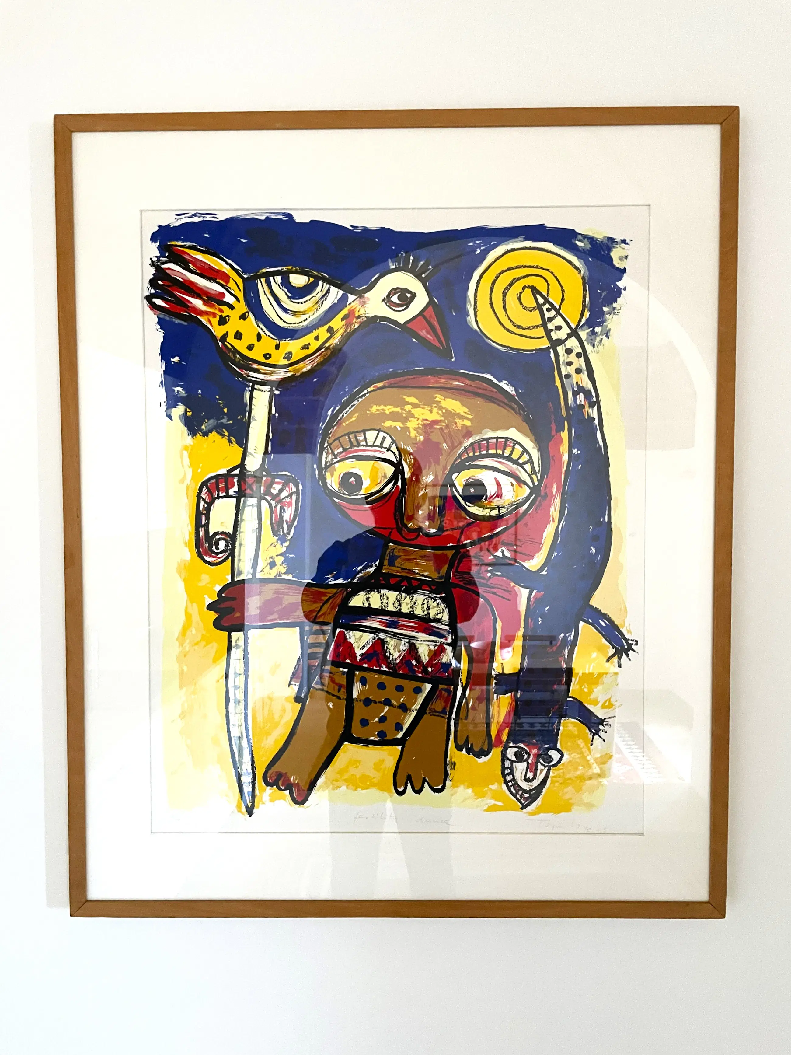 Mooie zeefdruk van Toyin Loye. 'Fertility Dance'. Ingelijst (Barth-lijst) achter glas met passe-partout. Gesigneerd, gedateerd (1995), genummerd en getiteld. Afmetingen 90 x 75 cm.