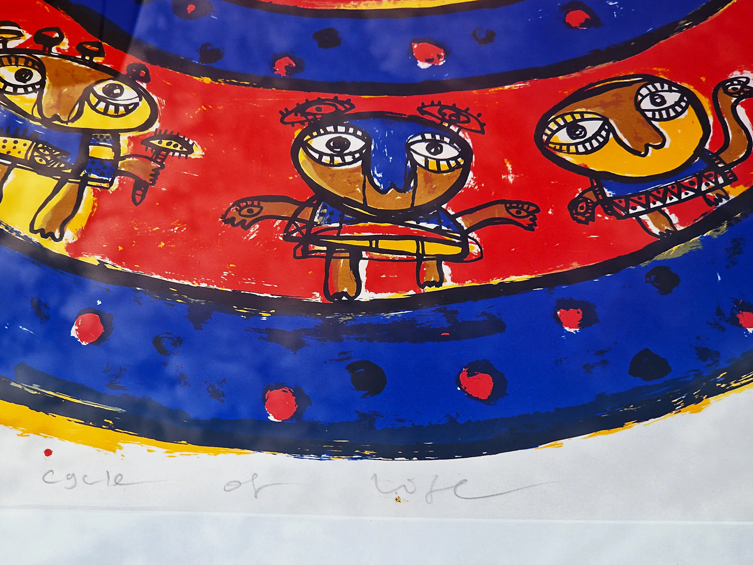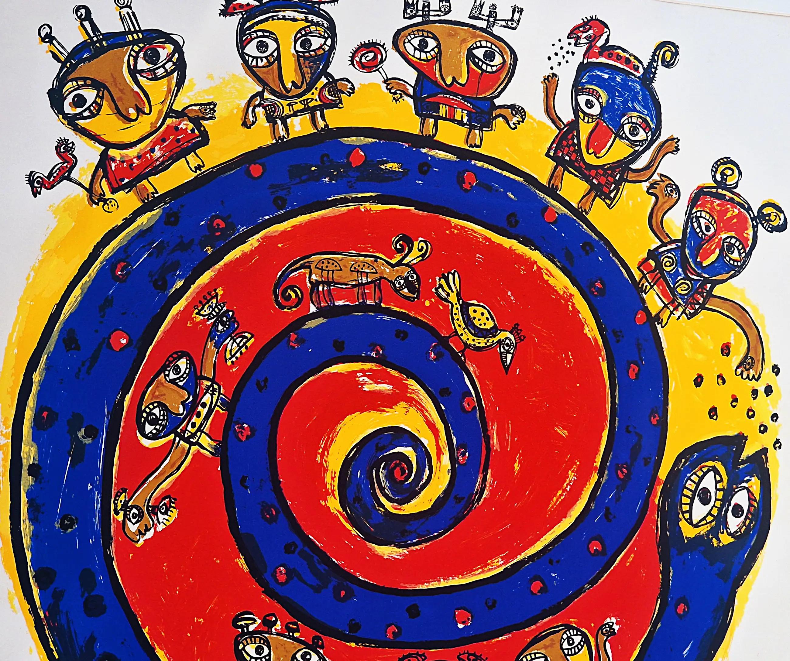 Toyin Loye was born in 1959 in Ijebu Jesa, Nigeria as a member of a traditional royal house. He started painting in the late 1970’s and studied Fine Art at Obafemi Awolowo University in Ile Ife. His paintings reflect mythology, philosophy and religion. His use of colors, motifs, patterns and representations is influenced by the ceremonies and festivals of Africa.