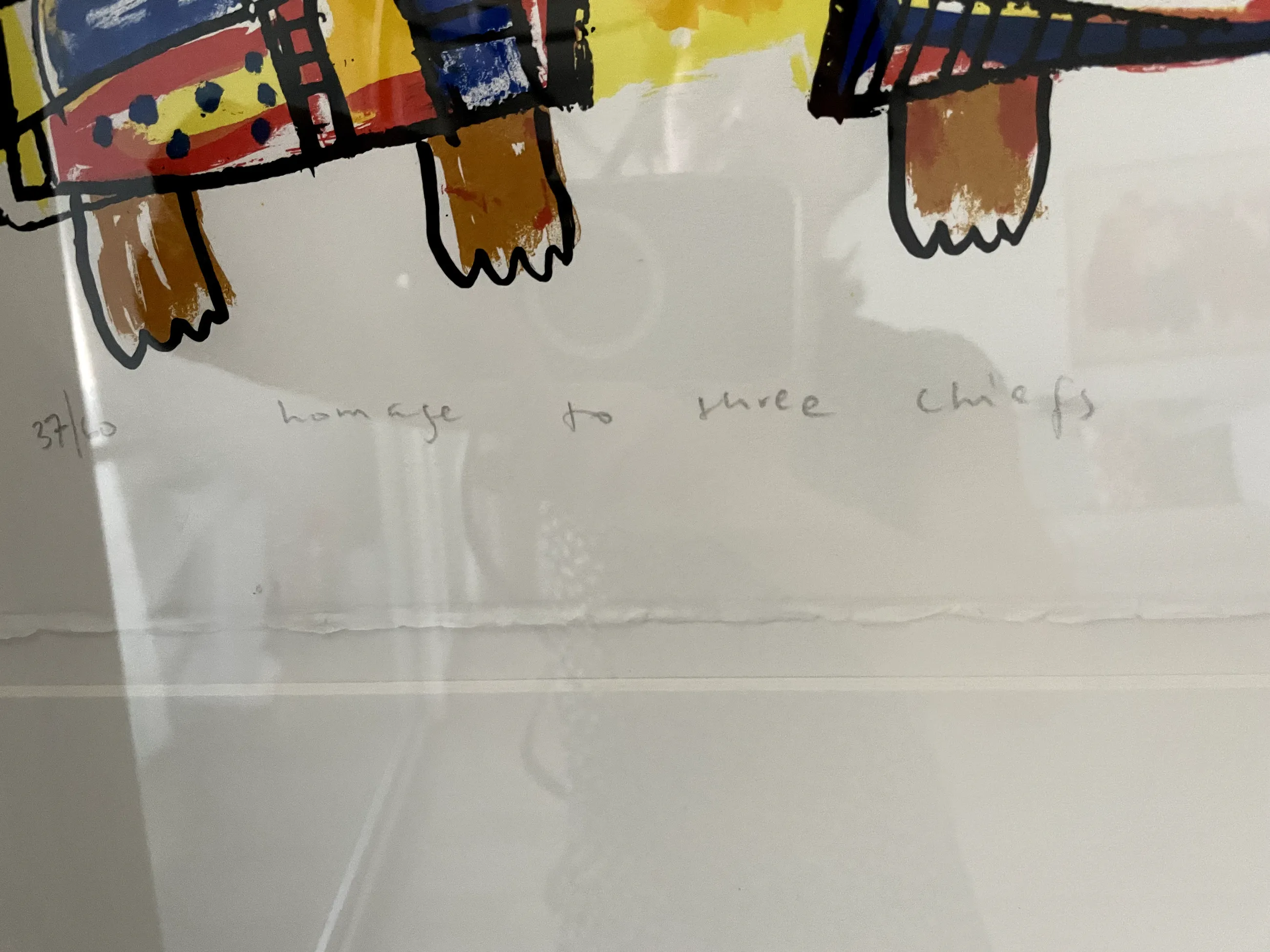 Originele zeefdruk van Toyin Loye, getiteld Hommage to three chiefs, 1997