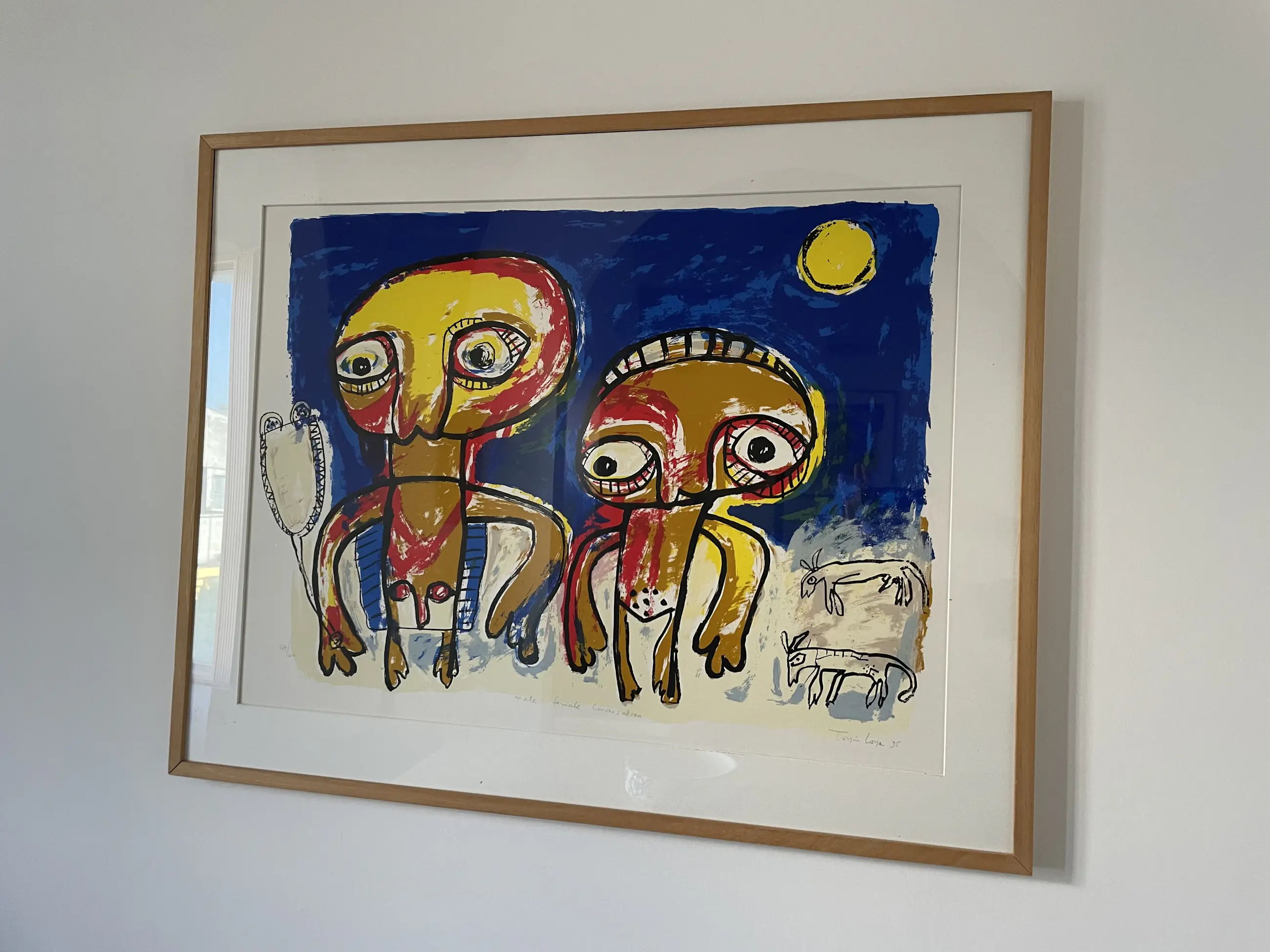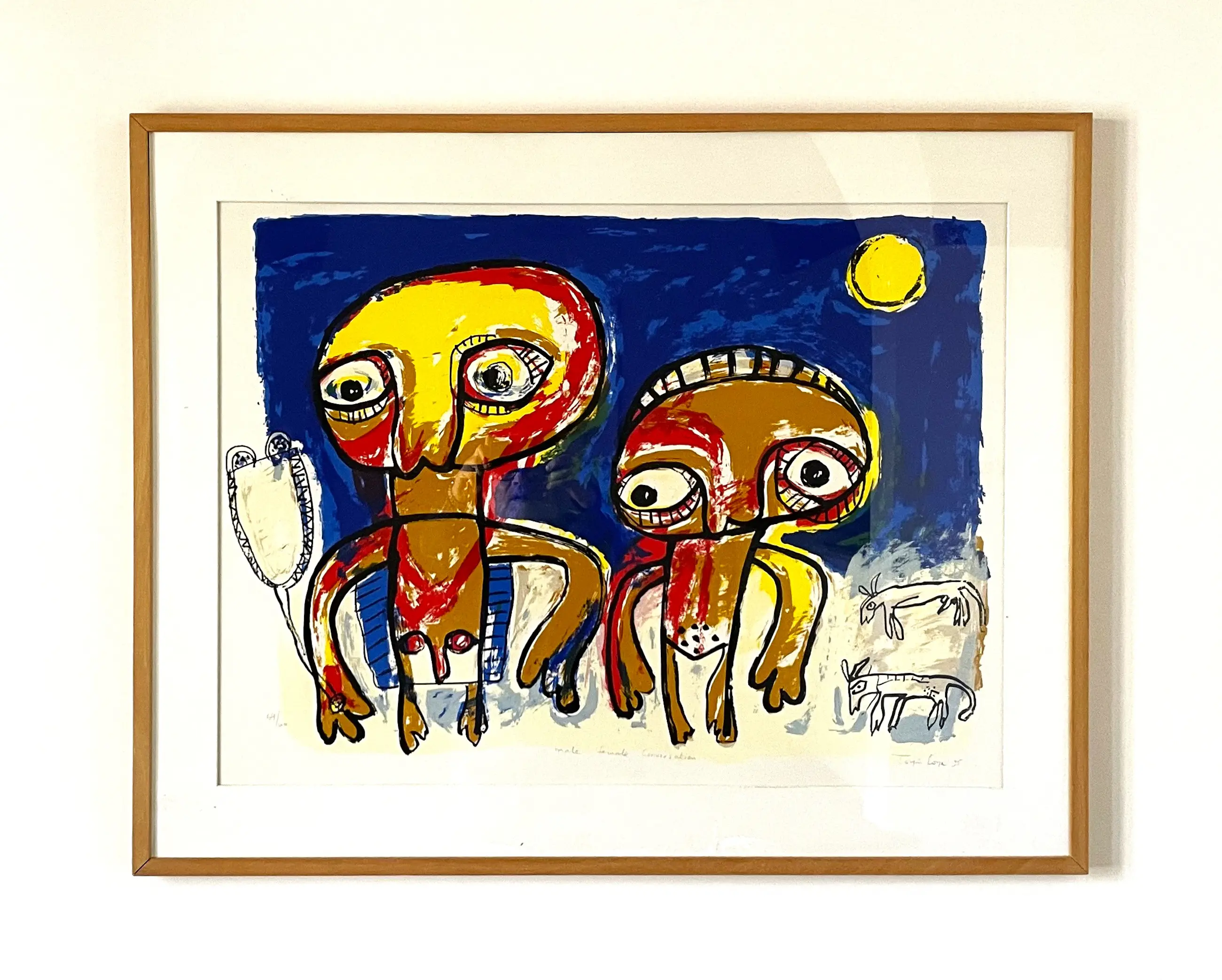Mooie zeefdruk van Toyin Loye. 'Male Female Conversation'. Ingelijst (Barth-lijst) achter glas met passe-partout. Gesigneerd, gedateerd (1995), genummerd en getiteld. Afmetingen 100 x 80 cm.