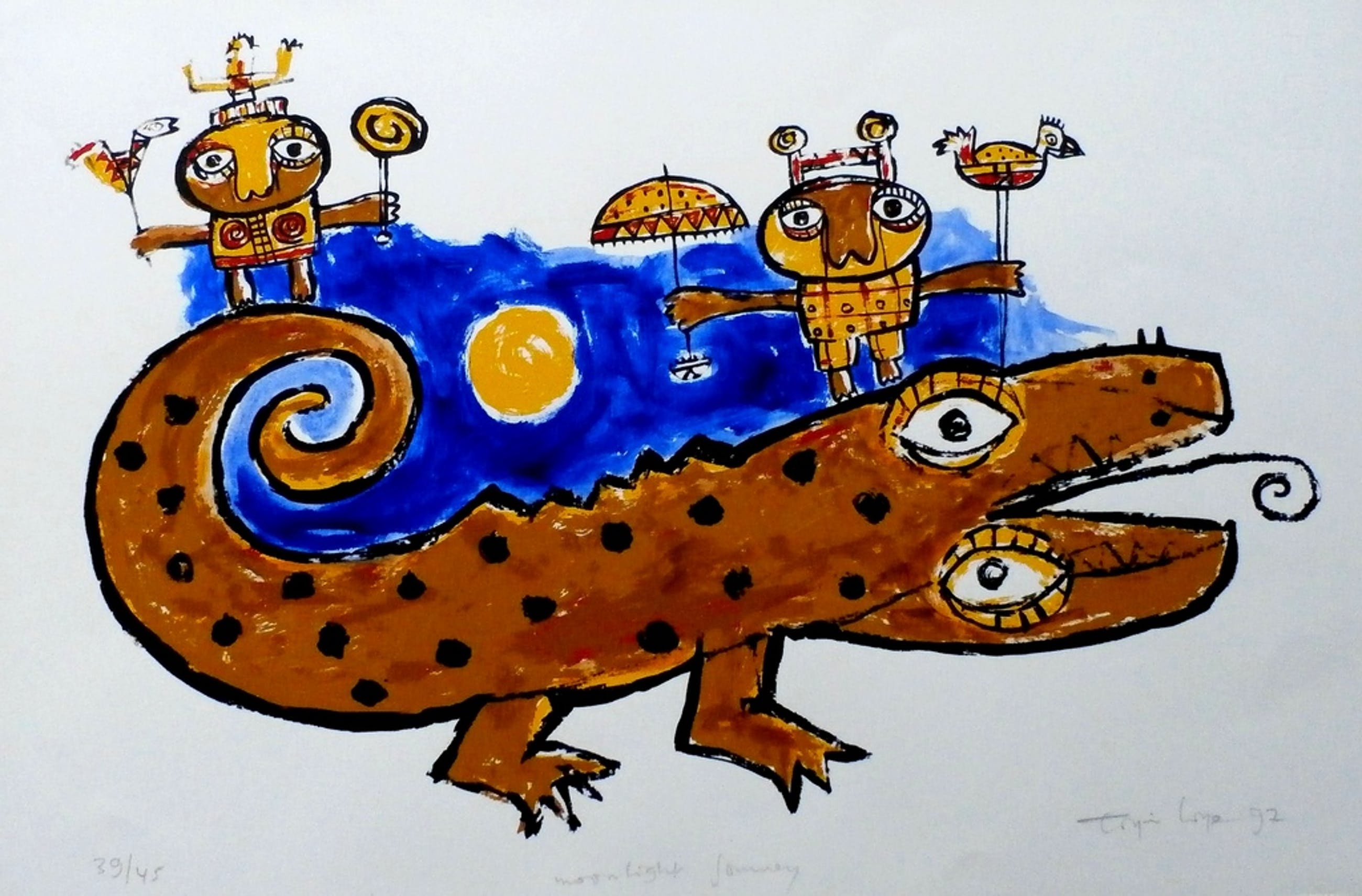 Zeefdruk van Toyin Loye uit 1992. Titel: Moonlight Journey. Nummer:39/45. Afmetingen blad: H40 x b57 cm. Rechtsonder door de kunstenaar gesigneerd met potlood. De authenticiteit van het, aangeboden, werk wordt voor 100% gegarandeerd. Herkomst: collectie ABN AMRO.