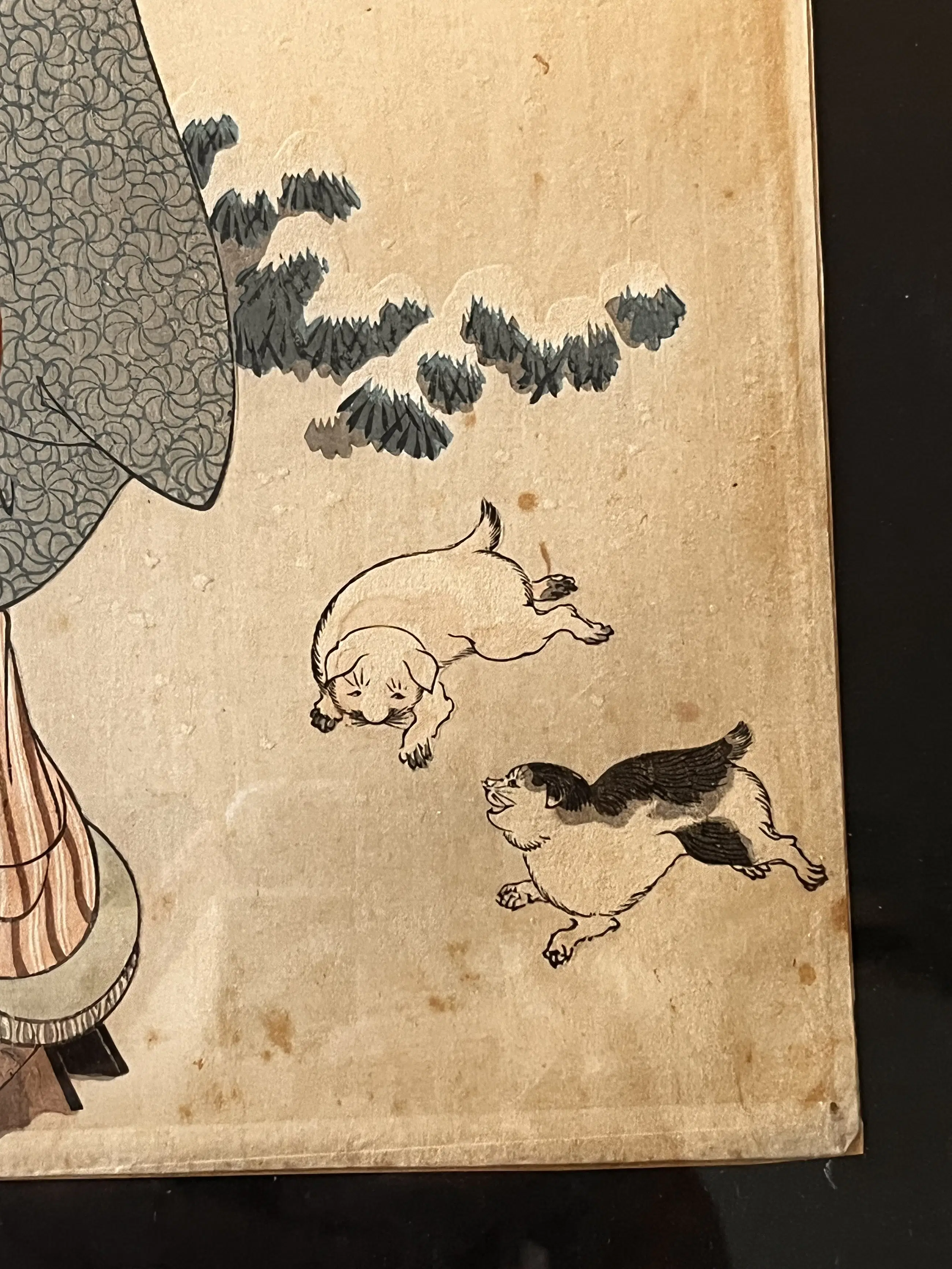 Prachtige prent van Toyohara Chikanobu; beter bekend als Yoshu Chikanobu uit 1898. Dit is een voorstelling die door mij niet snel terug te brengen was op Chikanobu, maar gelukkig bood ukiyo-e.org uitkomst (kijk maar op https://ukiyo-e.org/image/japancoll/p375-chikanobu-snowy-garden-9488 )