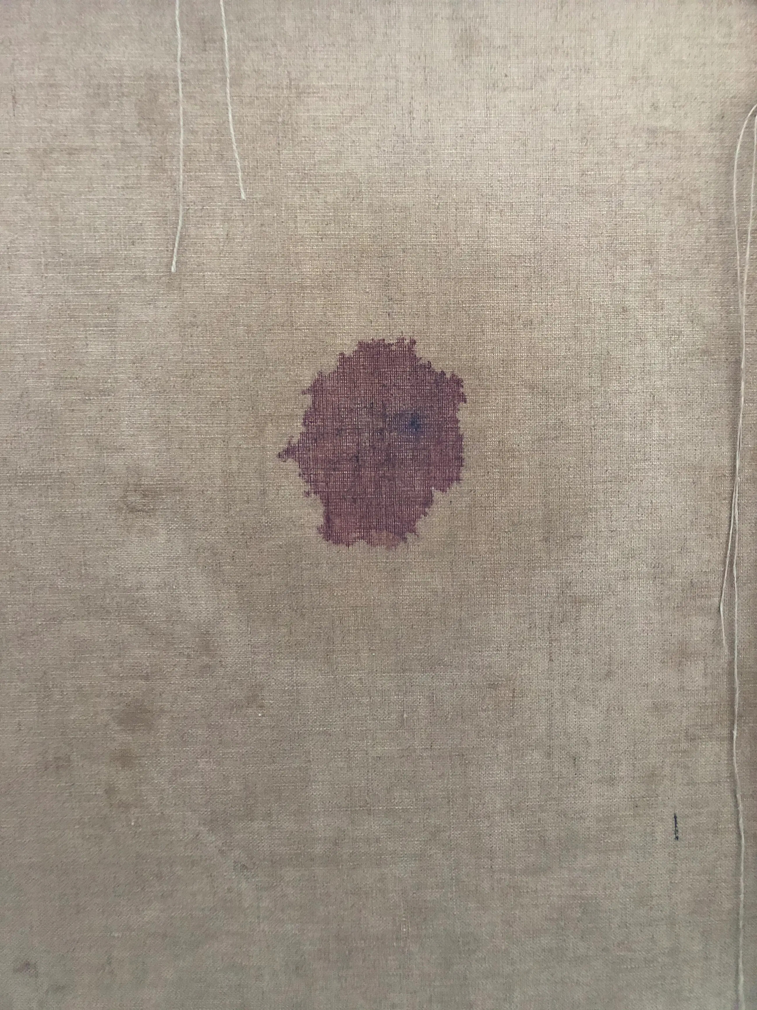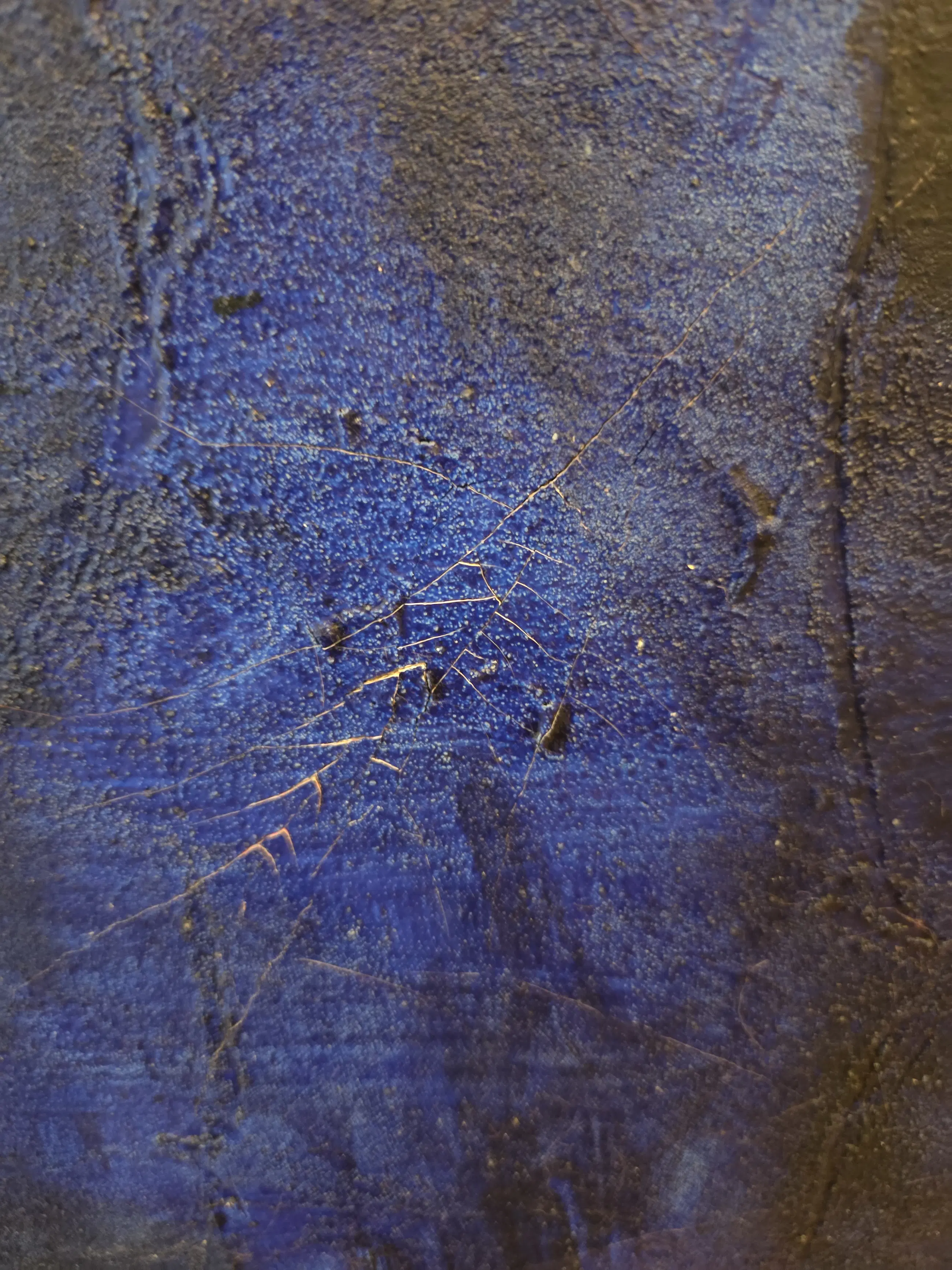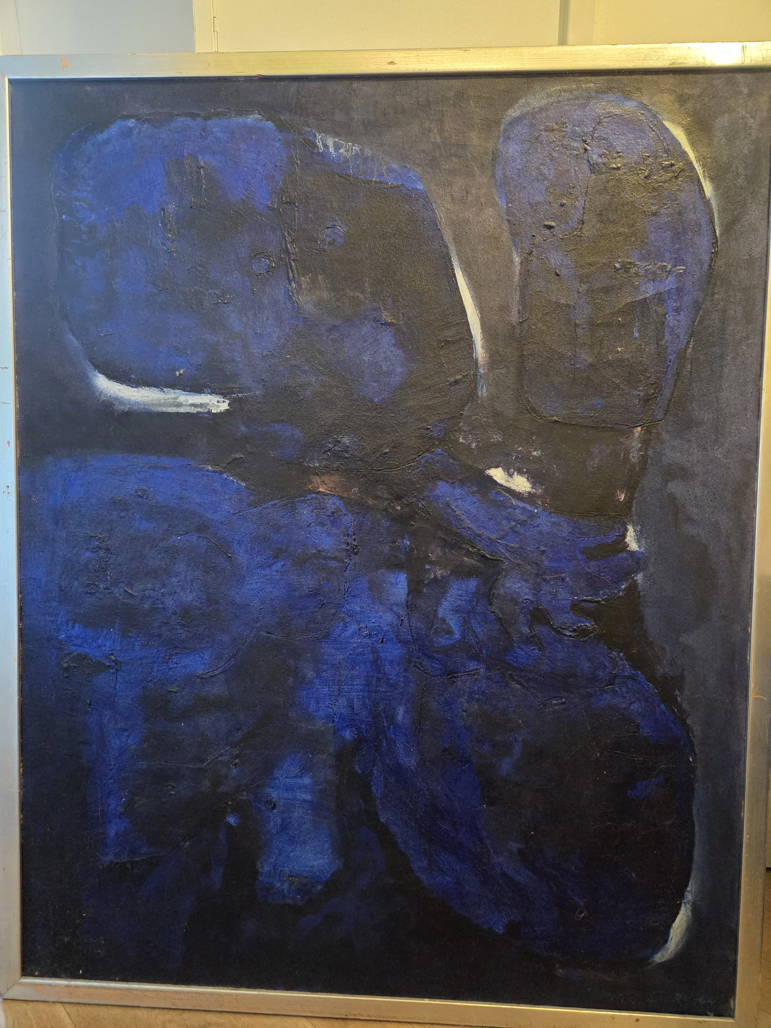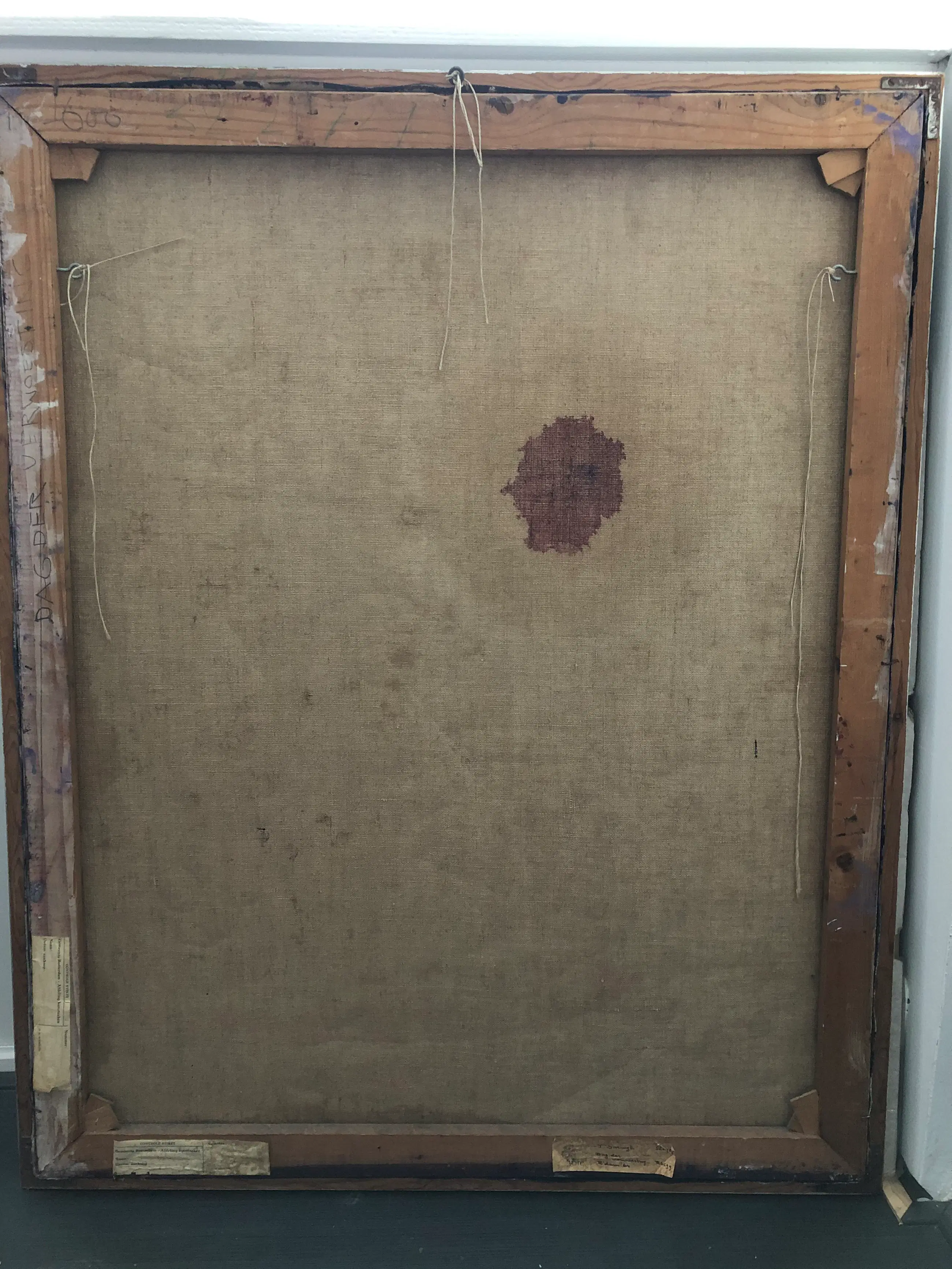 Zie foto's, vlek op achterkant en stukje gebarsten olieverf