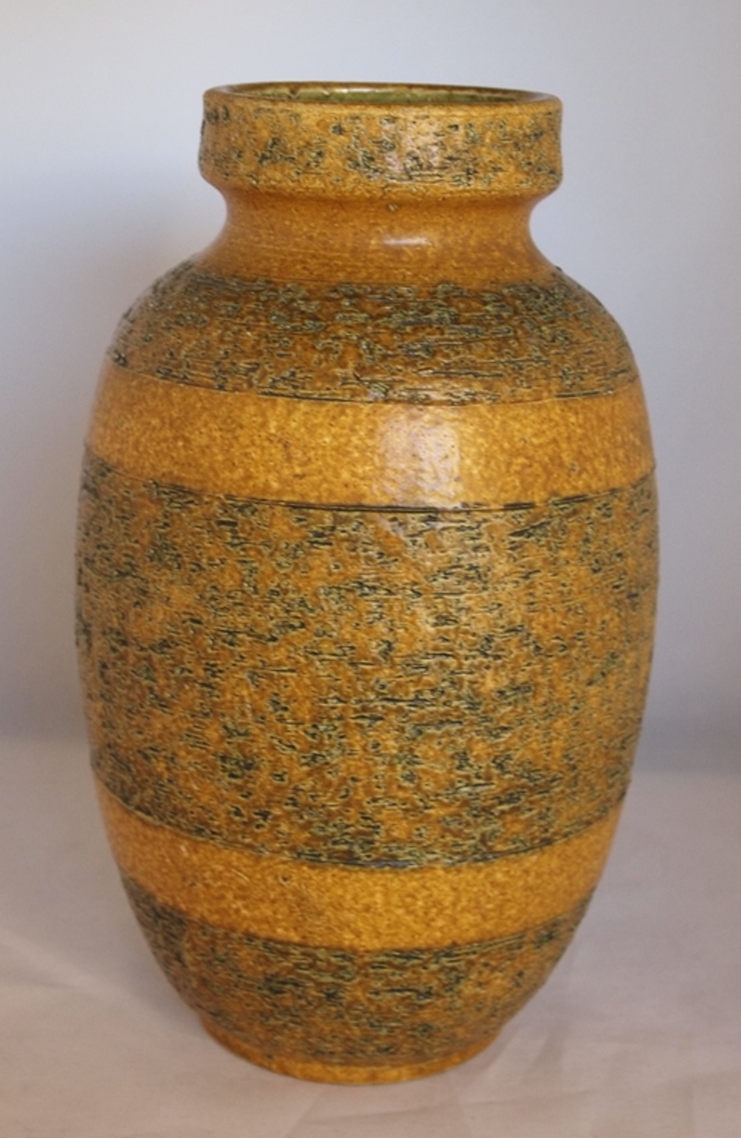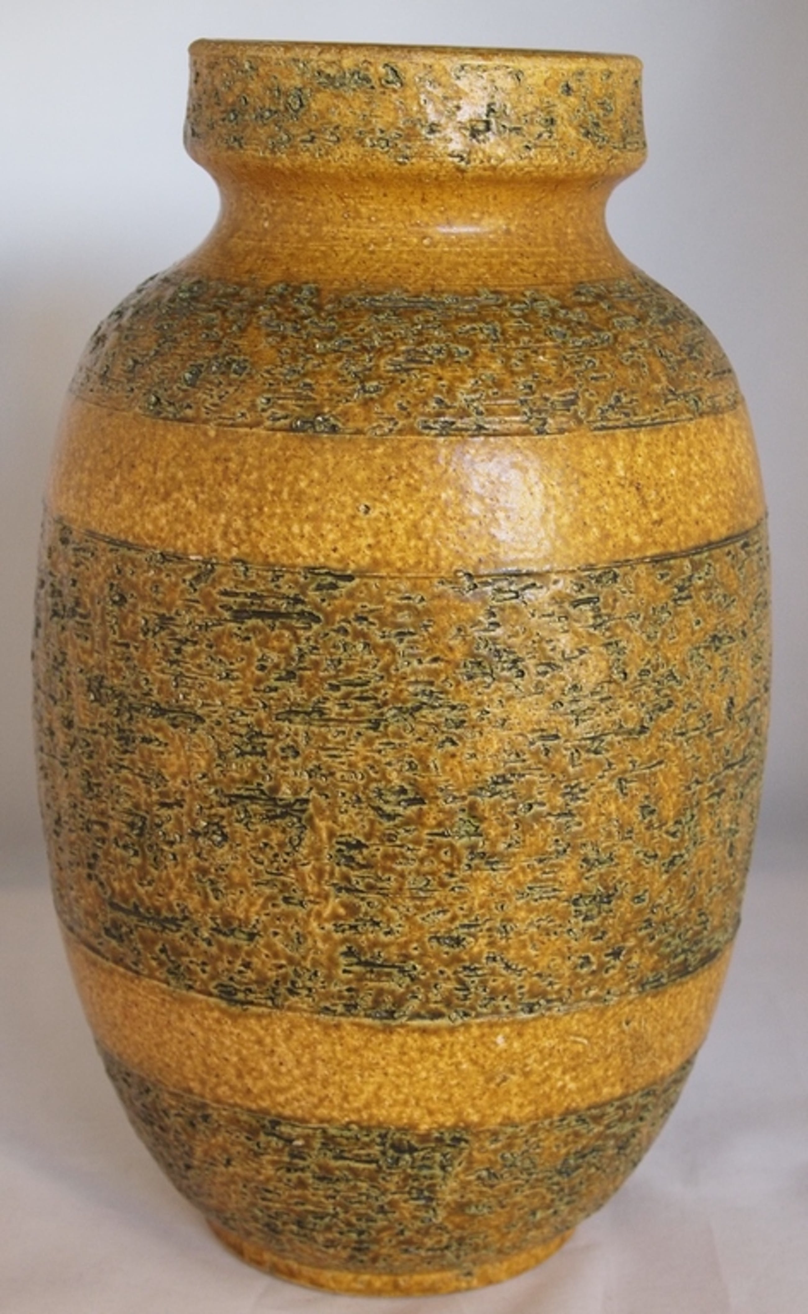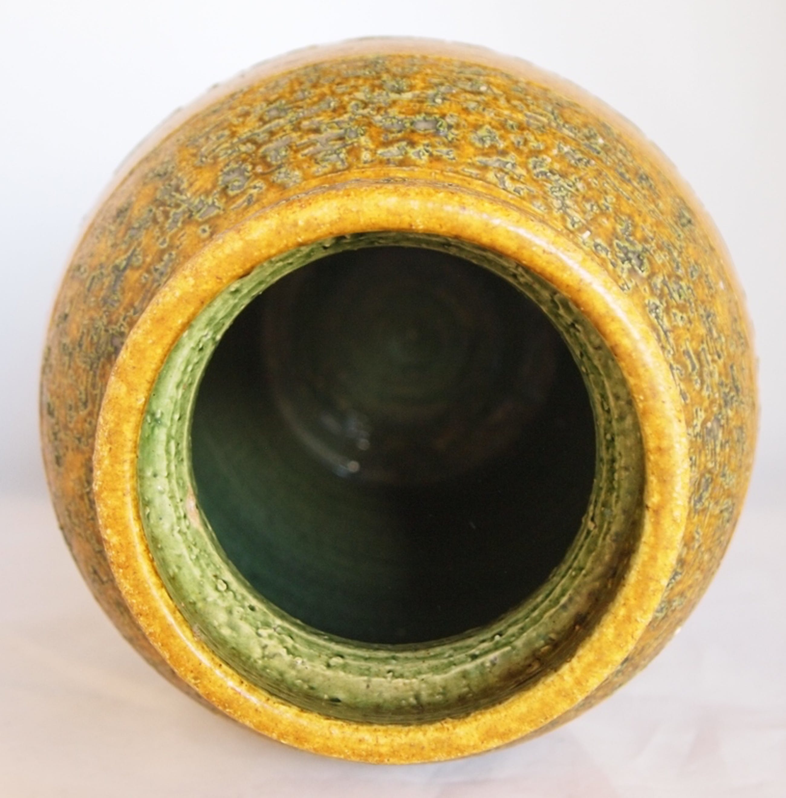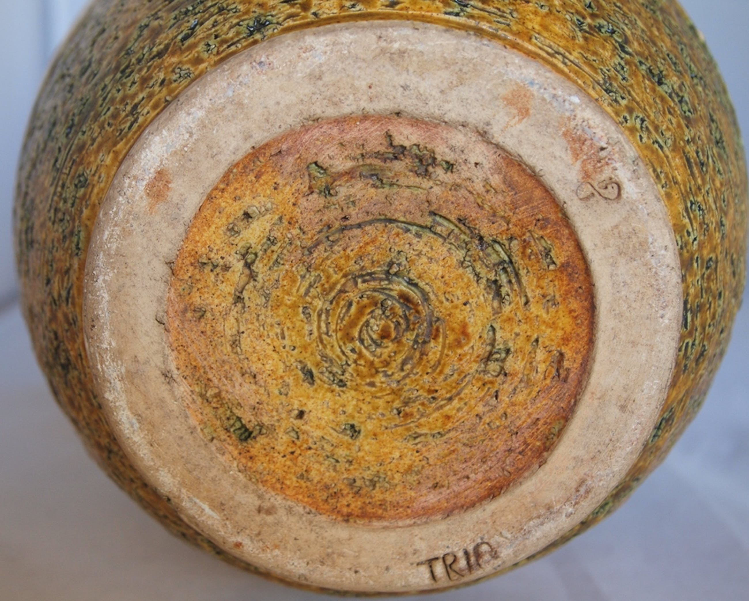 Mooie grote chamotte aardewerken van potterie TRIO uit Reuver. Modelnummer 8. De vaas is mat geglazuurd in mosterdgeel en olijfgroen, typische kleuren voor die tijd. In prima onbeschadigde conditie. Aan de onderzijde voorzien van een ingedrukt merk en modelnummer.