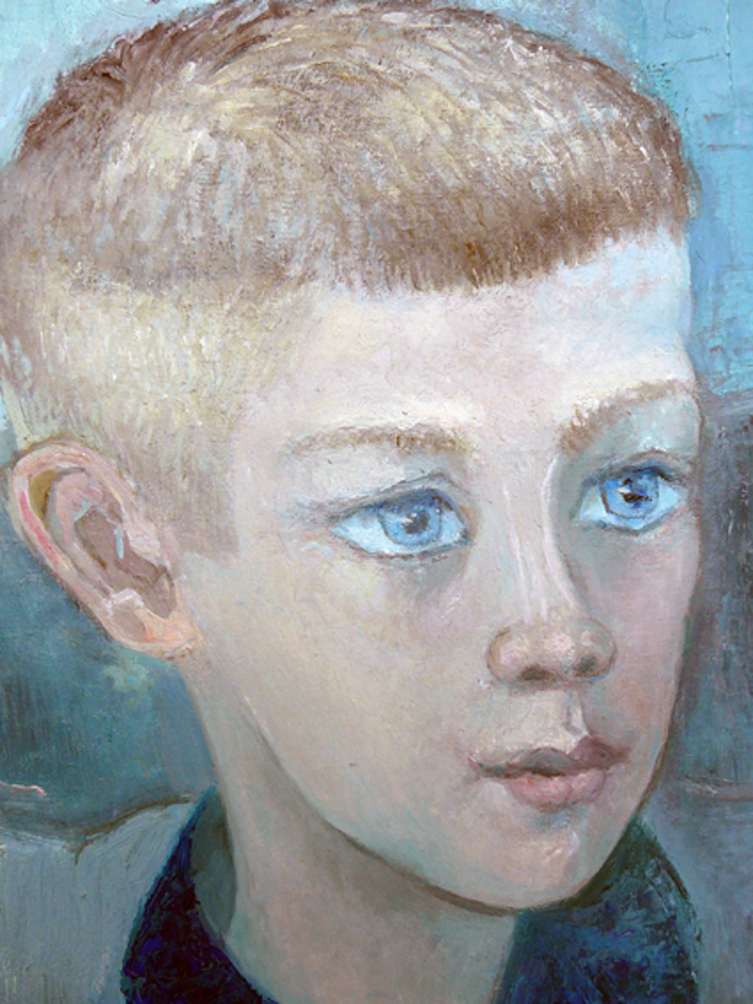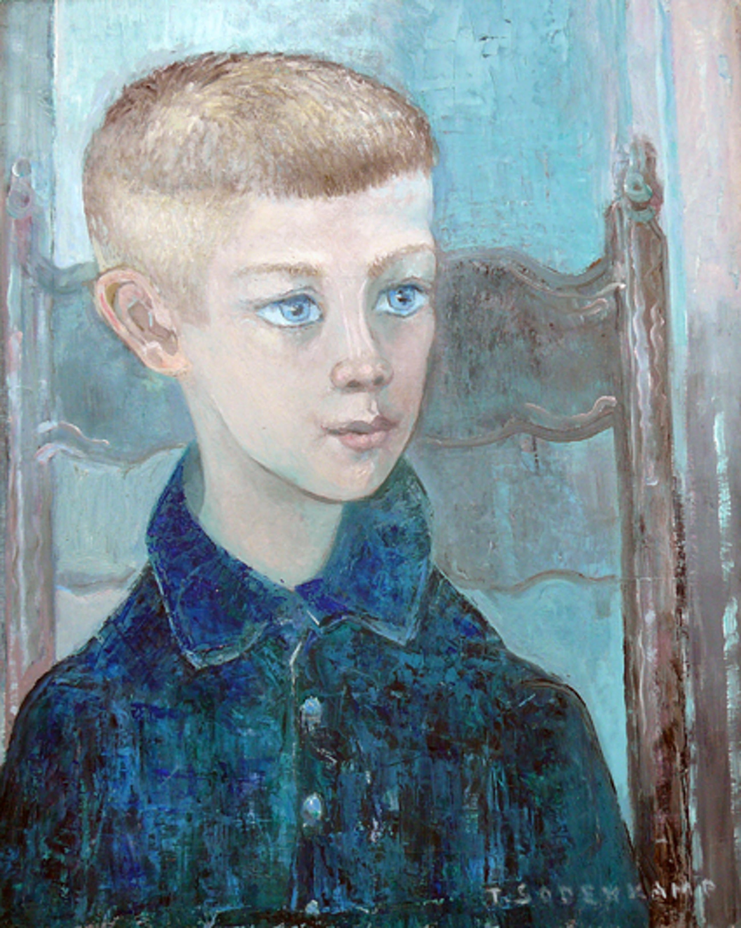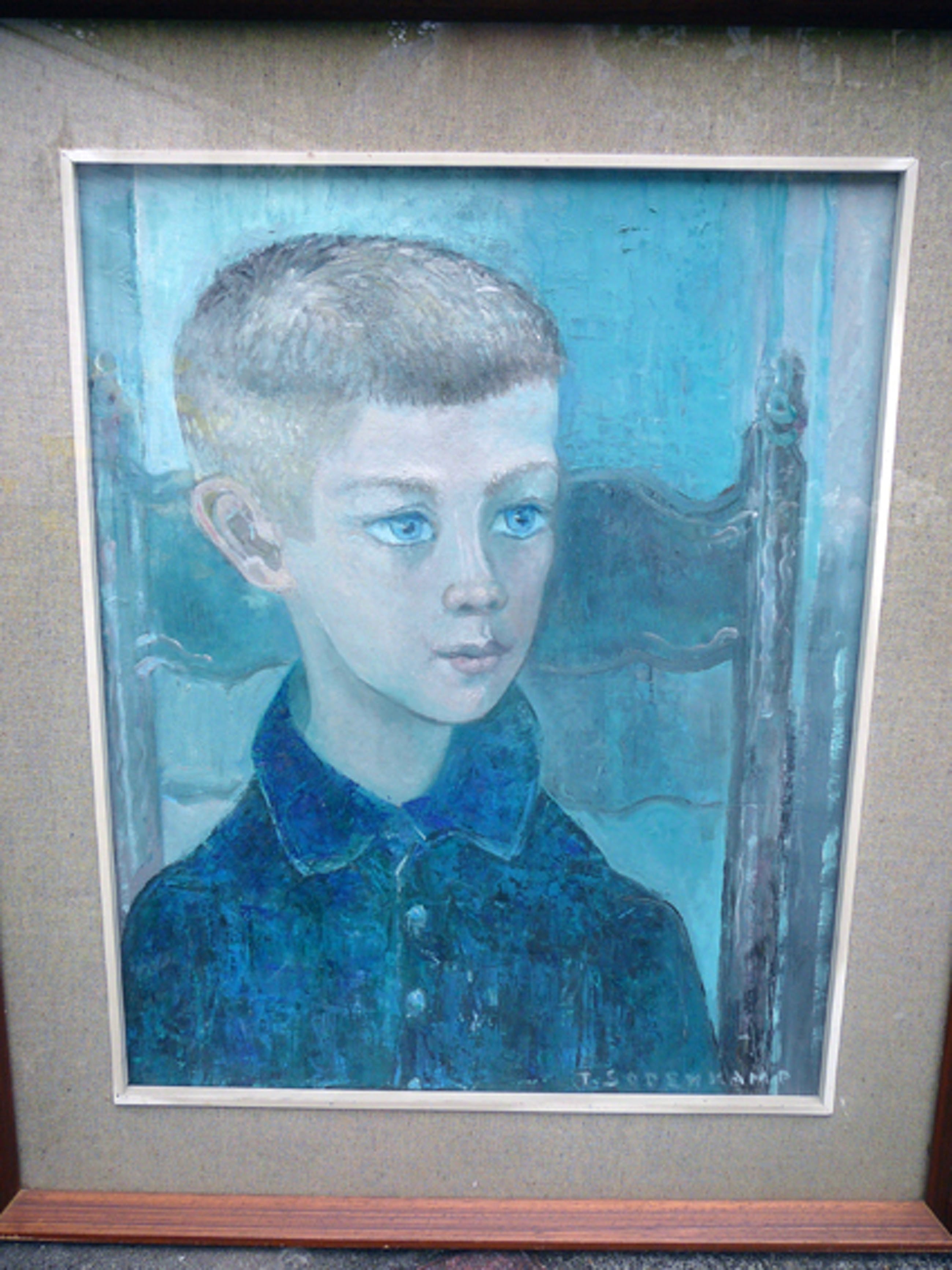 Indringend en ontroerend portret van de hand van Geertruida Antonia Sodenkamp (1916). Achter glas in originele houten baklijst. De datering is vermoedelijk circa 1960. Vanwege gewicht, omvang en kwetsbaarheid kan het werk alleen worden afgehaald of bezorgen in overleg.