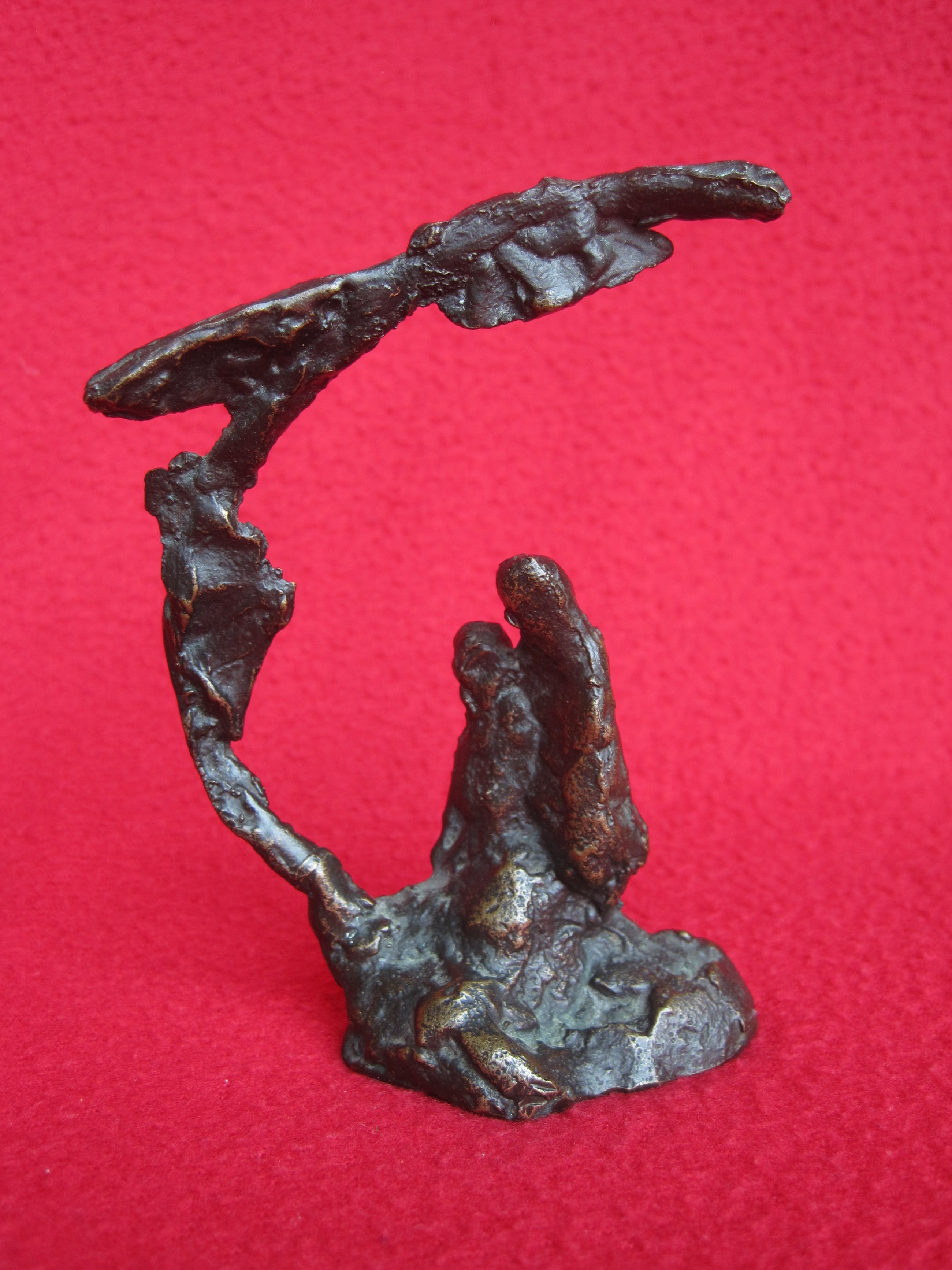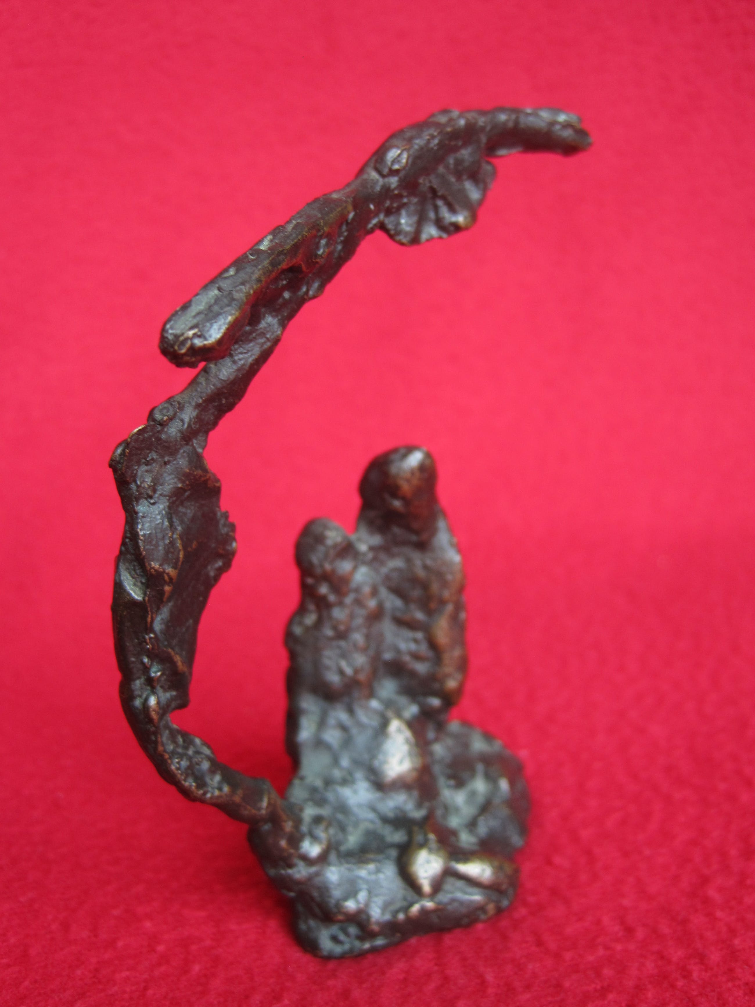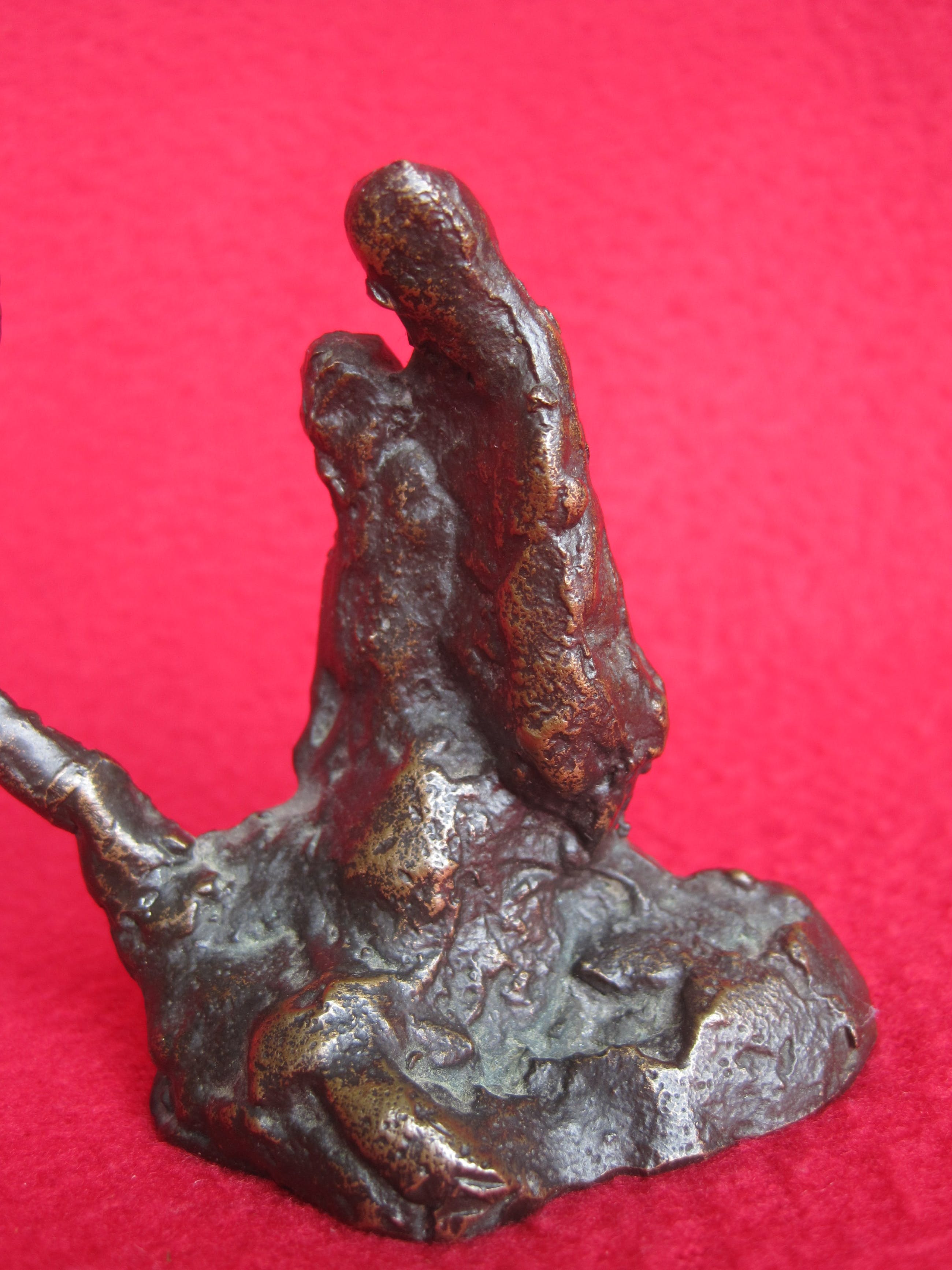 Prachtig verstild beeldje door Truus Menger( 1923-2016 ). Gemaakt van brons. Ik zie er twee personen in onder een boom. Het heeft dezelfde sfeer als van een Japanse houtdruk, zoals een of twee personen onder een volle maan. Gesigneerd achterkant TM.