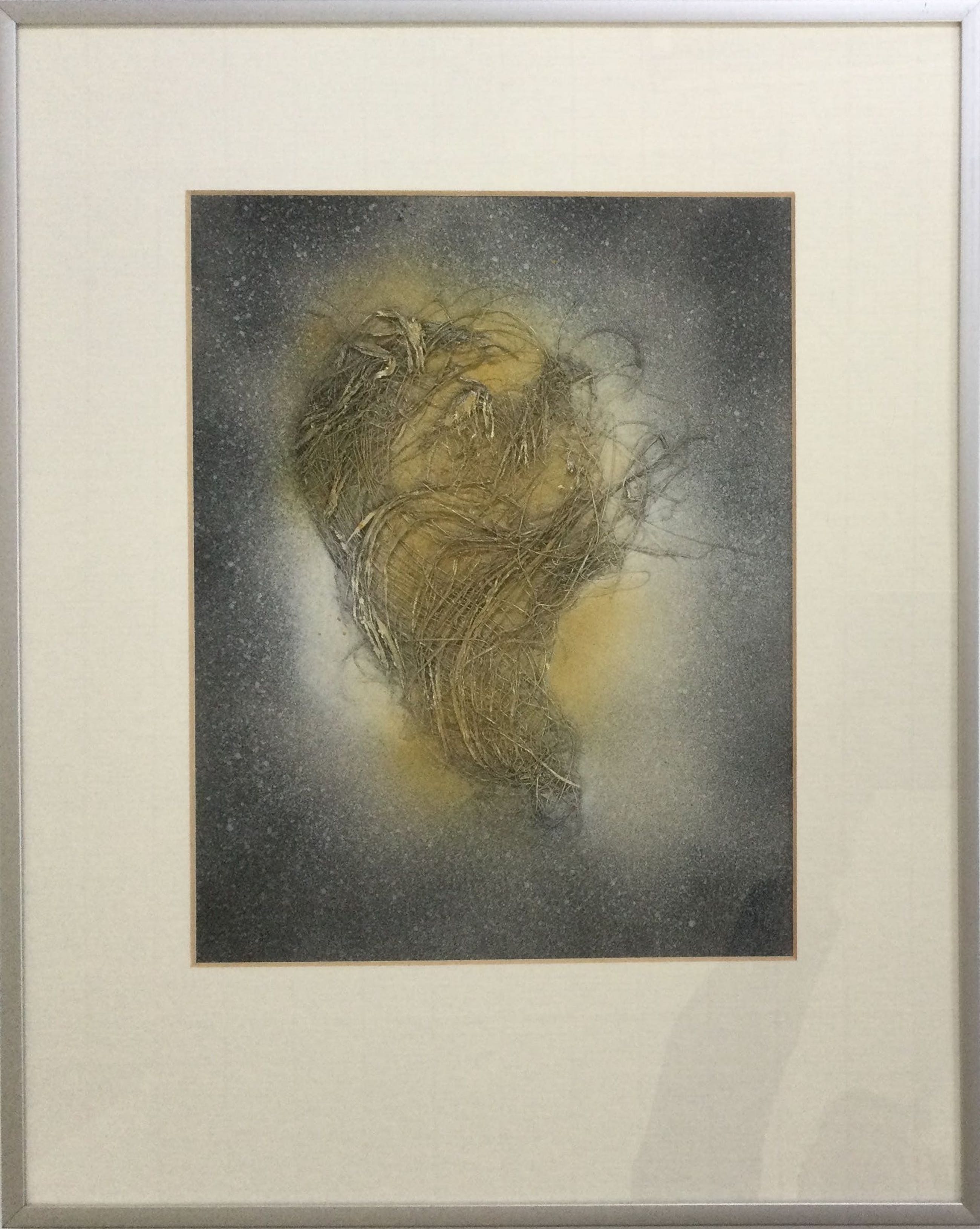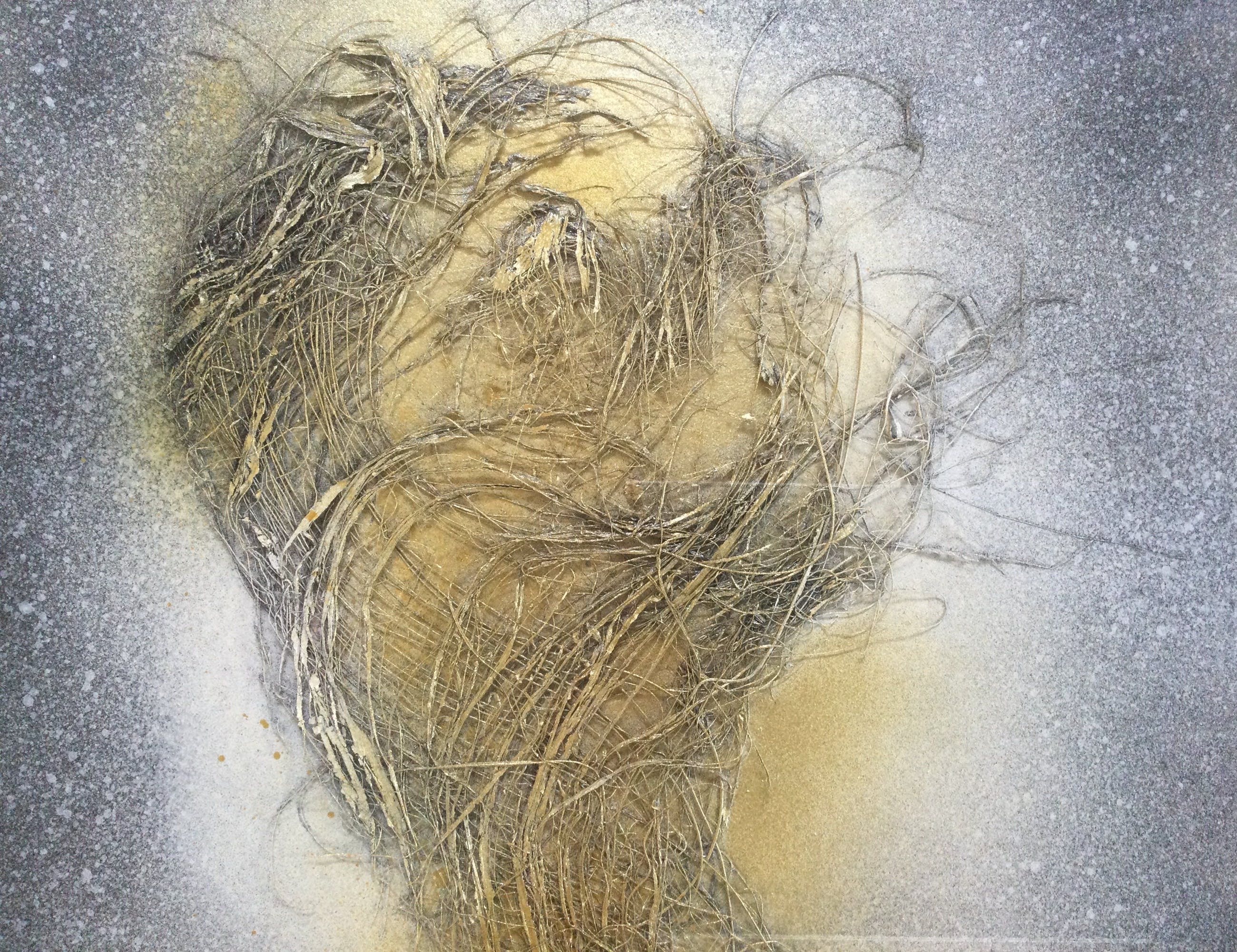 Dit werk bestaat uit een (met spuitbus?) beschilderd stuk karton waarop plukken gras of hooi zijn geassembleerd, in de gedaante van een vlam(?). Het natuurlijke materiaal is conserverend behandeld en met dezelfde zilver- en goudkleurige verf bewerkt.