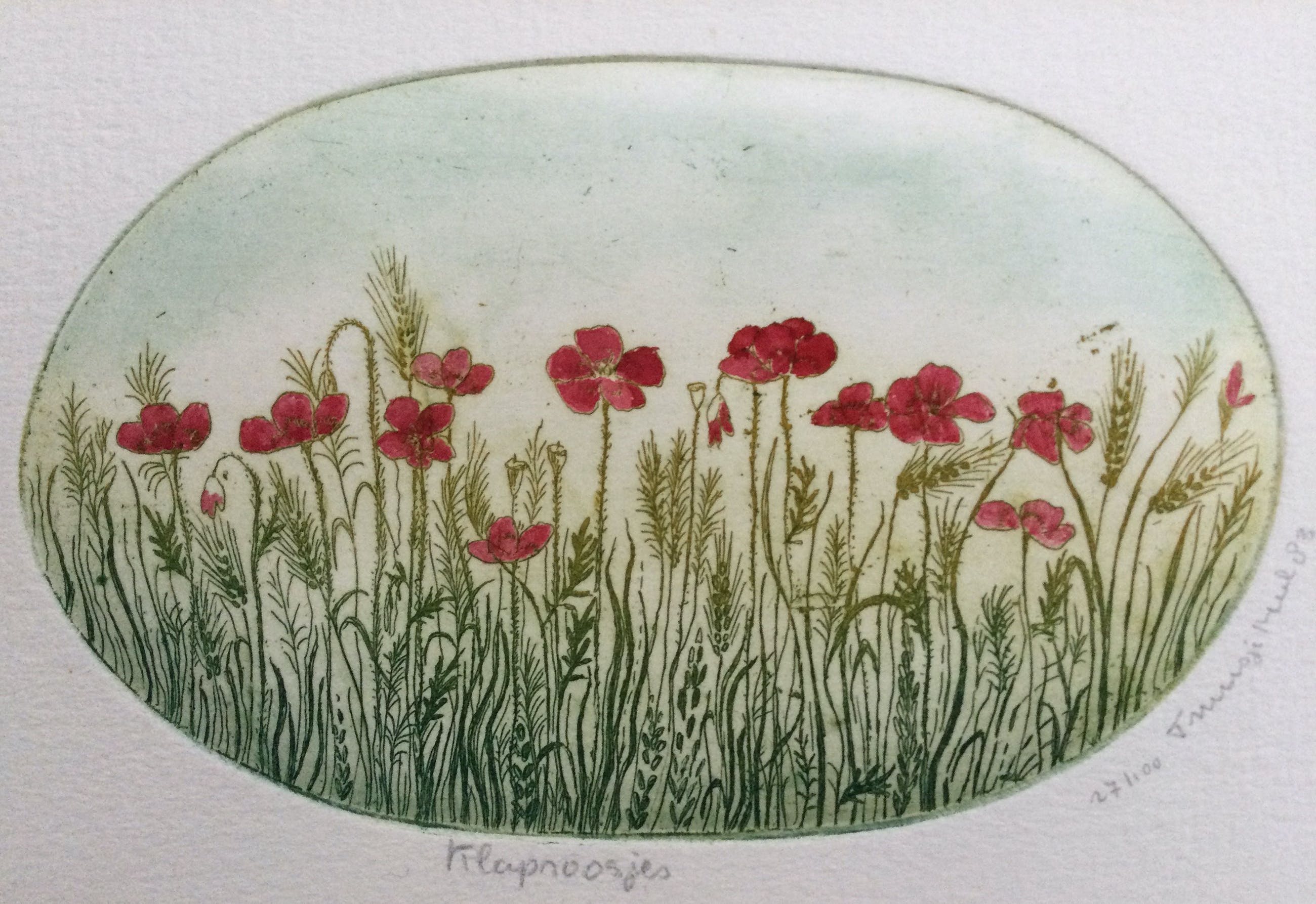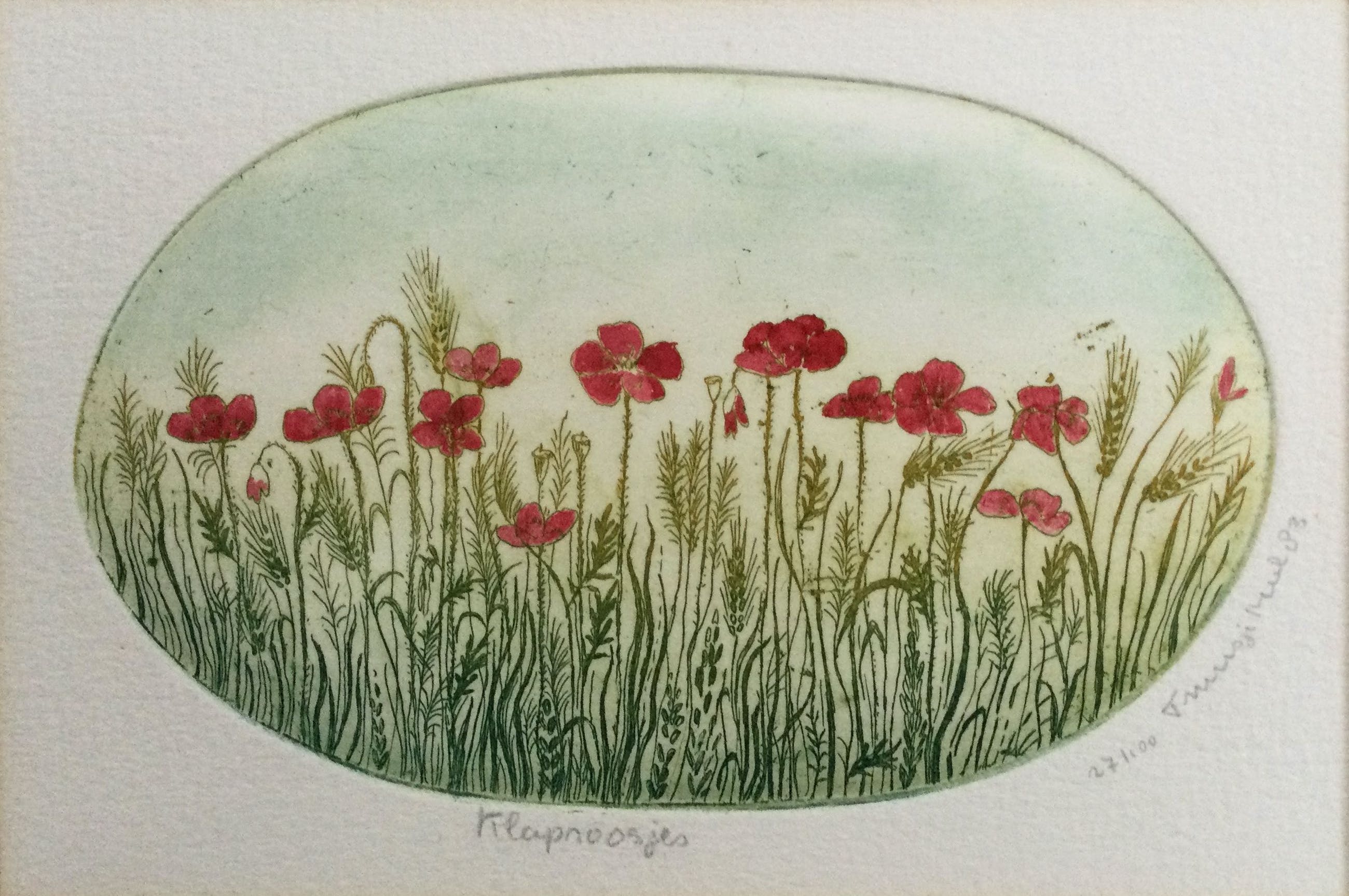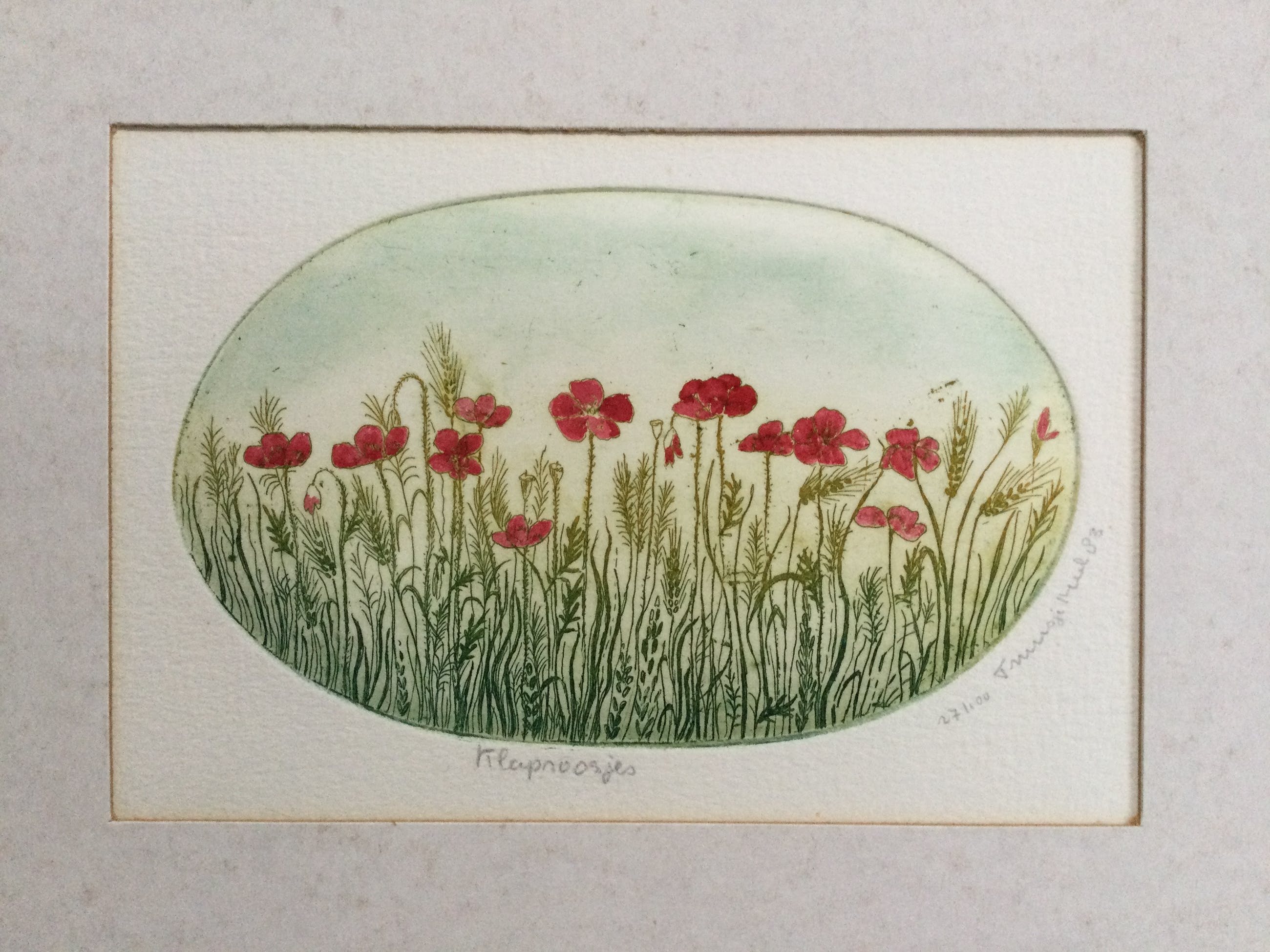 Truusje Mul (1950) heeft zich gespecialiseerd in kleine etsen die op geraffineerde wijze met de hand zijn ingekleurd, veelal met lieflijke afbeeldingen van dieren en planten. Deze ets is ovaal van vorm, draagt de titel 'klaproosjes' en is zeer gedetailleerd en verfijnd. Oplage: 27 van 100 Jaar: 1983 Met de hand (potlood) gesigneerd en voorzien van titel en oplagenummer.. In eenvoudige randloze wissellijst waarvan het glas op 2 hoekjes iets beschadigd is. Foto's maken deel uit van de beschrijving.
