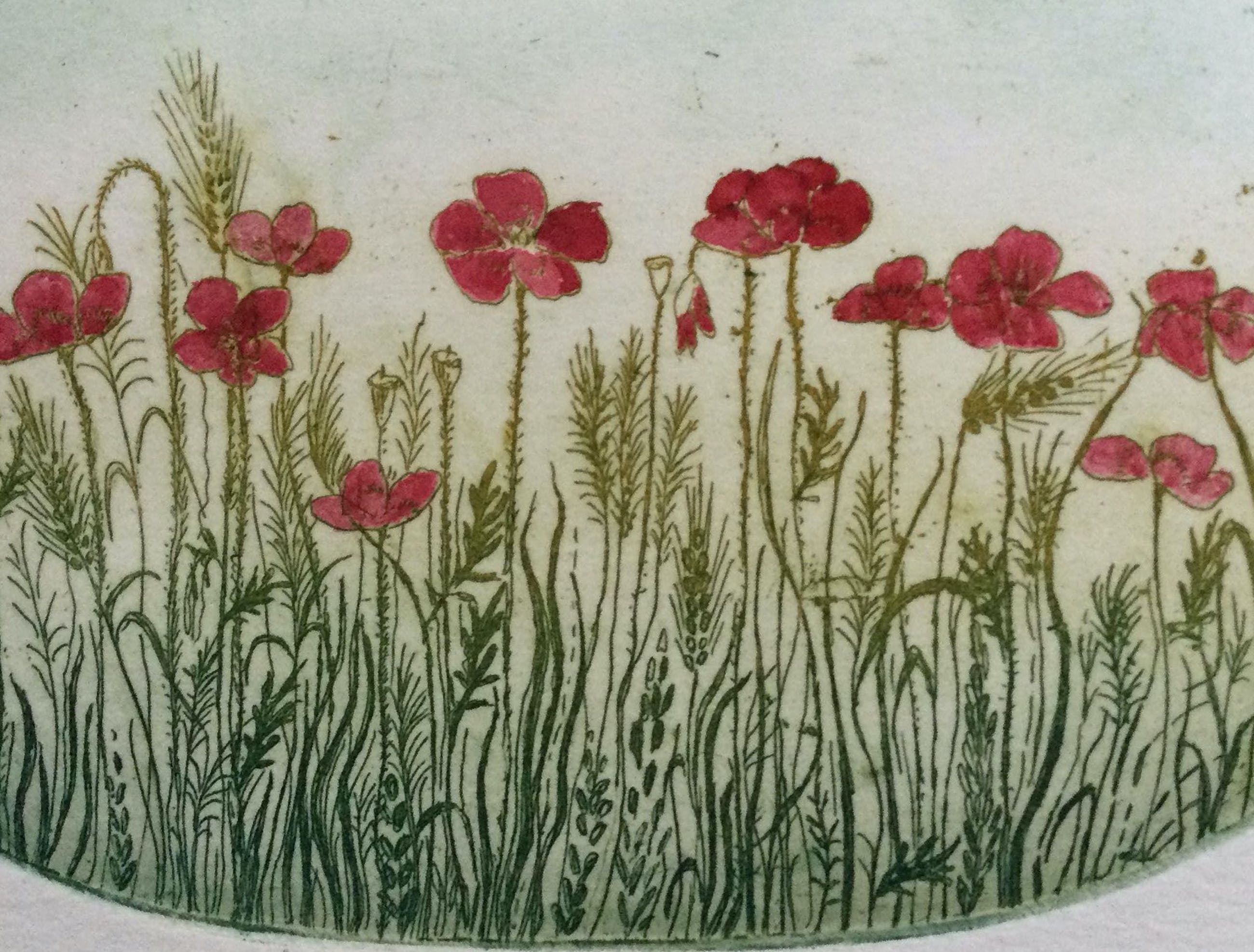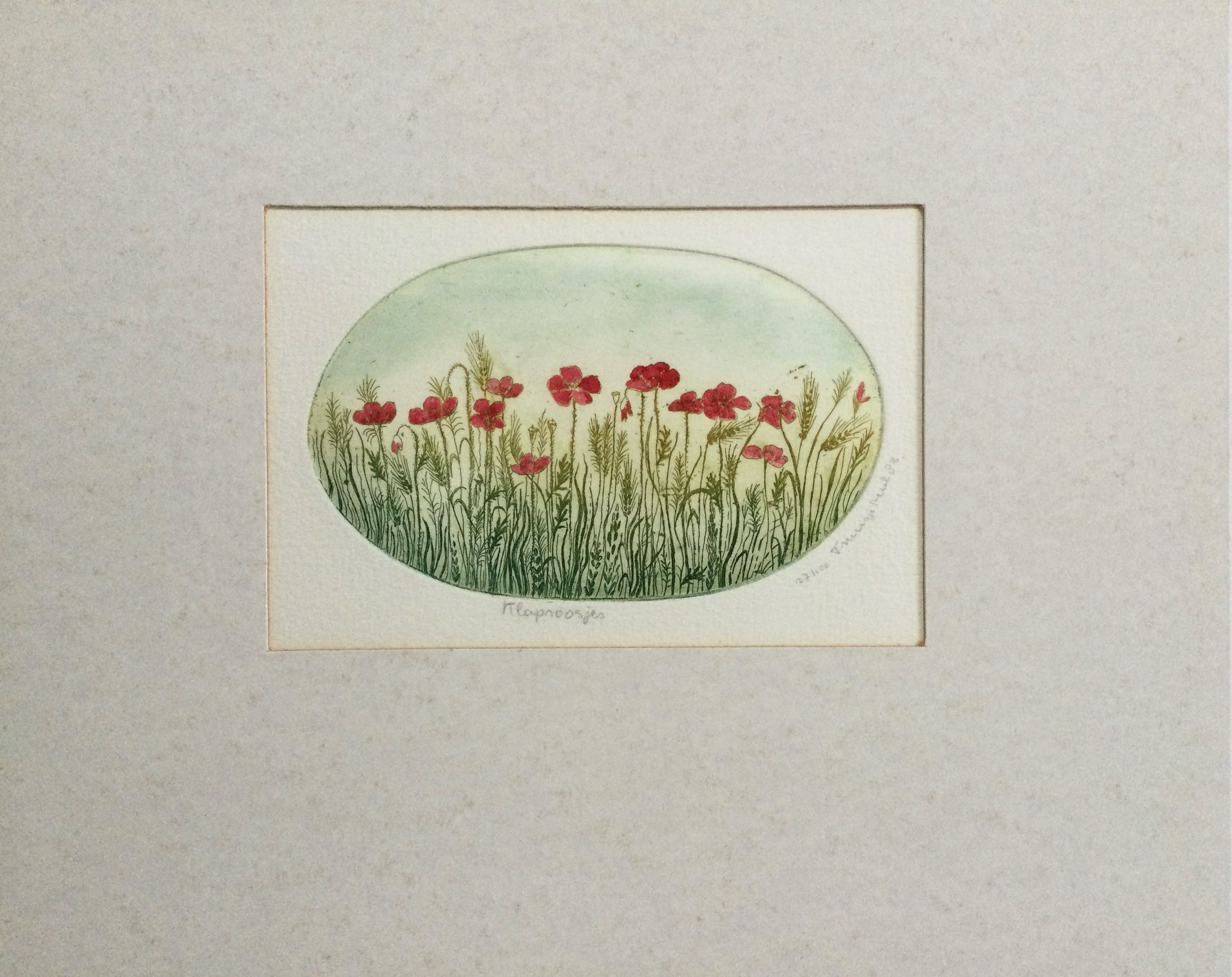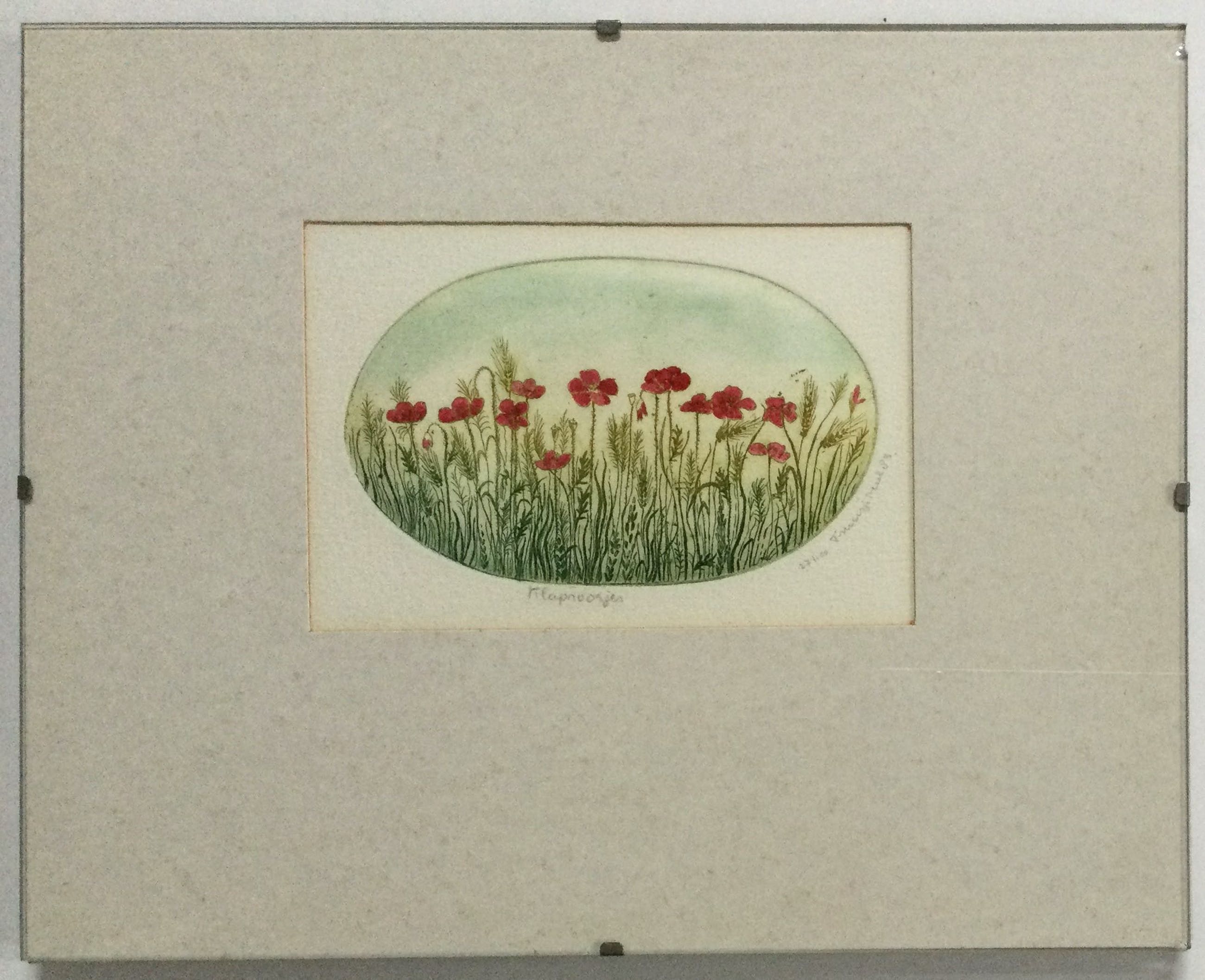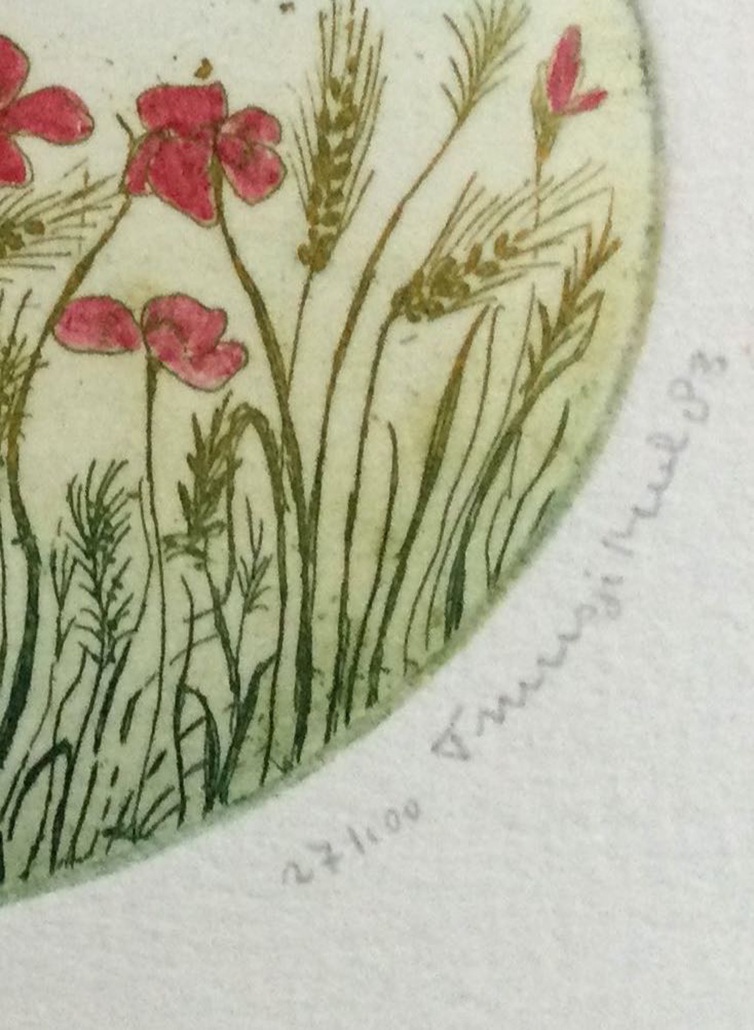 Truusje Mul (1950) heeft zich gespecialiseerd in kleine etsen die op geraffineerde wijze met de hand zijn ingekleurd, veelal met lieflijke afbeeldingen van dieren en planten. Deze ets is ovaal van vorm, draagt de titel 'klaproosjes' en is zeer gedetailleerd en verfijnd. Oplage: 27 van 100 Jaar: 1983 Met de hand (potlood) gesigneerd en voorzien van titel en oplagenummer.. In eenvoudige randloze wissellijst waarvan het glas op 2 hoekjes iets beschadigd is. Foto's maken deel uit van de beschrijving.