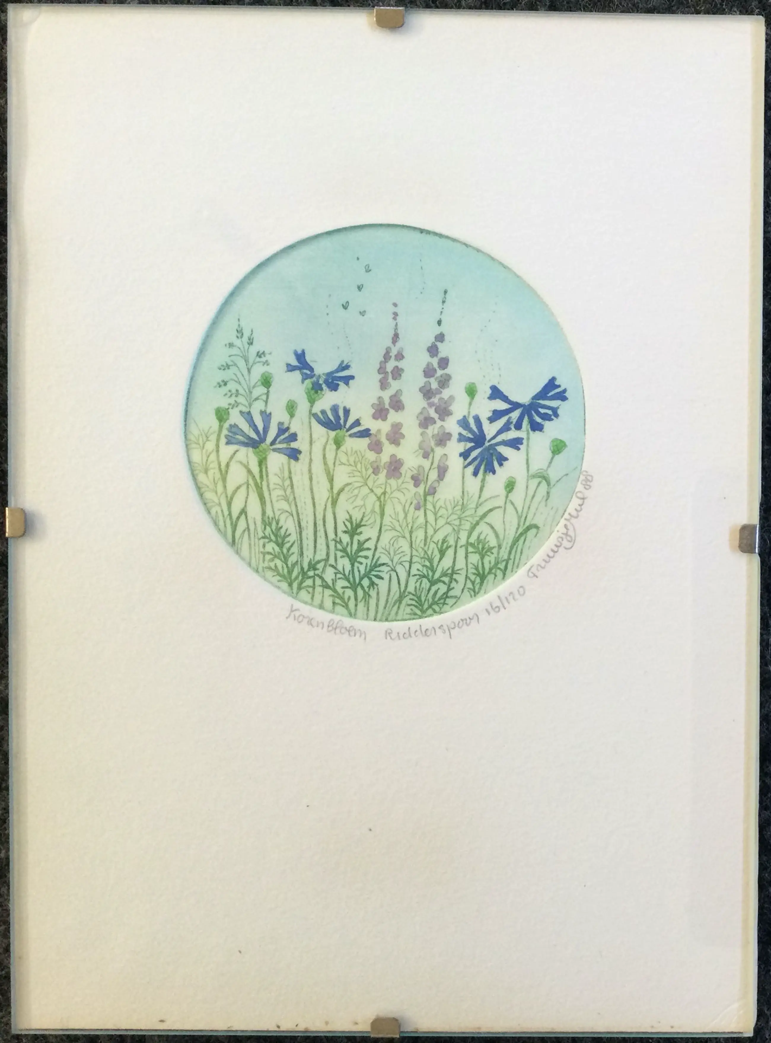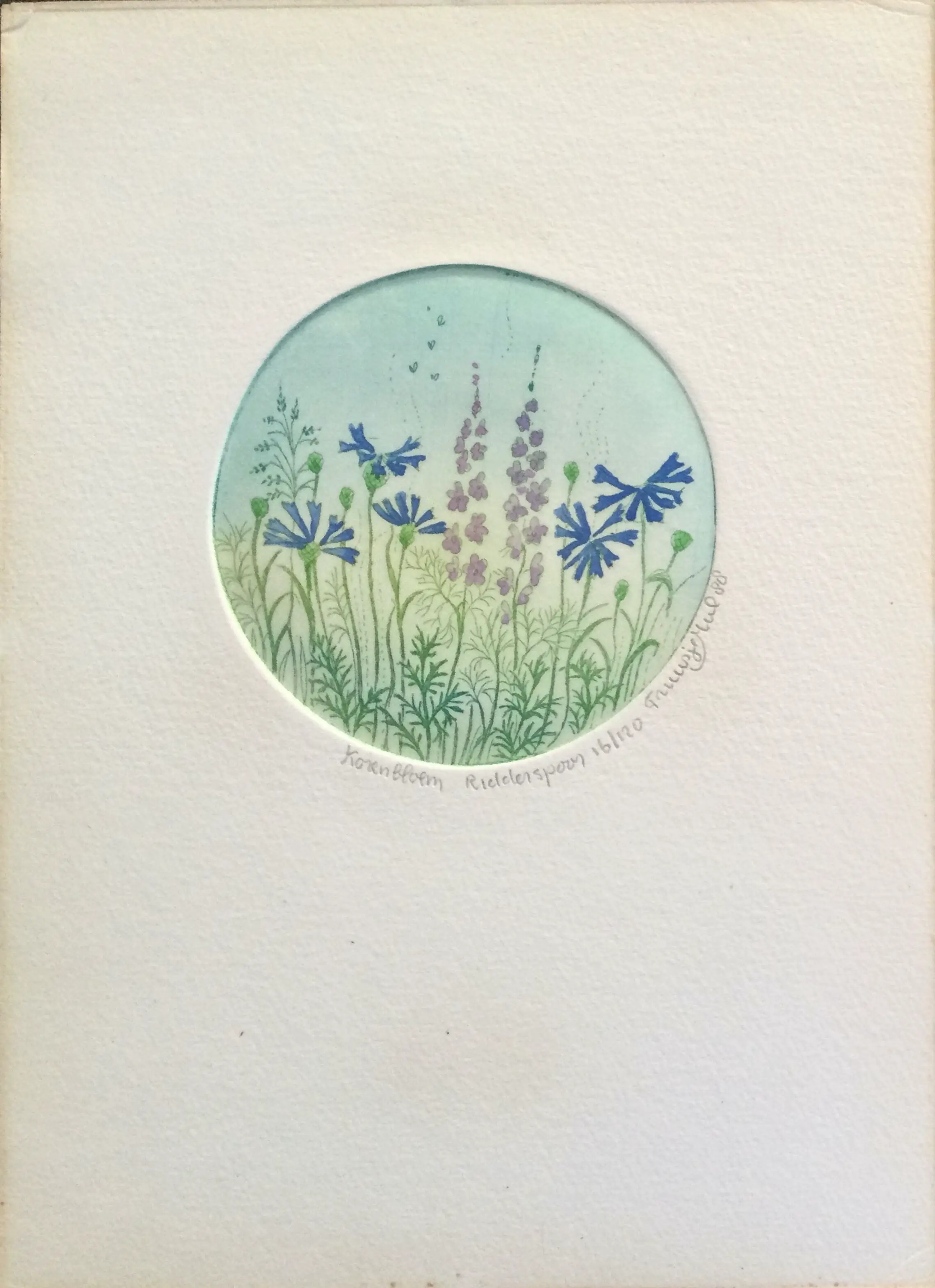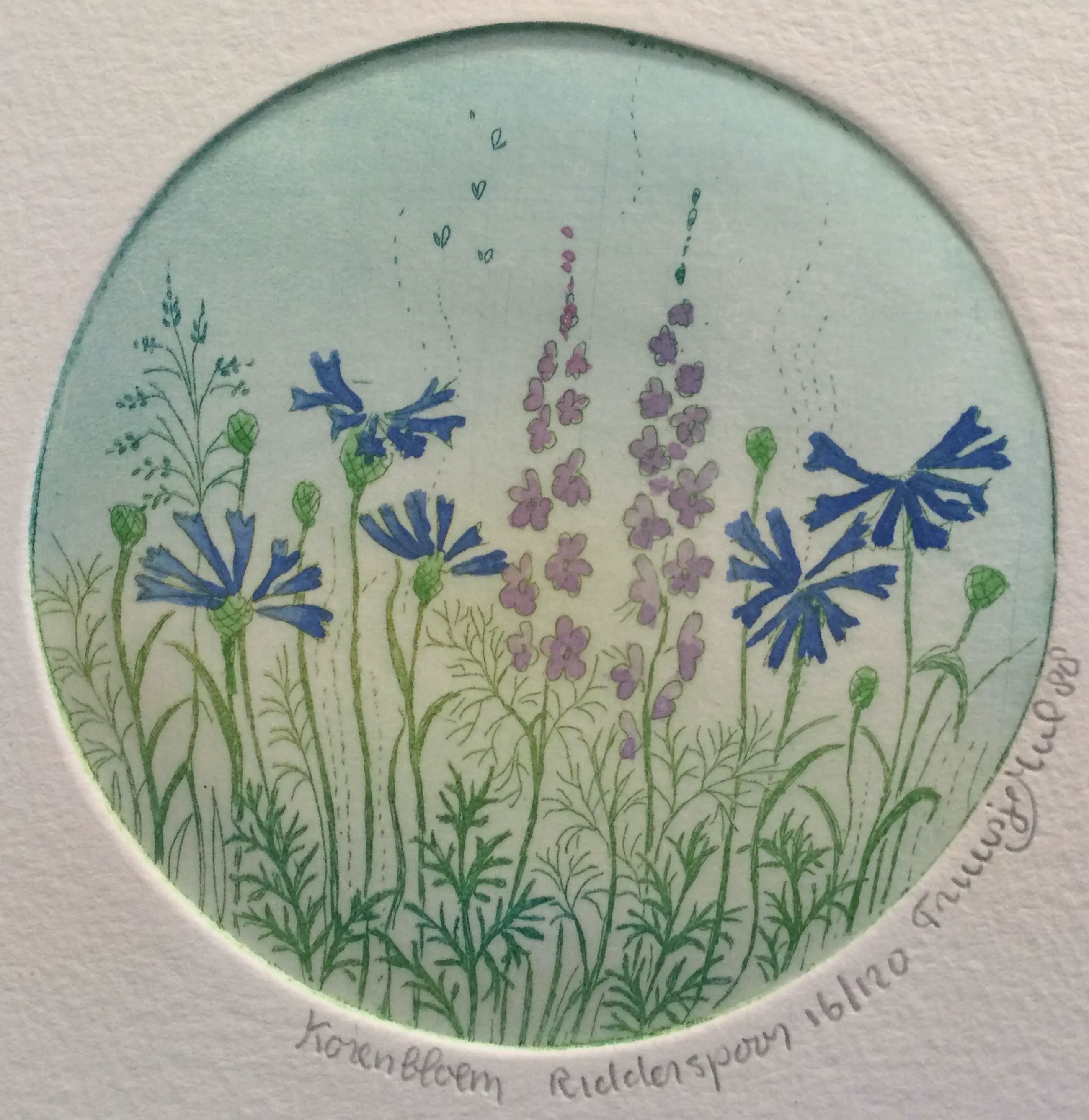 Deze ets is rond van vorm (diameter 7 cm), draagt de titel 'Korenbloem Ridderspoor' en is zeer gedetailleerd en verfijnd.
