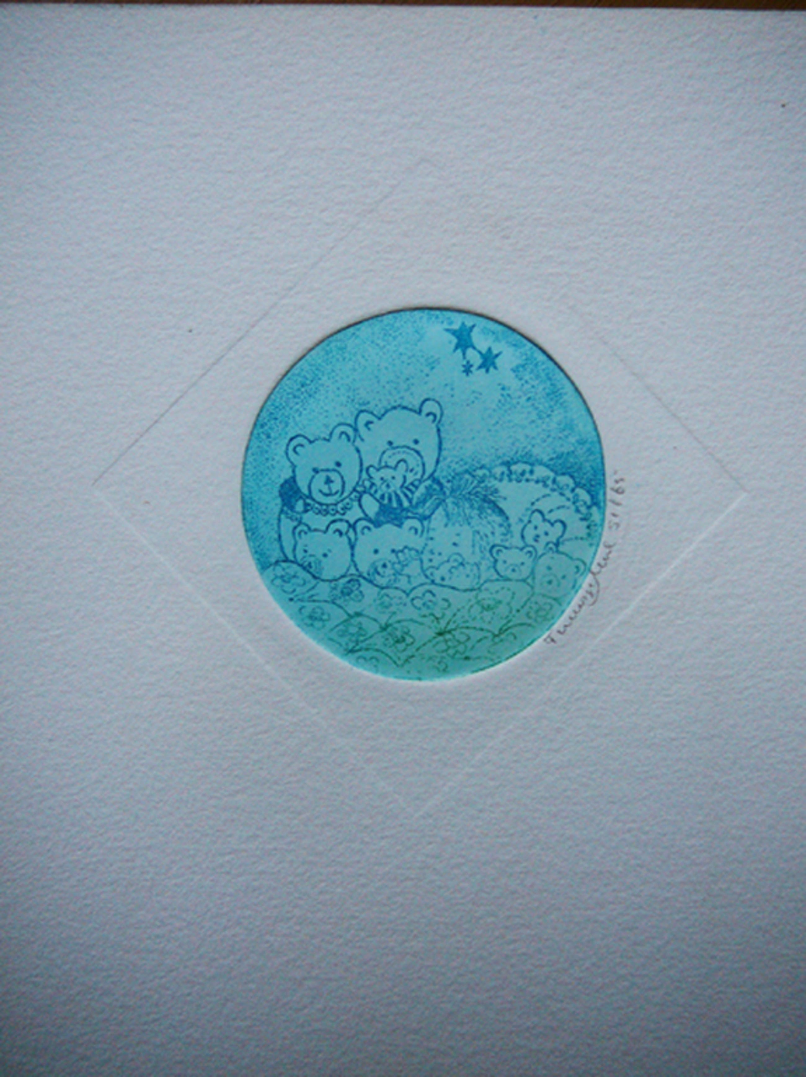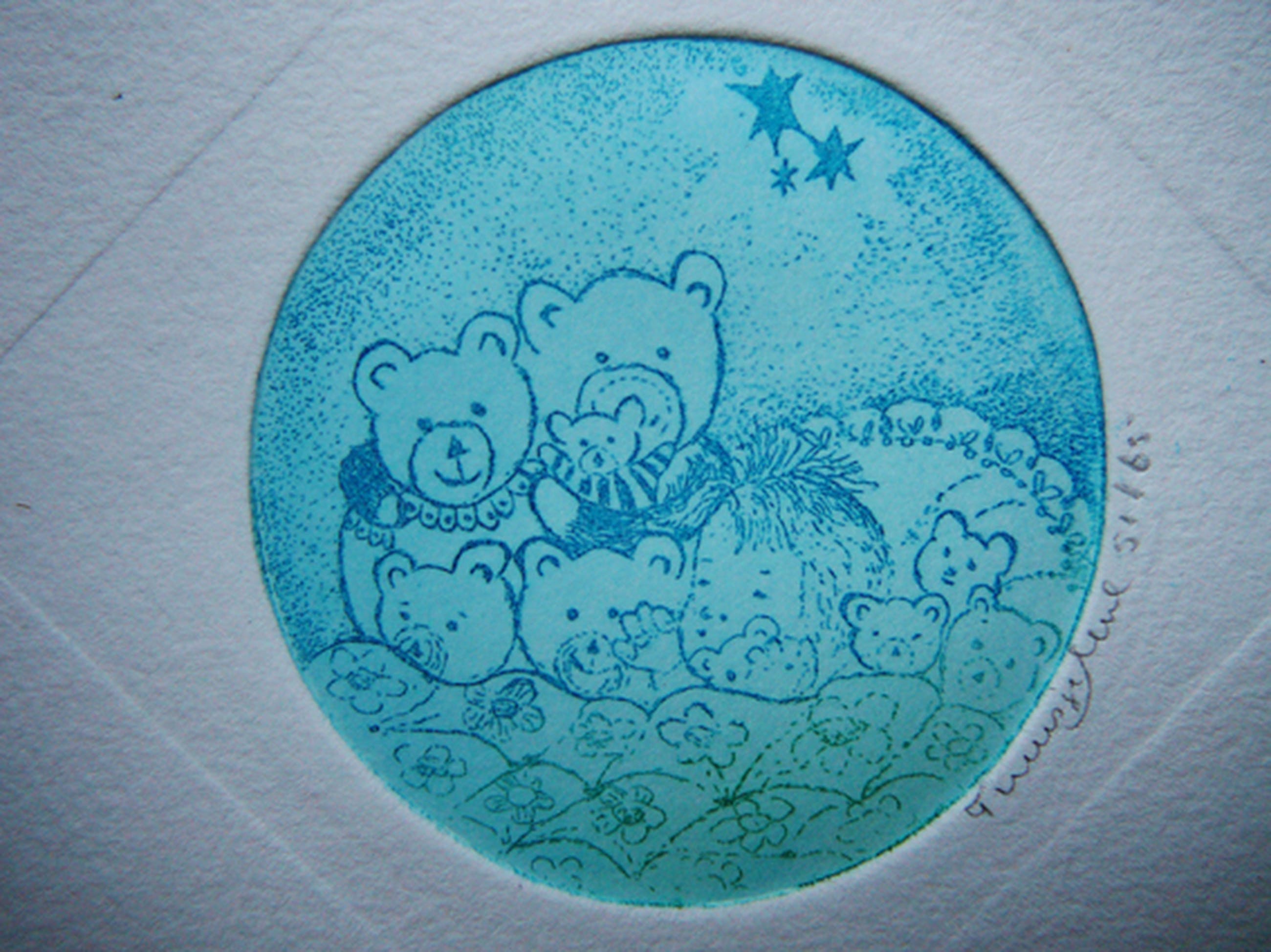 Titel: 'Berenfamilie' Kunstenaar: Truusje Mul. Techniek: Ets. Jaartal: 1980-1990 Afmetingen: Lijst 18 x 13 cm. Afbeelding 5 x 5 cm. Gesigneerd: Handgesigneerd met potlood Oplage: 65. Dit is nr 51. Conditie: De ets is in zeer goede staat.
