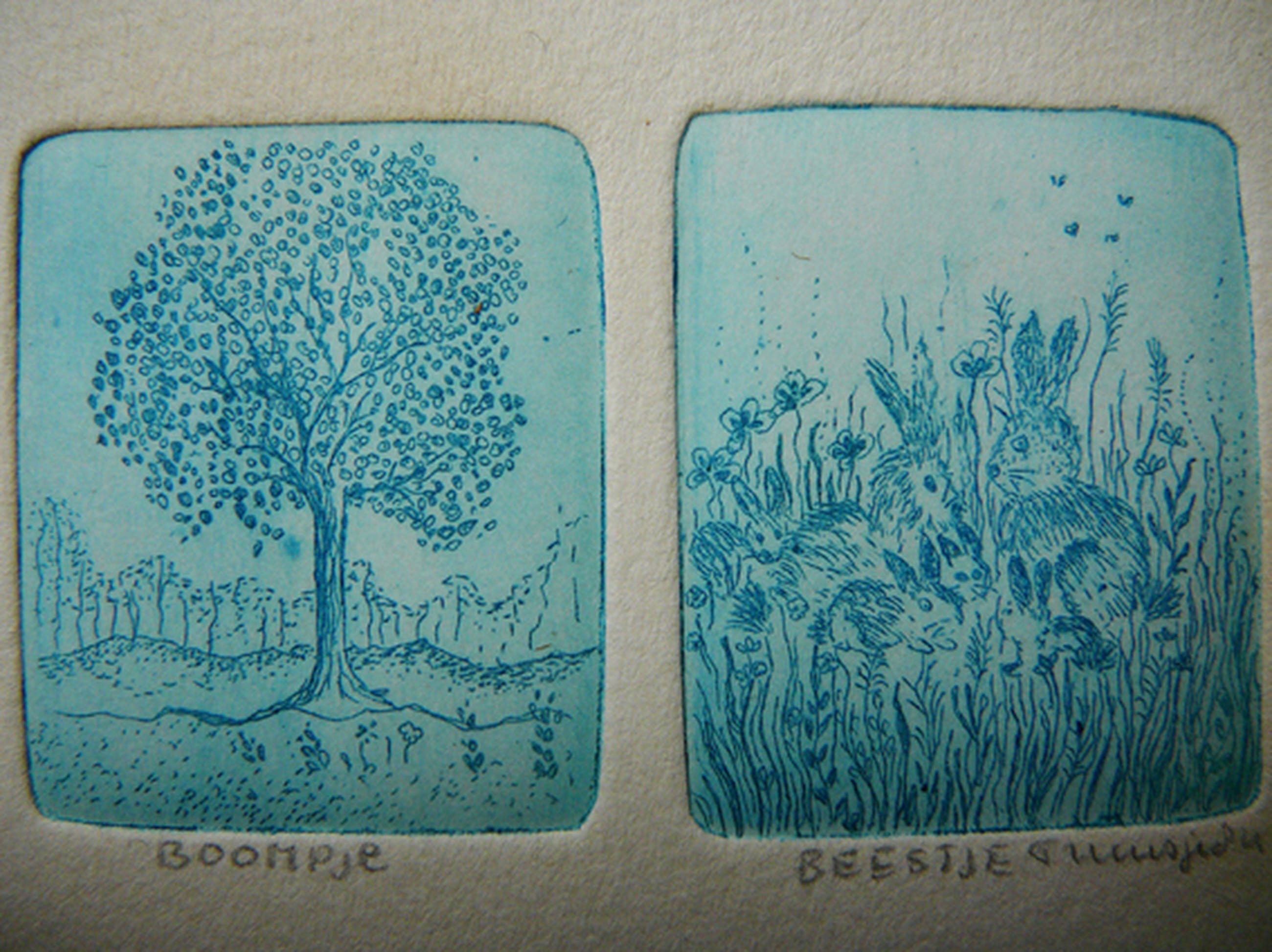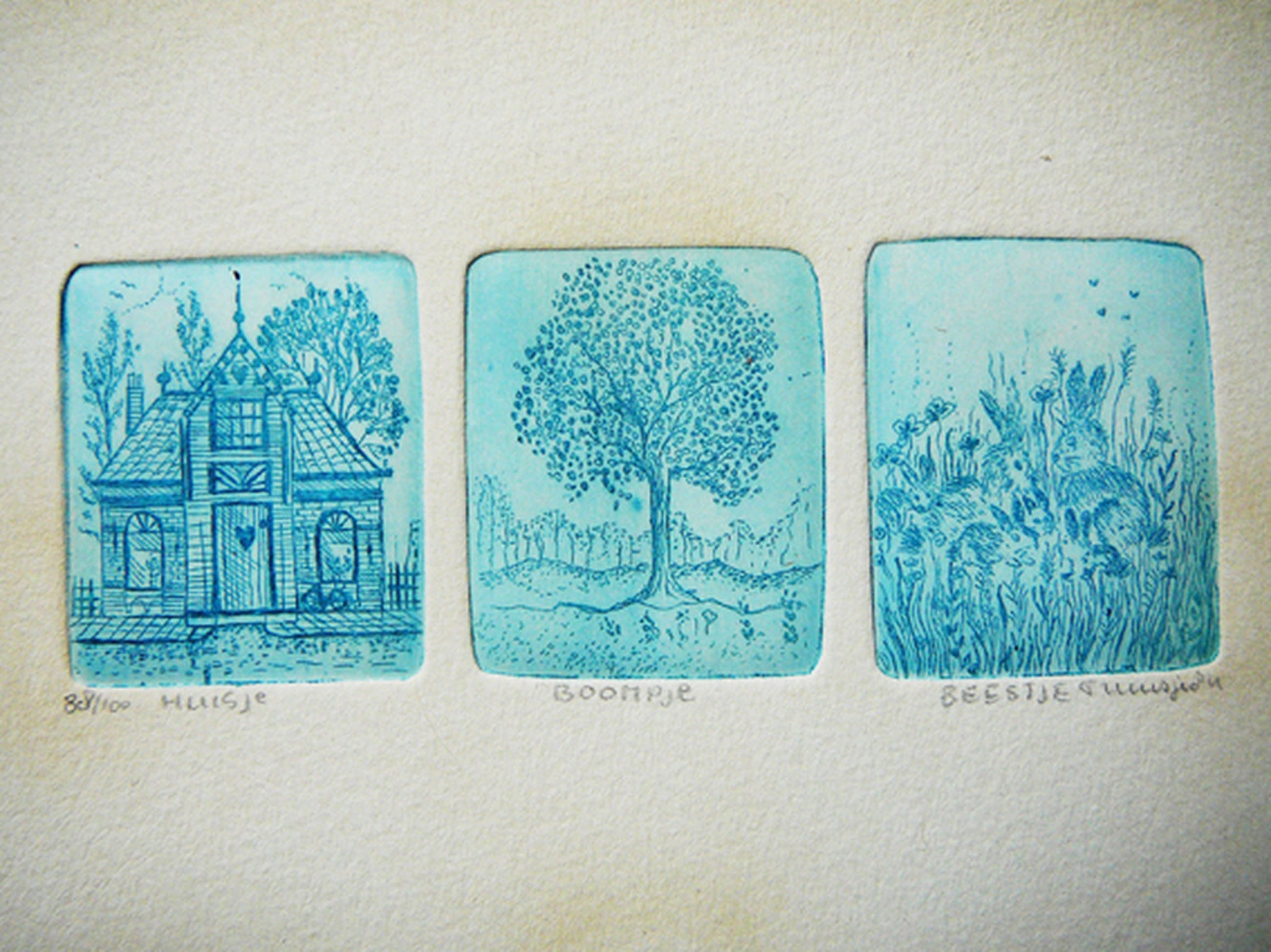 Ragfijne ets (drieluik) van de grafisch ontwerper en schilder Truusje Mul, geboren 1950 te Amsterdam. Handgesigneerd en gelijst in een eenvoudige wissellijst (18 x13 cm).