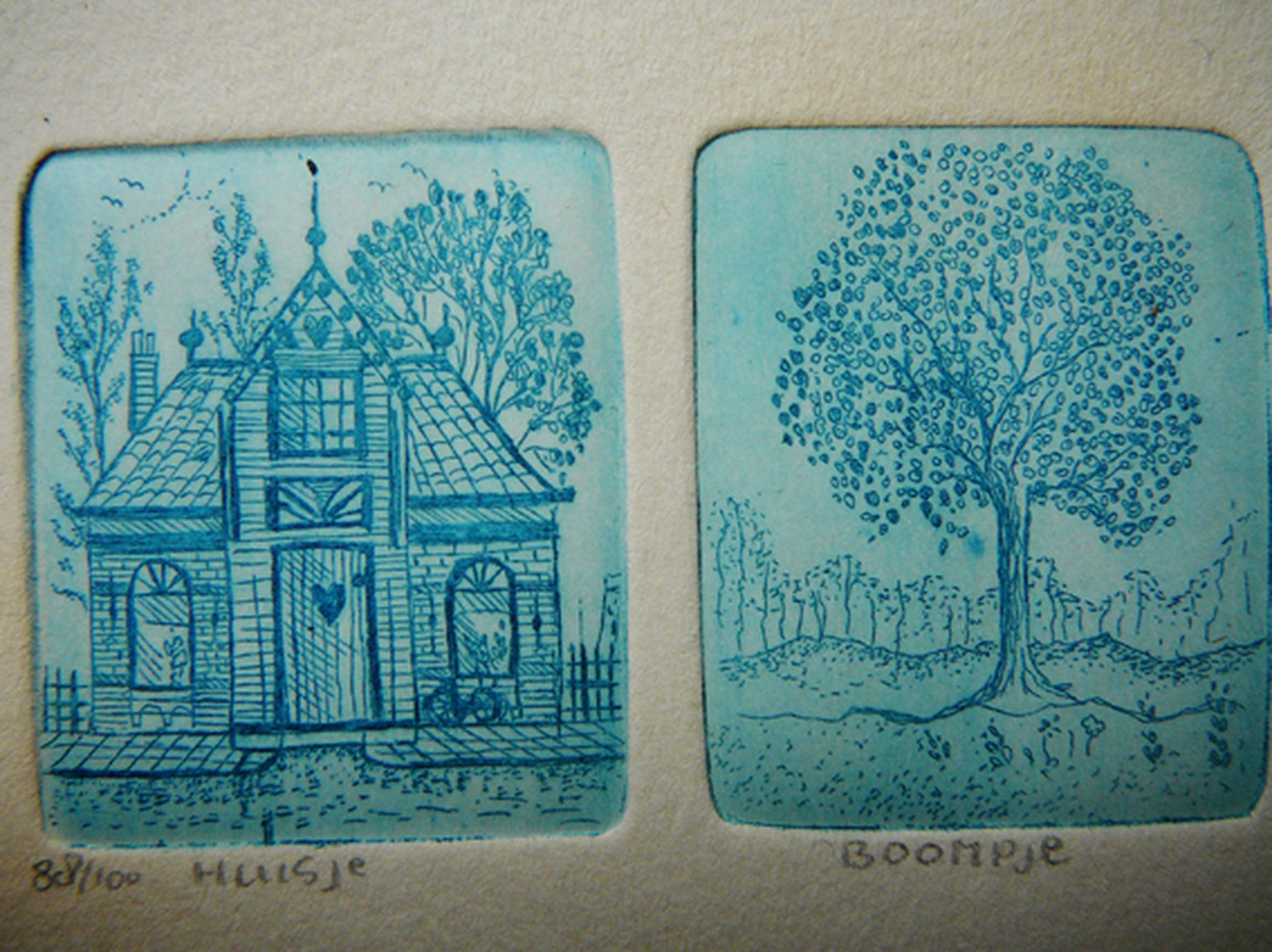 Titel: Huisje, boompje, beestje Kunstenaar: Truusje Mul. Techniek: Ets. Jaartal: 1984 Afmetingen: Lijst 18 x 13 cm. Afbeelding 12 x 5,5 cm. Gesigneerd: Handgesigneerd met potlood rechtsonder Oplage: 100. Dit is nr 88. Conditie: De ets is in goede staat. Papier licht verkleurd.
