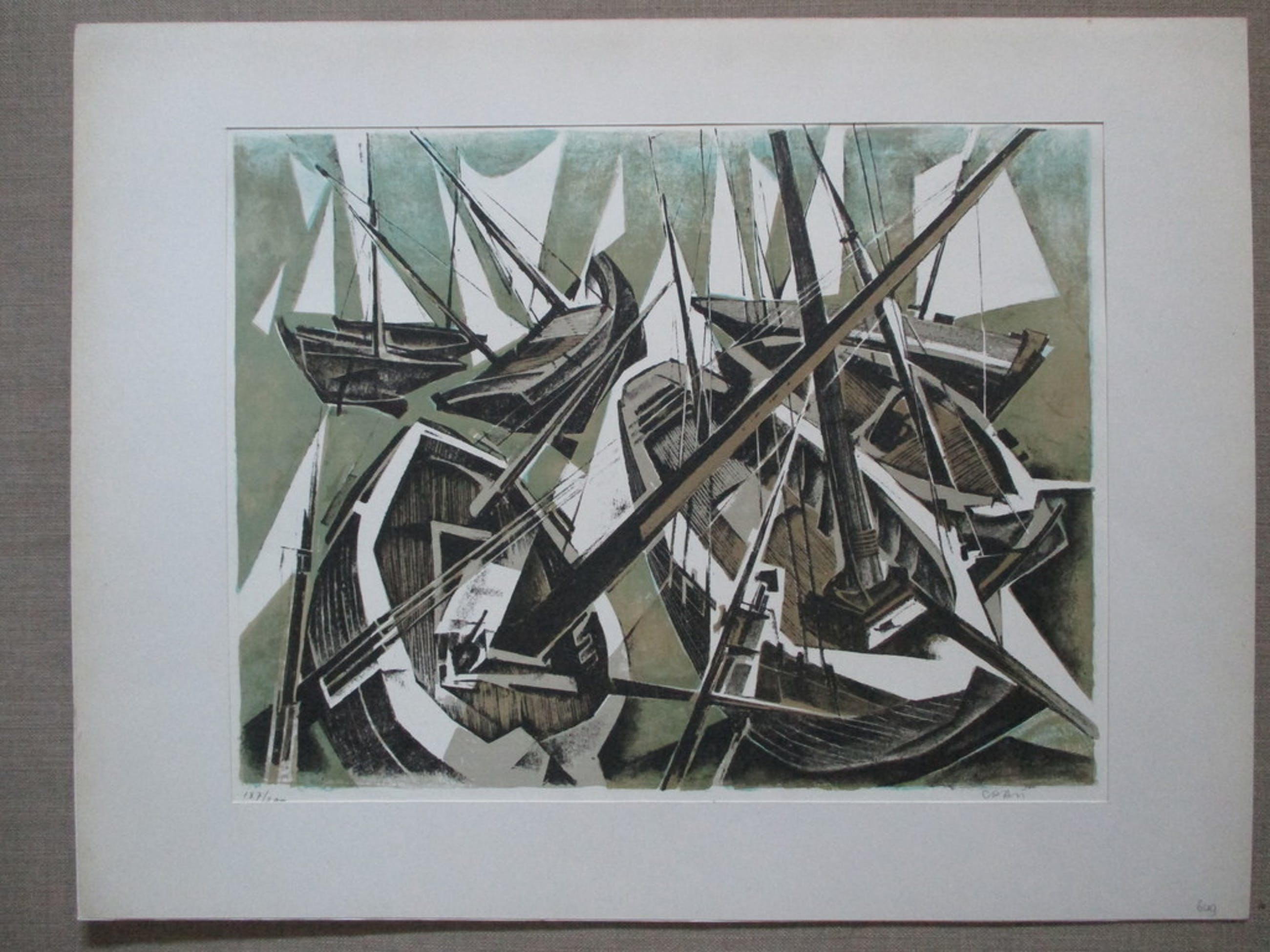 Litho in vier kleuren van de Italiaanse kunstenaar Tulio Crali, gesigneerd en genummerd 187/200 in potlood. Geplaatst (bovenaan getipt) in Dun kartonnen passe-partout, afm. 65x50, blad 50x39, beeld 47x36,5 cm. Het blad verkeert in perfecte staat, het passe-partout heeft enkele kleine plekjes.