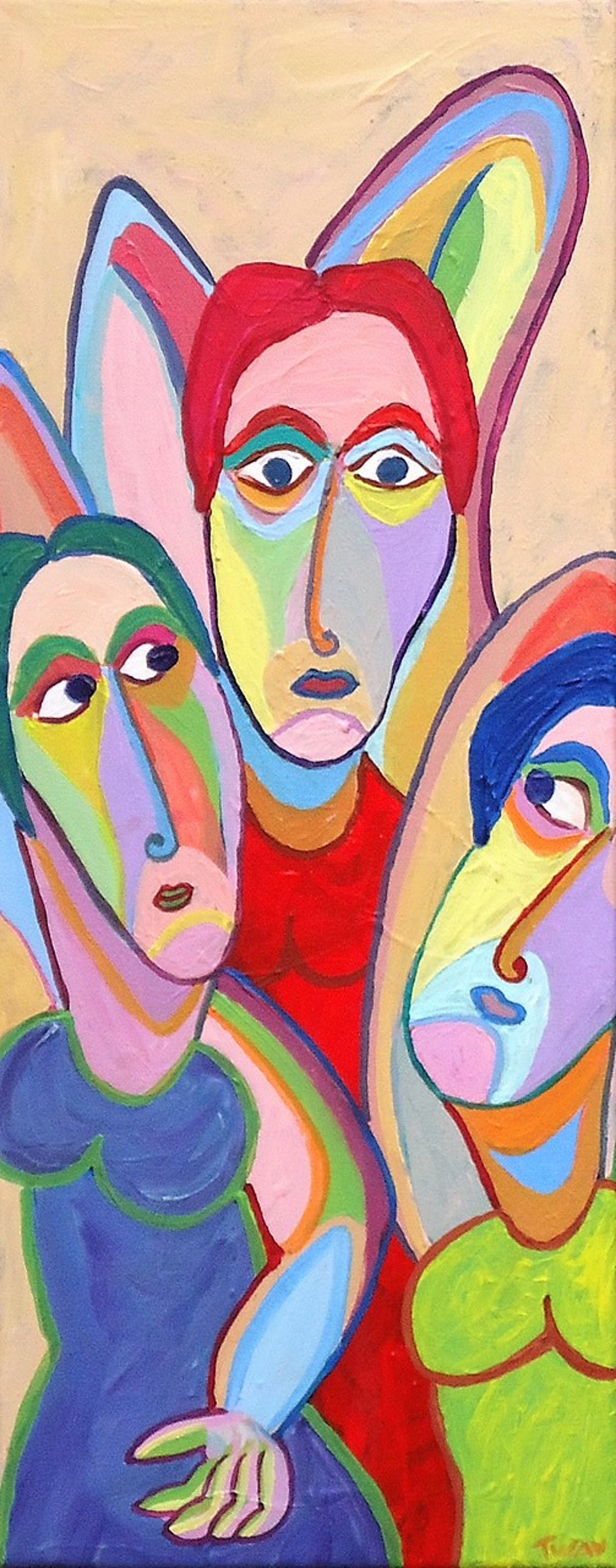 Kleurrijk werk van Twan de Vos, 'Drie Vrouwen' Acrylverf, aangebracht op doek, opgespannen op houten spieraam