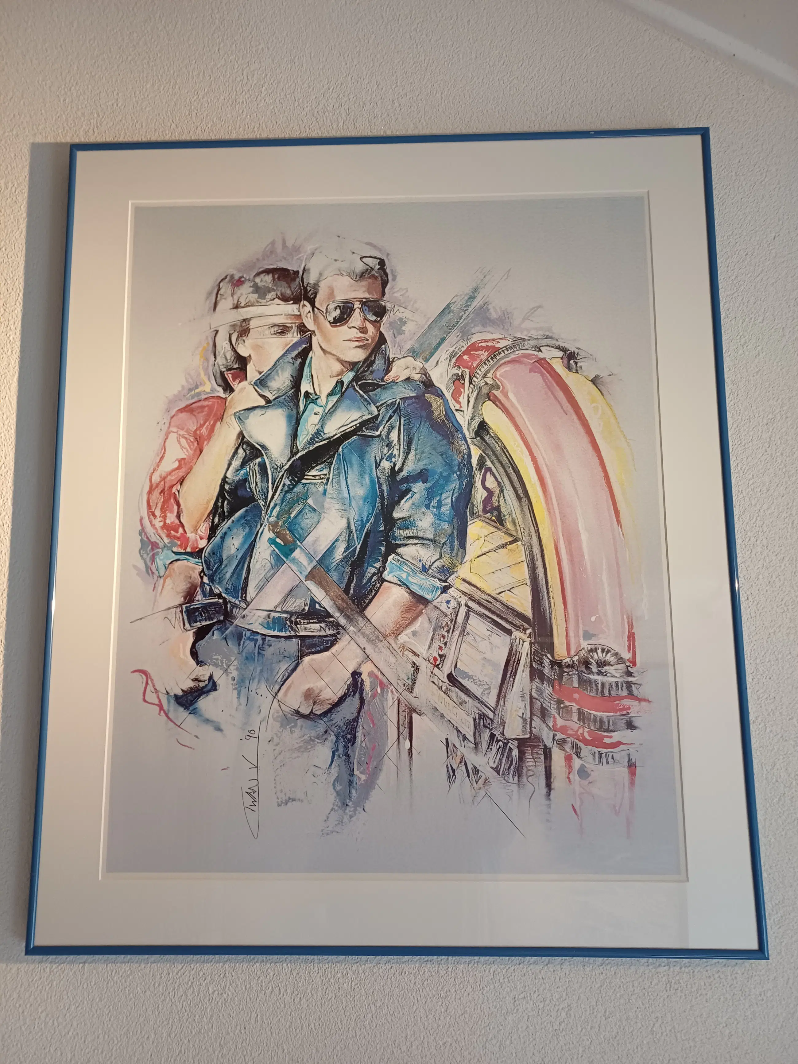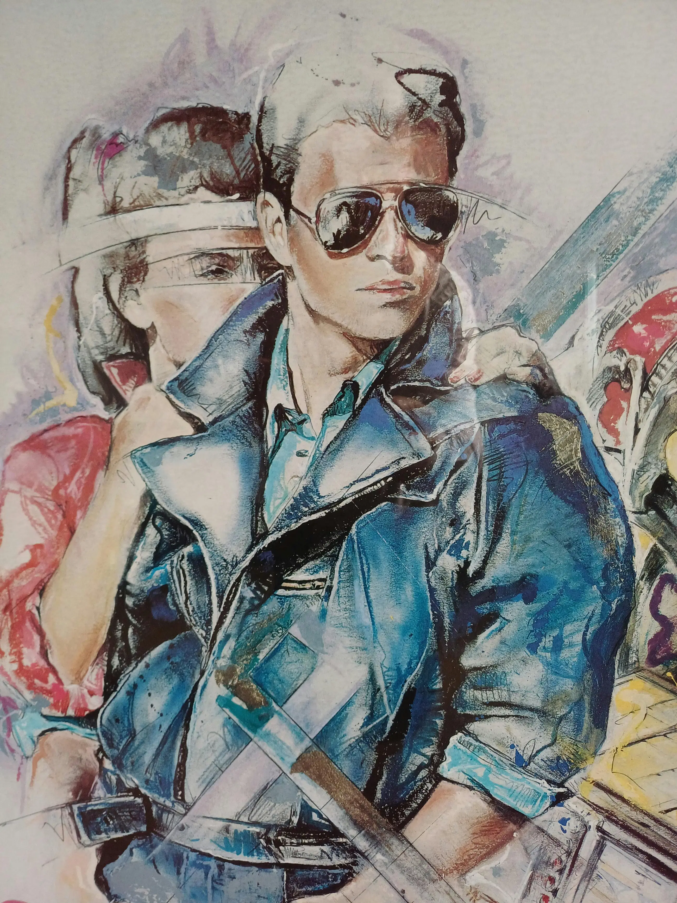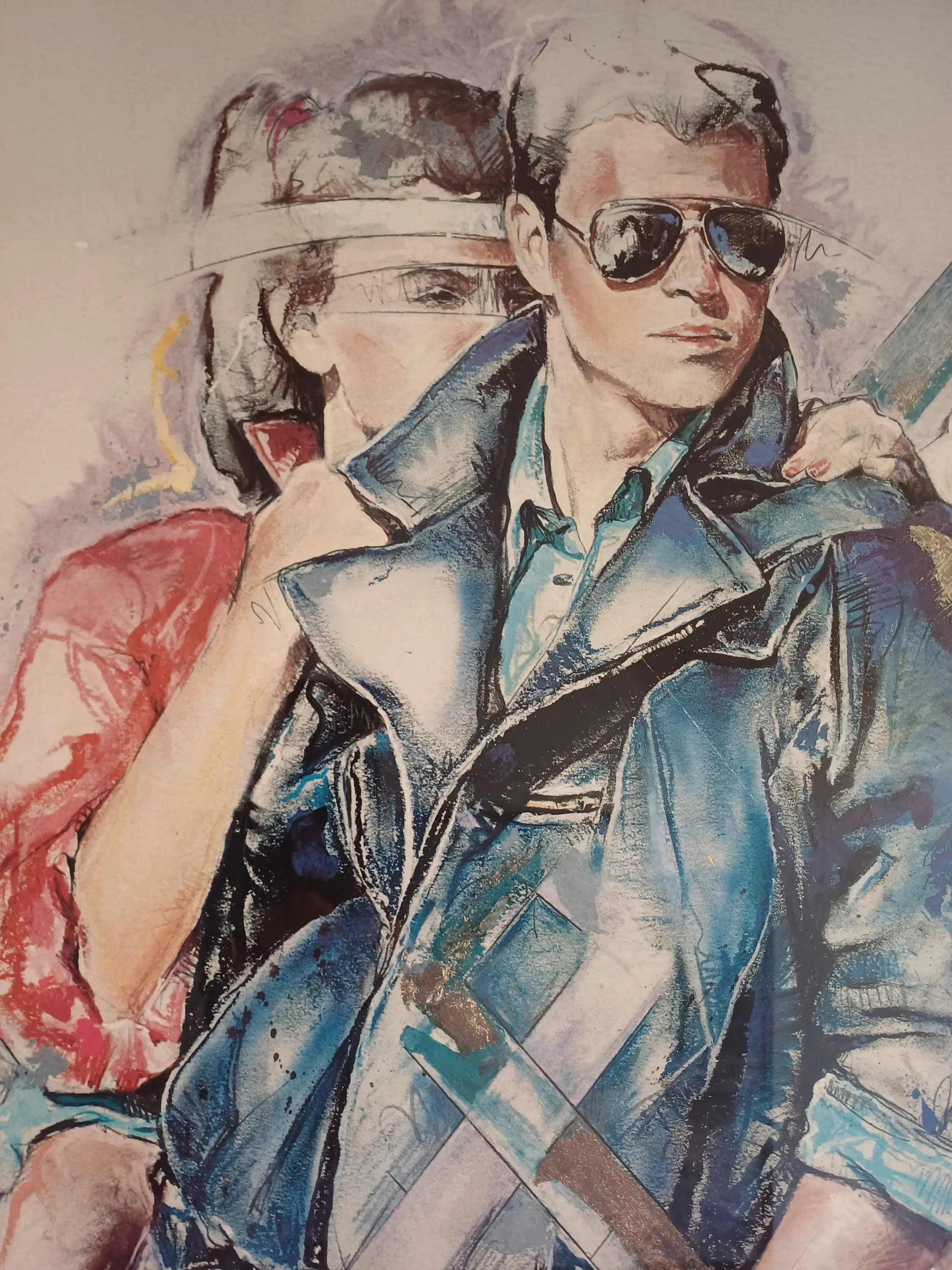 Dit specifieke beeld, vaak uitgevoerd als litho of aquarel, toont een man en vrouw in een stijl die typerend is voor de jaren '80 en '90, met elementen zoals zonnebrillen en een expressief kleurgebruik.