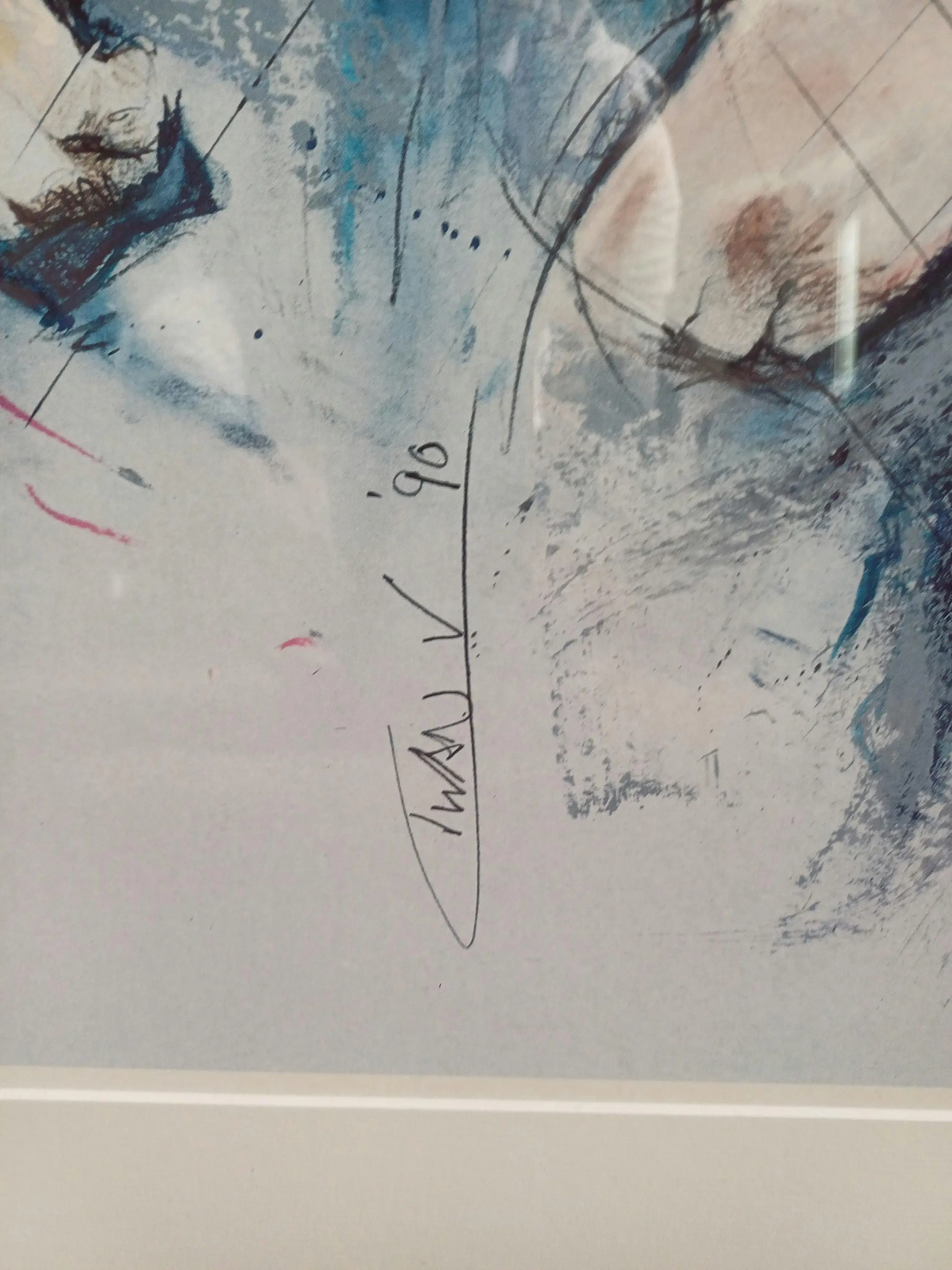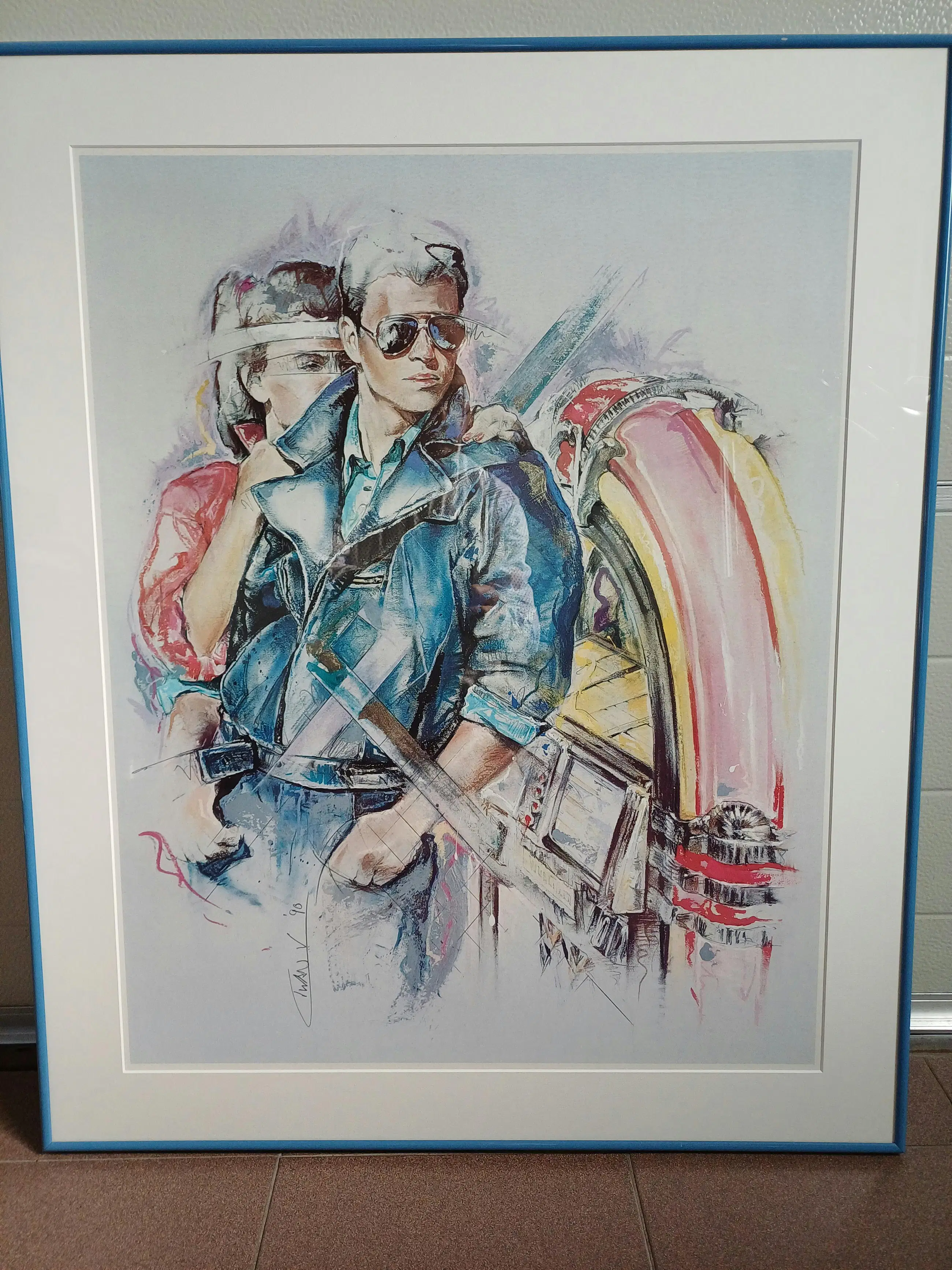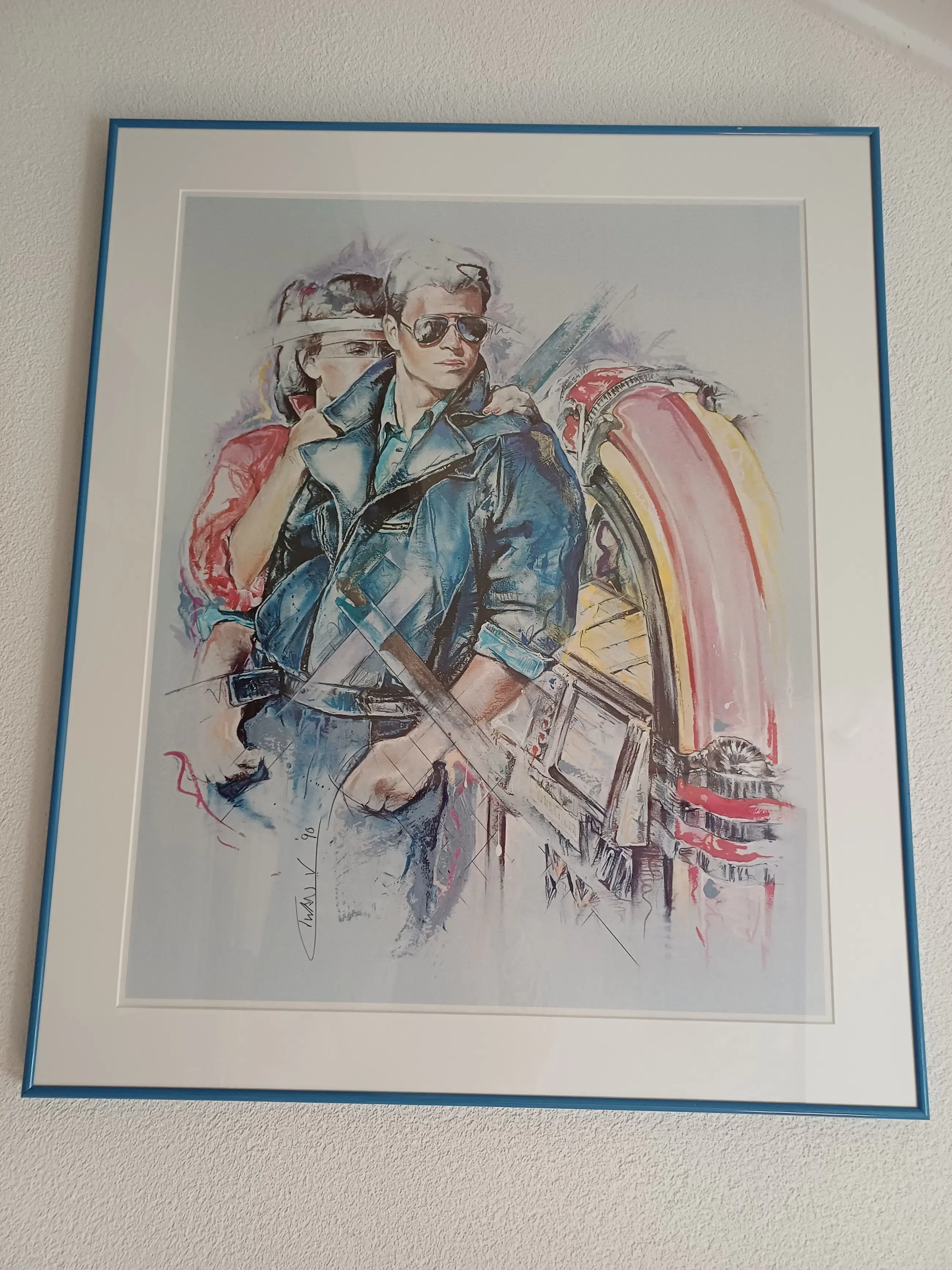 Dit specifieke beeld, vaak uitgevoerd als litho of aquarel, toont een man en vrouw in een stijl die typerend is voor de jaren '80 en '90, met elementen zoals zonnebrillen en een expressief kleurgebruik.