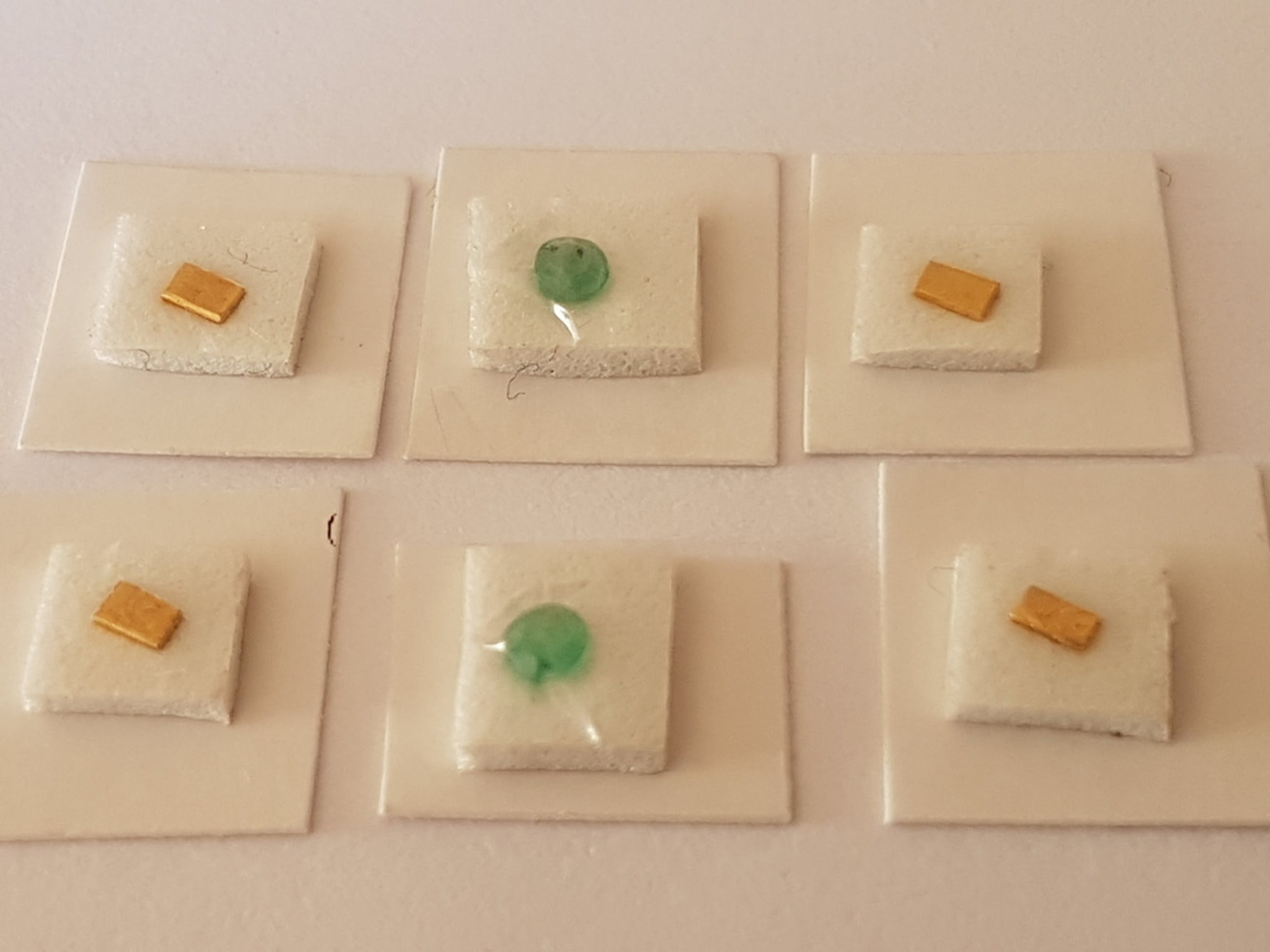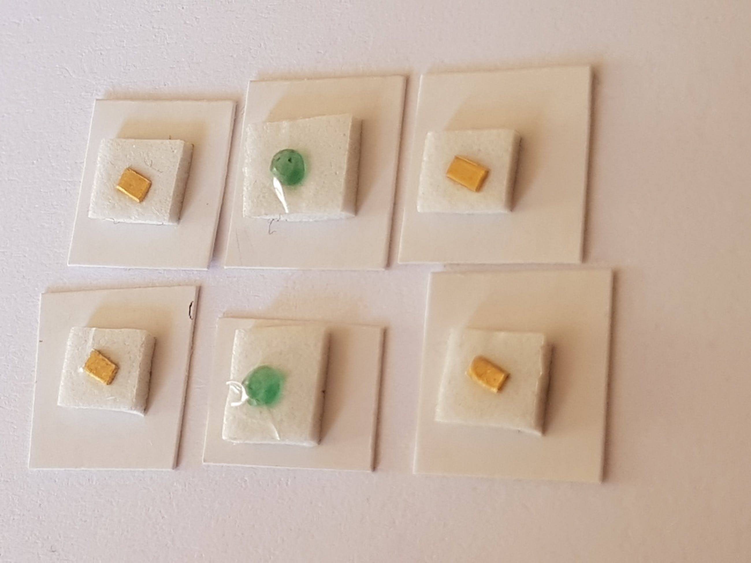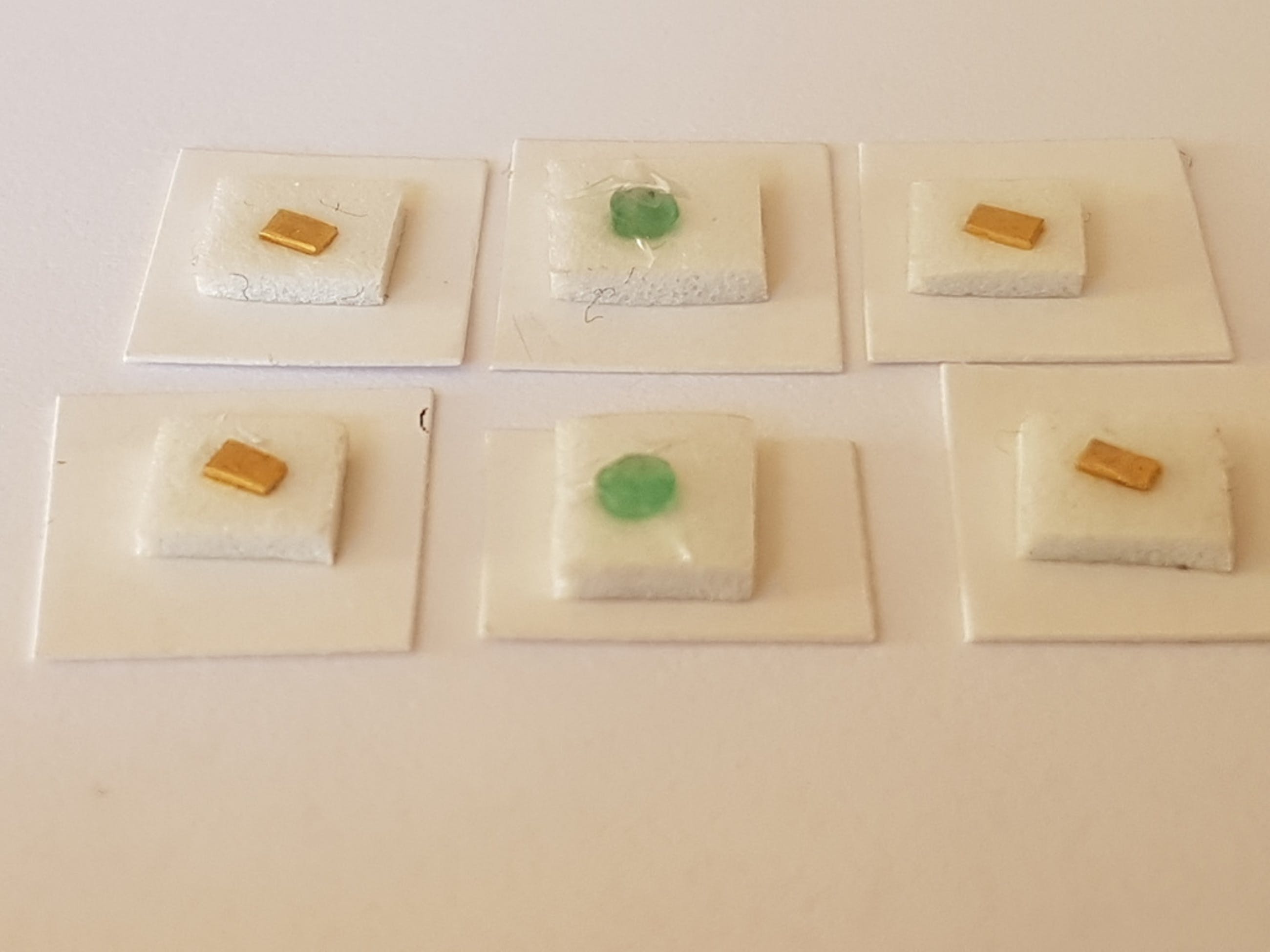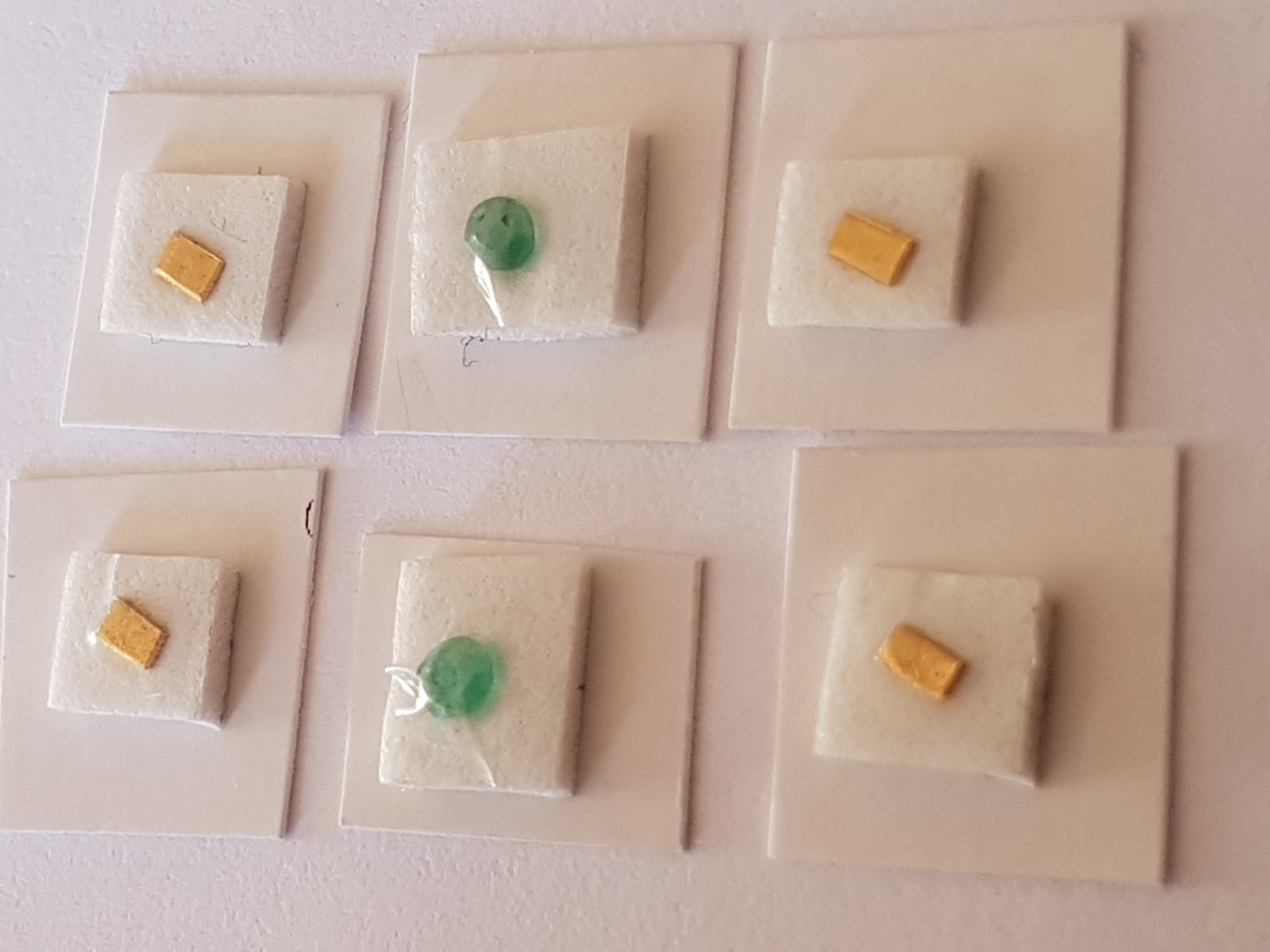 Gold bullion fineness:999 (24 karats)Gold nuggets country source:AustraliaGold bullion metal/condition:Solid gold/ExcelentEmerald size:between 2.0 and 2.25mm (lenght) (±0.25 mm)Gold bullion minimum size:2.0mm x 1.0mm x 0.3mm (lenght-width-thick)Emerald cut/cut grade:Round faceted/good to slightly goodGold bullion weight:0.015~0.030 grams (±0.003 grams)Emerald color/shine level:Green/good shiny to slightly opaqueGold nuggets size:between 0.6 and 1.5mm (lenght) (±0.2mm)Emerald clarity/Is natural?:VS2 to SI2 / Yes: genuine natural emeraldGold nuggets thick:between 0.06 and 0.15mm (±0.02mm)Emerald treatment:noneGold nuggets fineness:between 20.5 and 23 karats (±1.0 kt)Emerald Mohs scale hardness:7.5-8Gold nuggets metal/condition:Solid gold/ExcelentEmerald country source/other:Colombia/Formula:Be3Al2(SiO3)6