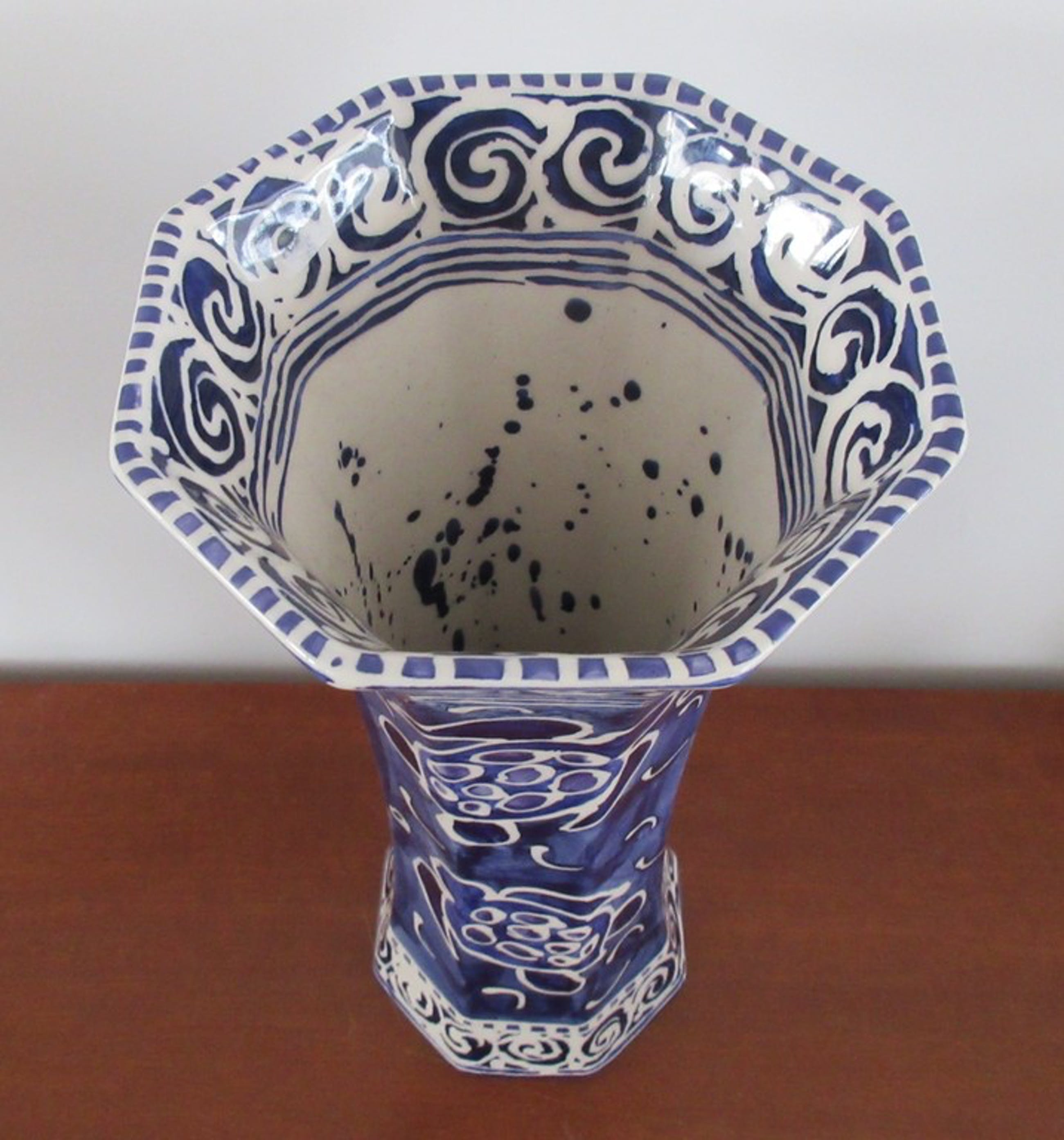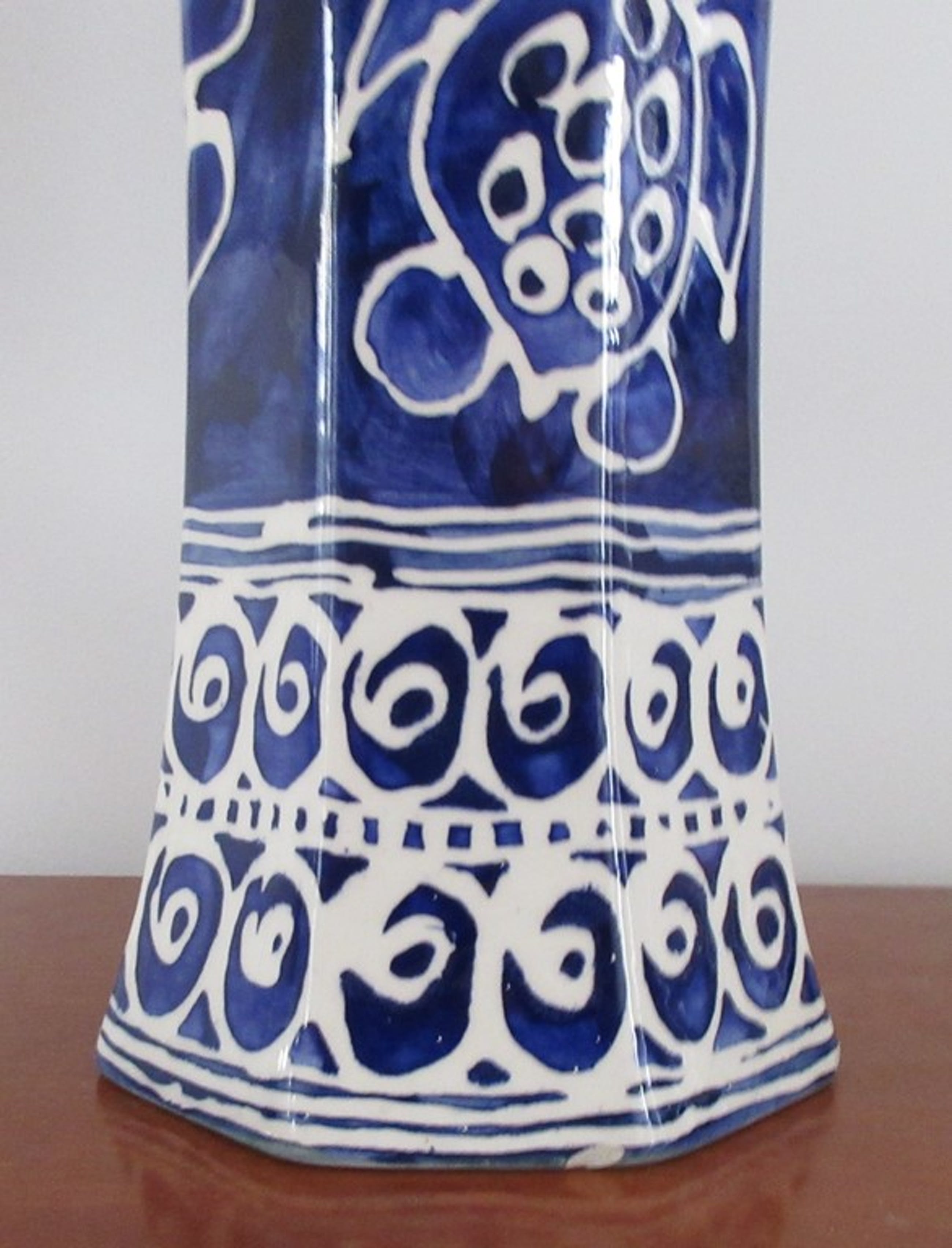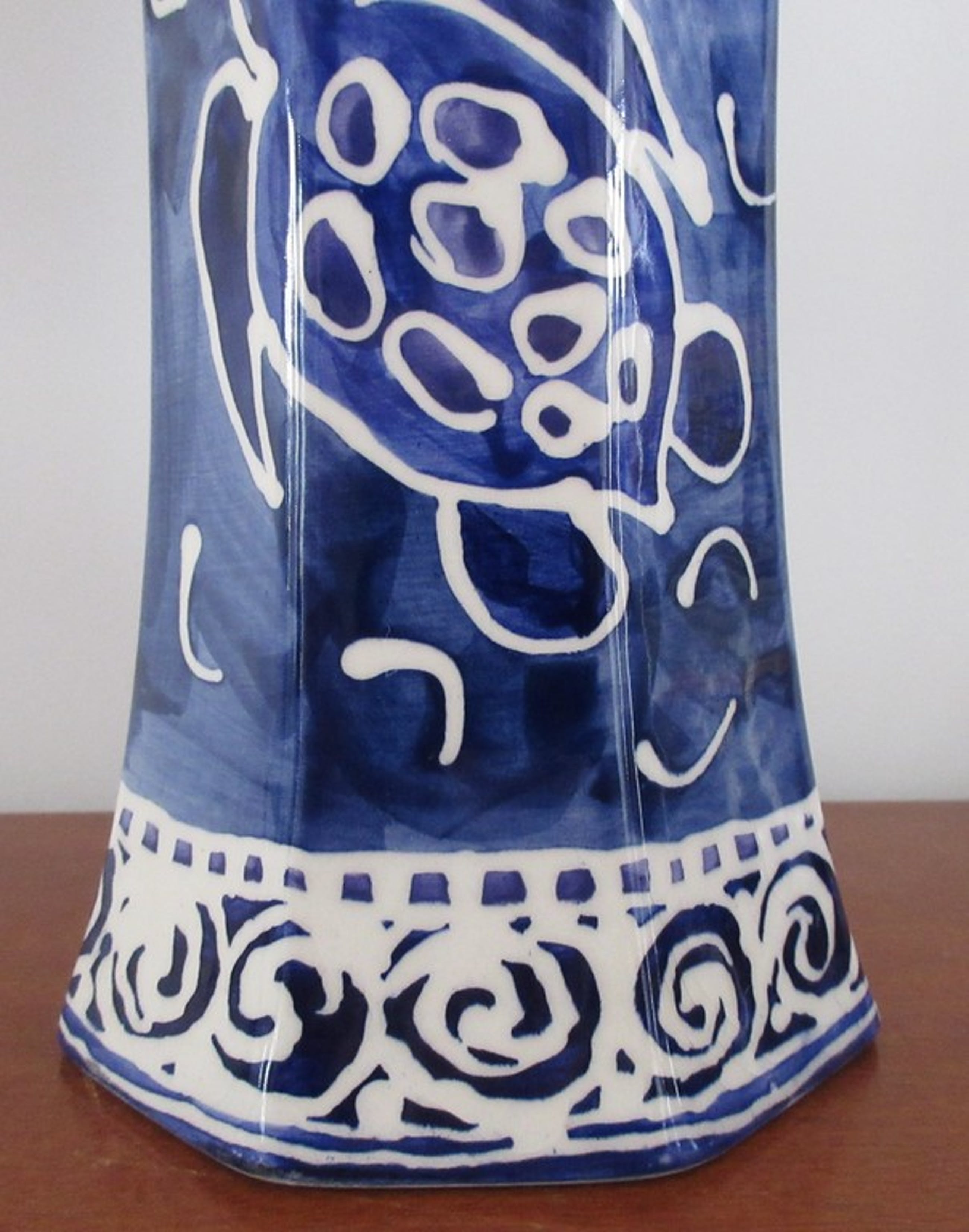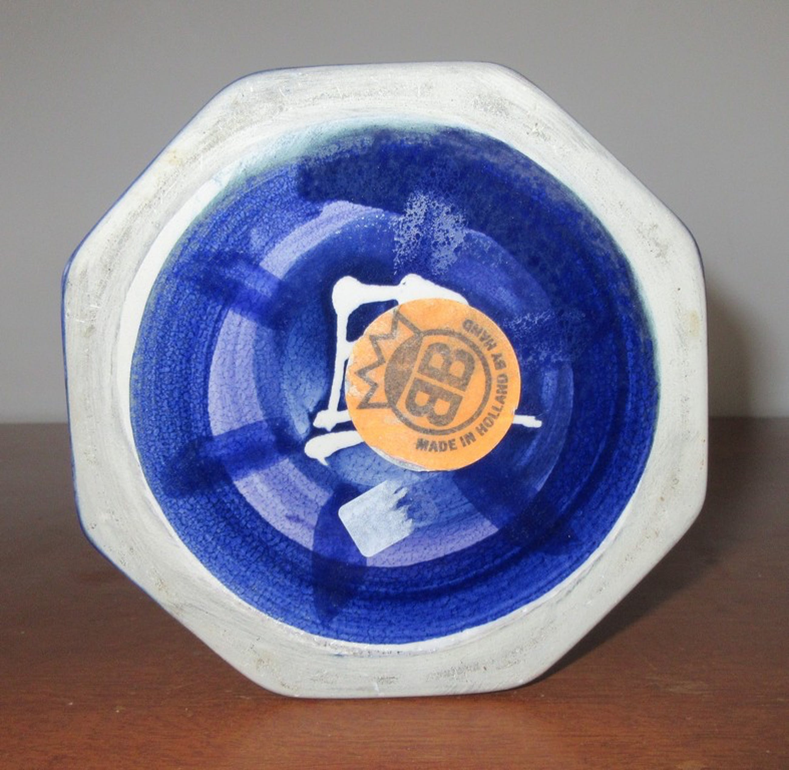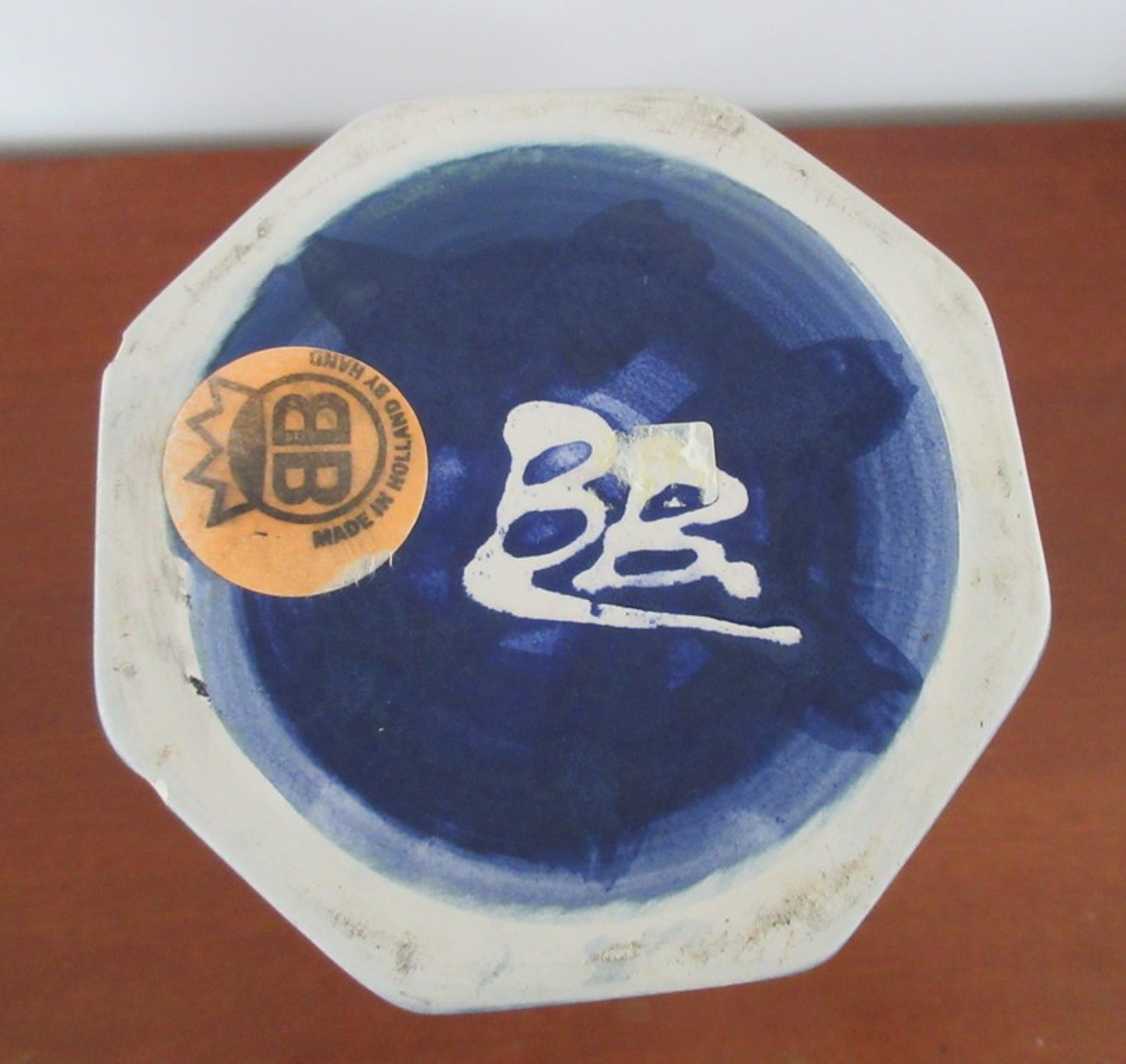 Twee mooie grote blauw witte handbeschilderde octogonale vazen voorzien van een fantasie decor met o.a. zwemmende schildpadjes. De vazen hebben klassieke vorm maar zijn modern gedecoreerd en lijken een stel, maar zijn het niet de decoratie en indeling van de vazen zijn net iets anders. Een vaas is in onbeschadigde conditie, de andere heeft twee chipjes op de voet. Beide vazen zijn met de hand gesigneerd BB en zijn gemerkt met een oranje sticker waarop ook BB in spiegelschrift staat en de tekst "Made in Holland by Hand". Helaas is de studio of keramist mij onbekend.