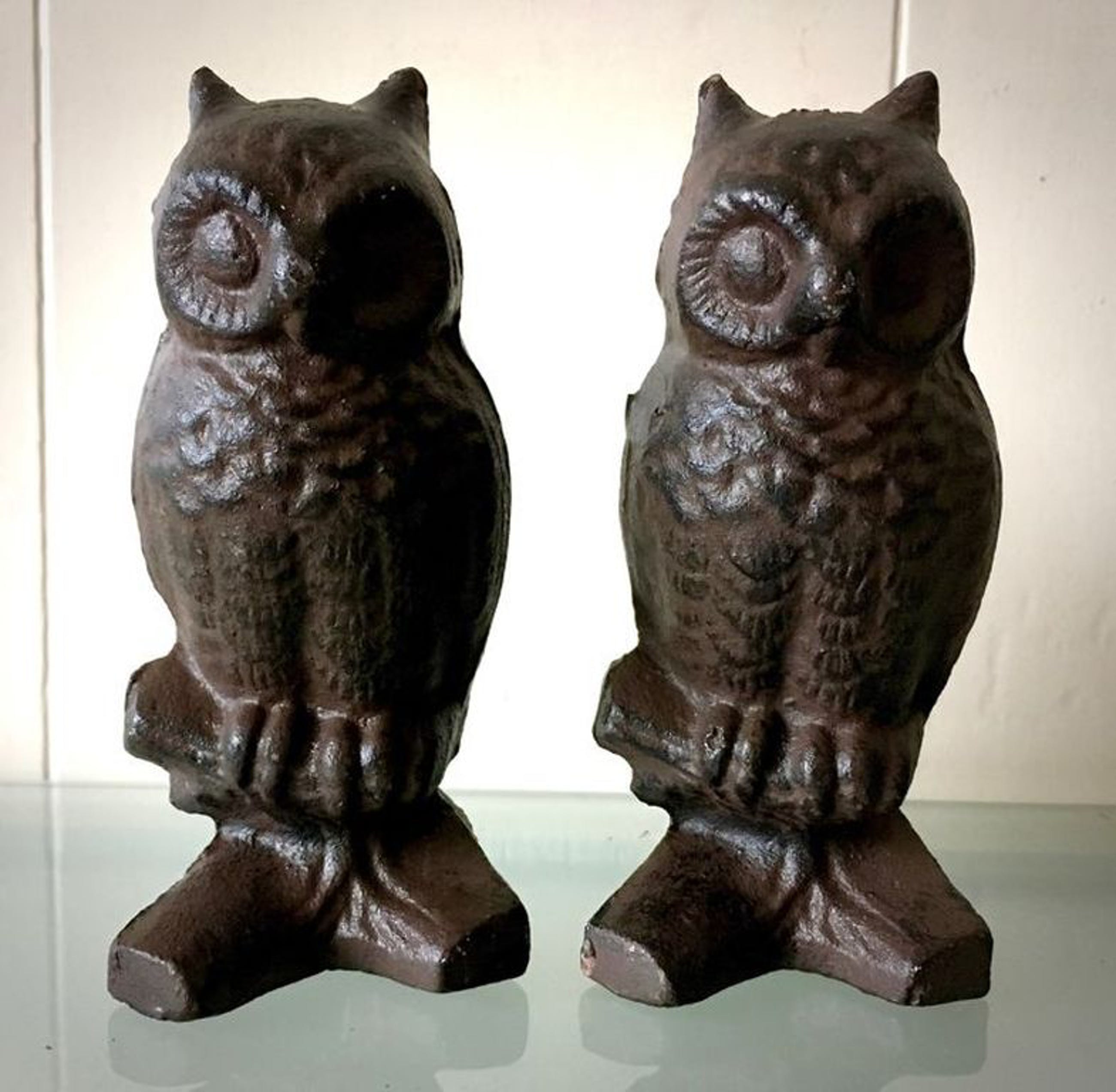 Twee interessante en goed ontworpen uilen van gietijzer. In prima gepatineerde staat.
