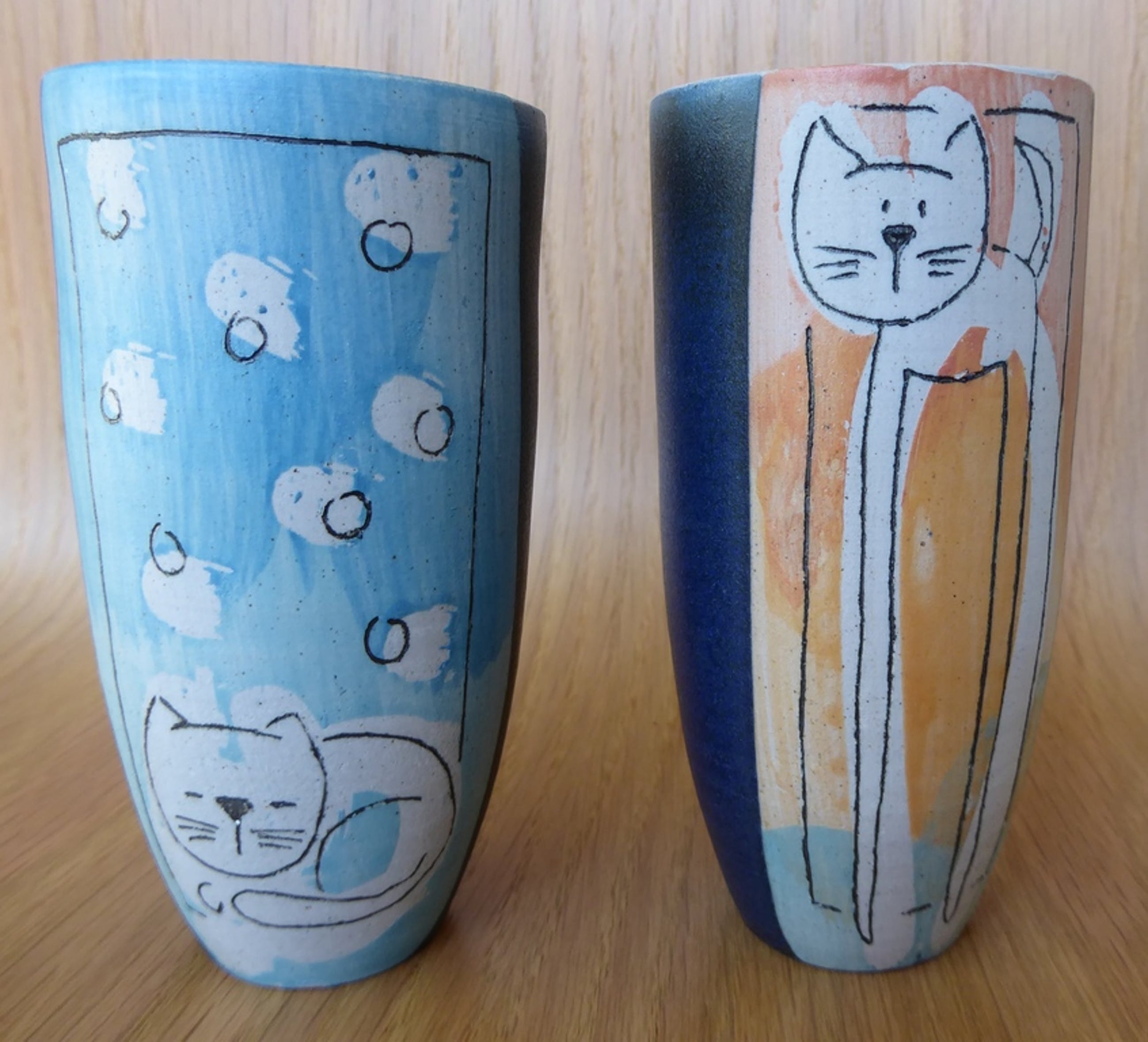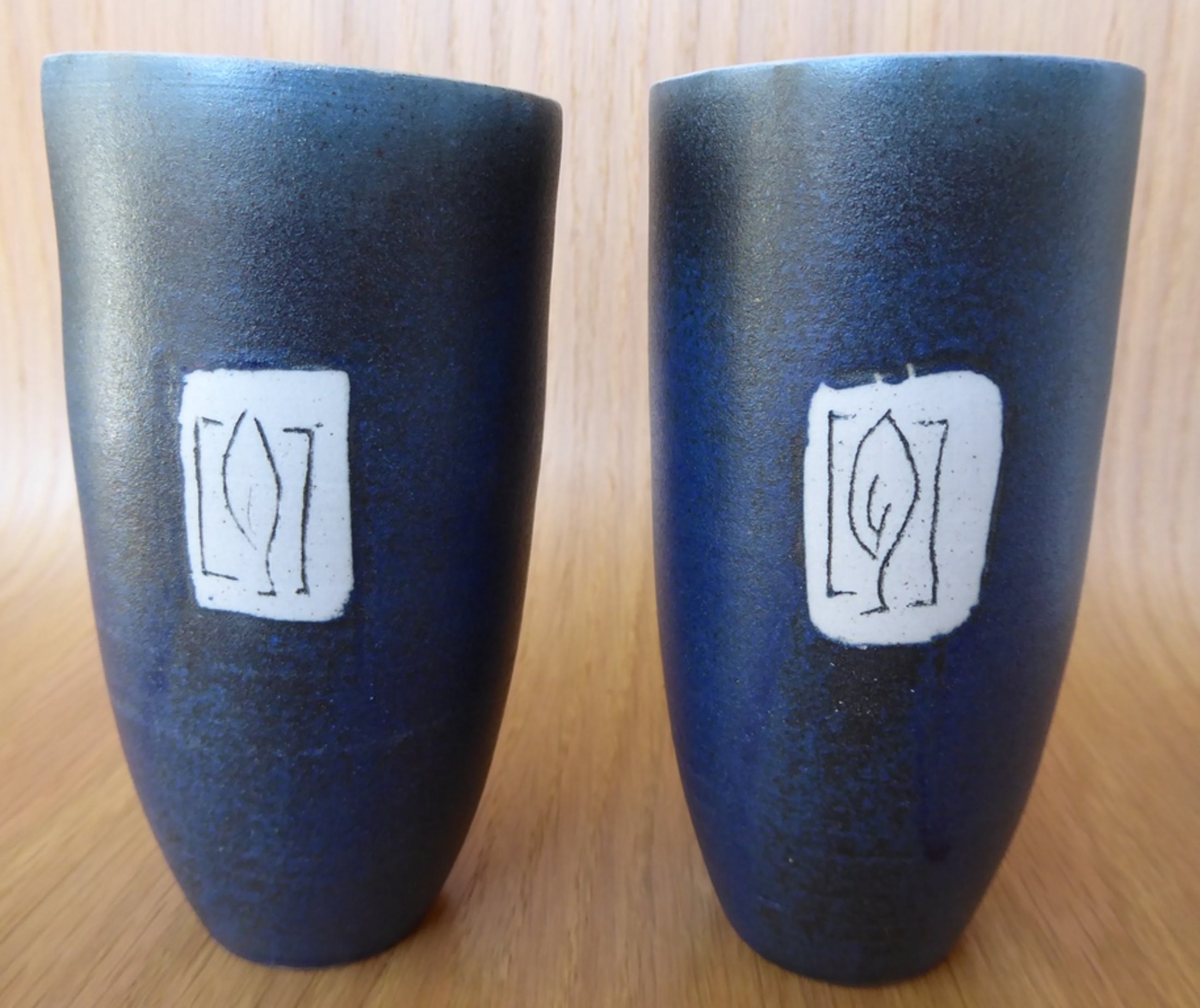 Dit zijn twee bij elkaar horende vaasjes. Het is relatief moderne keramiek. Op de onderkant staat bij allebei een signatuur maar ik heb geen idee wie er achter steekt.