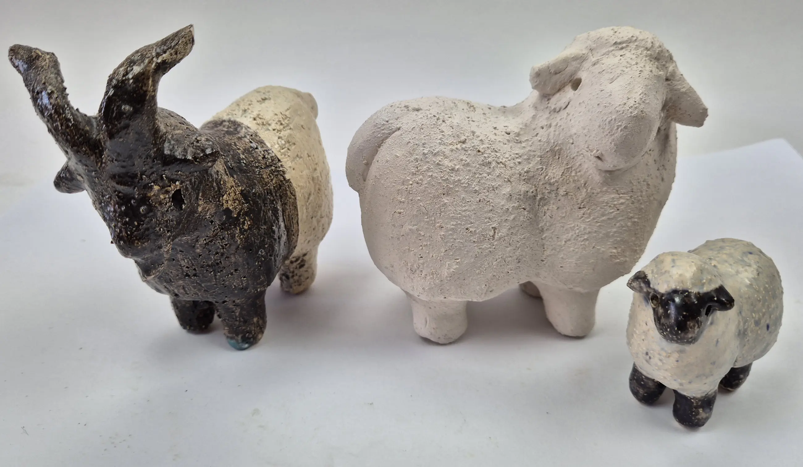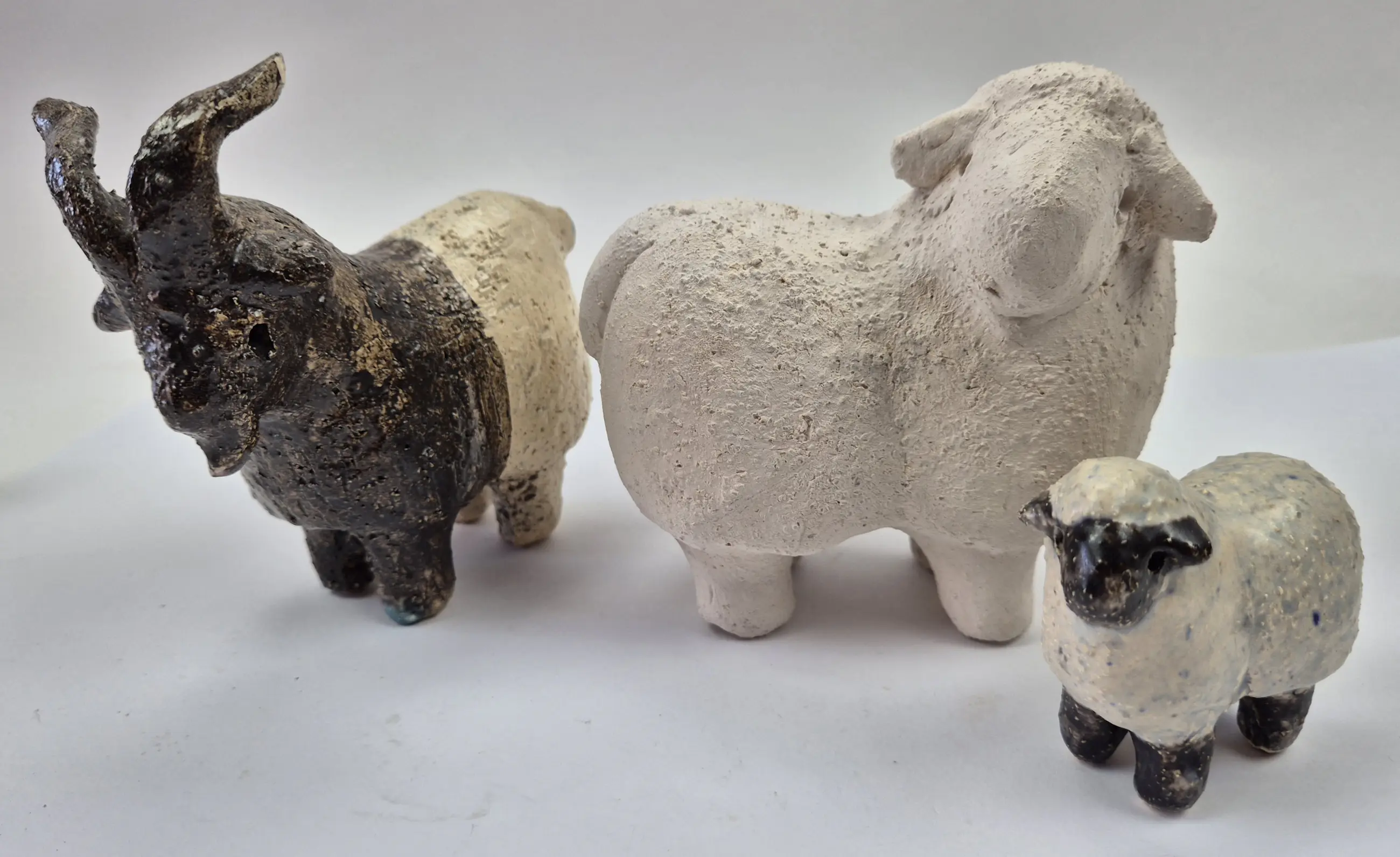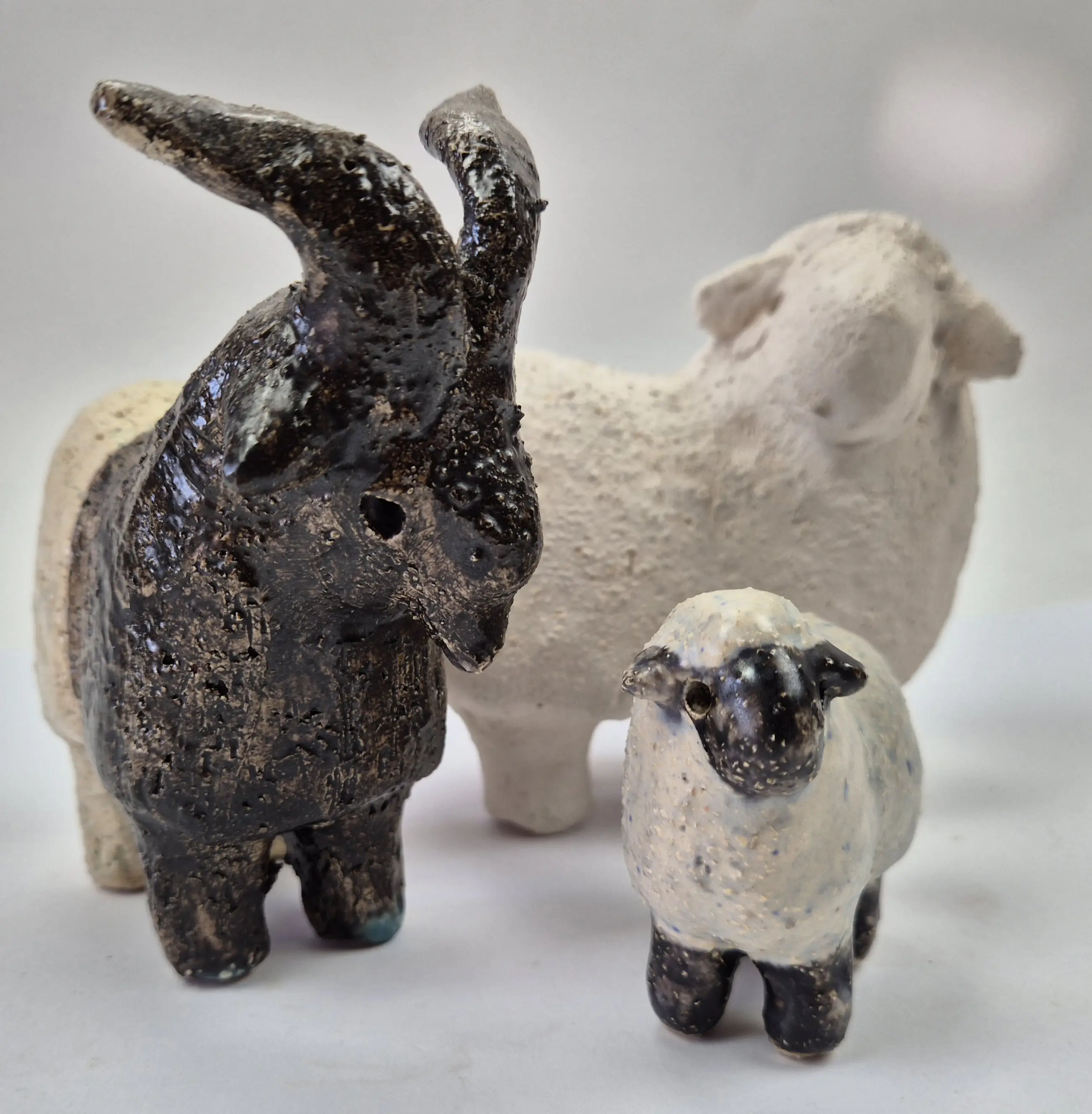 Dit olijke trio zijn met de hand gemaakt door de Bernse pottenbakker Ueli Schmutz (geboren in 1932, Zwitserland). Zijn figuren en objecten zijn geliefd en worden gewaardeerd binnen en buiten de grenzen van Zwitserland.