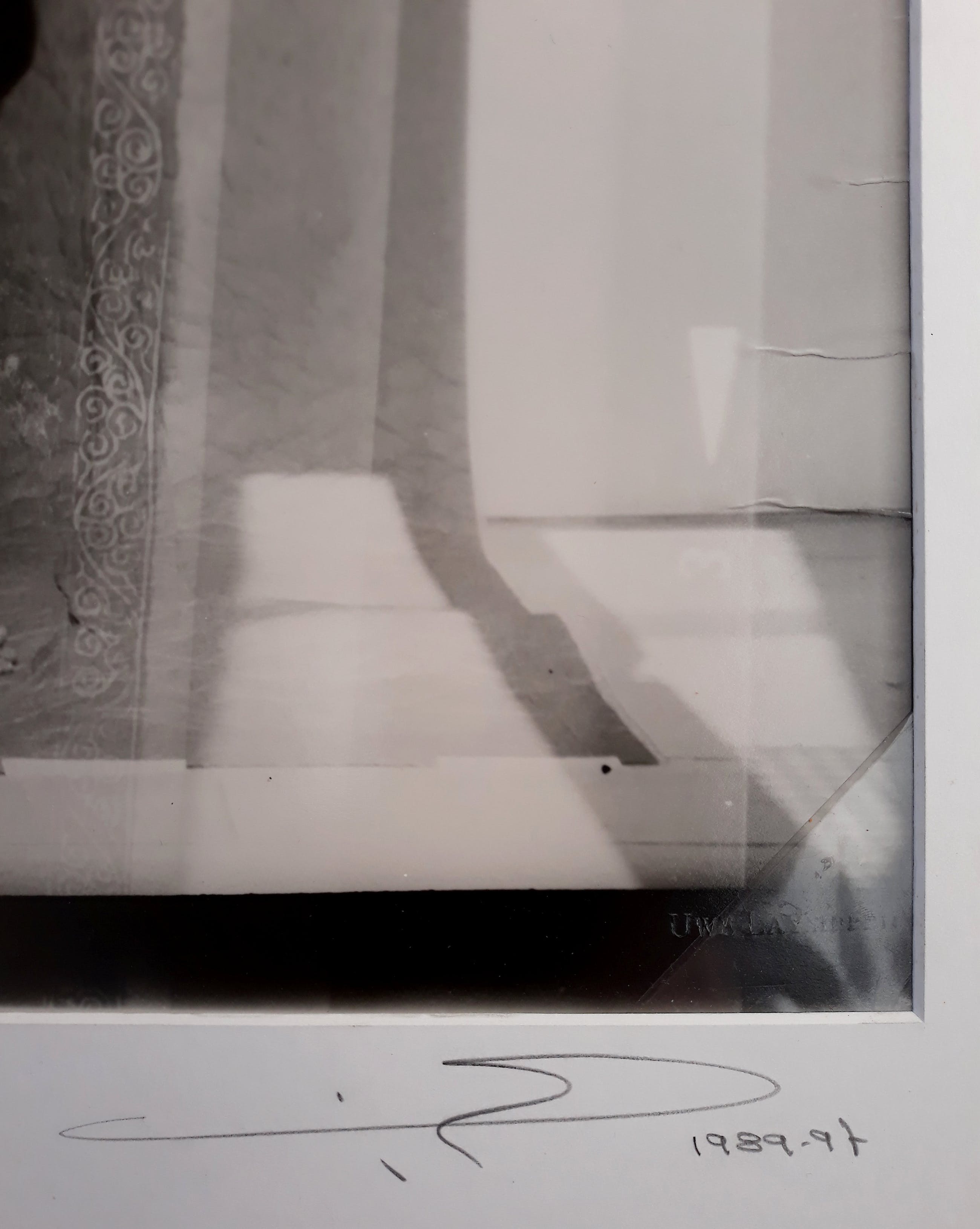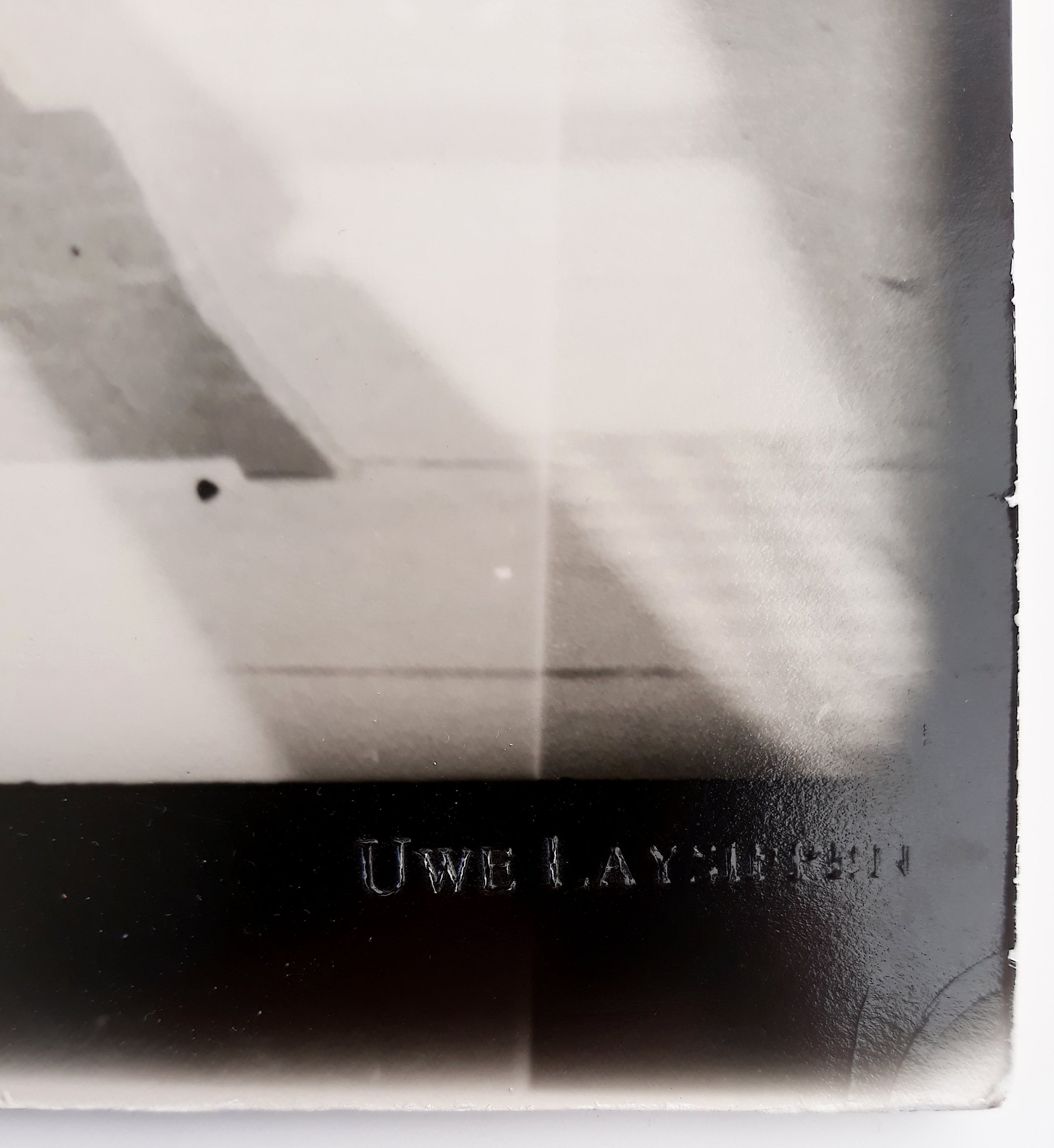 Grote foto van Ulay (Frank Uwe Laysiepen) uit 1997. C-print (denk ik) gemonteerd op plastic en vervolgens in passe-partout geplaatst, met reliëfstempel “Uwe Laysieper” op de foto en op het passe-partout met potlood gesigneerd en gedateerd (1989-97). In redelijk goede conditie; aan de rechter kant van de foto zitten over de hele lengte ongeveer 10 kreukjes (zie foto) en het passe-partout is niet smetteloos. De foto kan eenvoudig uit het passe-partout gehaald worden.