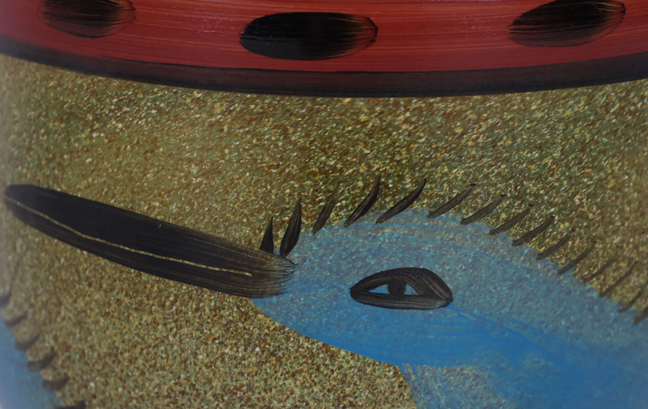 Hydman-Vallien staat bekend om haar expressieve, vaak humoristische schilderingen van dieren, gezichten, bloemen en mythische wezens op glas. Hier zien we een decoratie van een gestileerde blauwe vogel op een goudgroene achtergrond, met een rood-bruine rand voorzien van zwarte stippen.