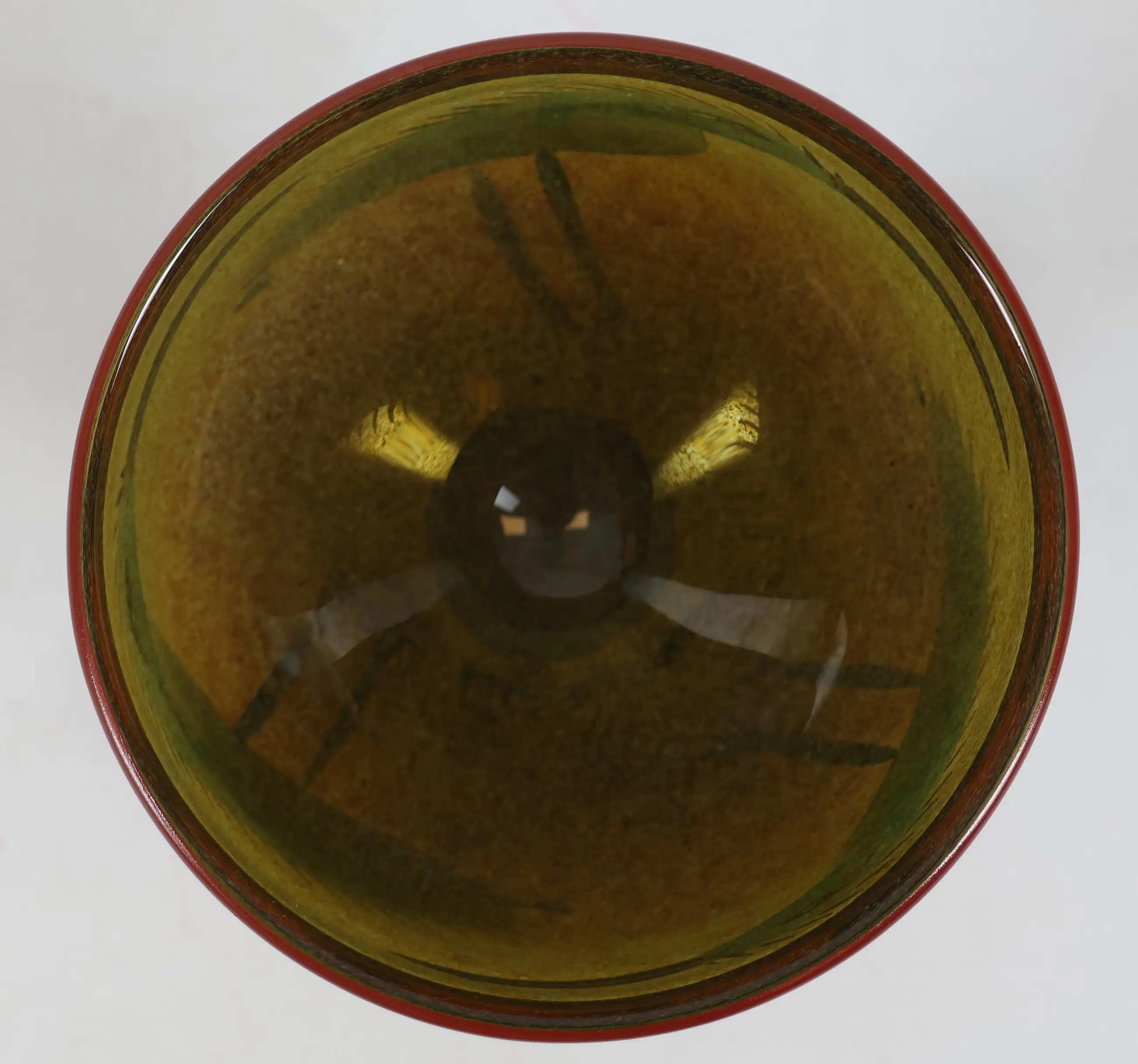 Het gaat hier om een kunstglazen kelk/vase op voet, uitgevoerd in meerkleurig glas met handbeschilderde decoratie. Het opschrift en etiket bevestigen dit: