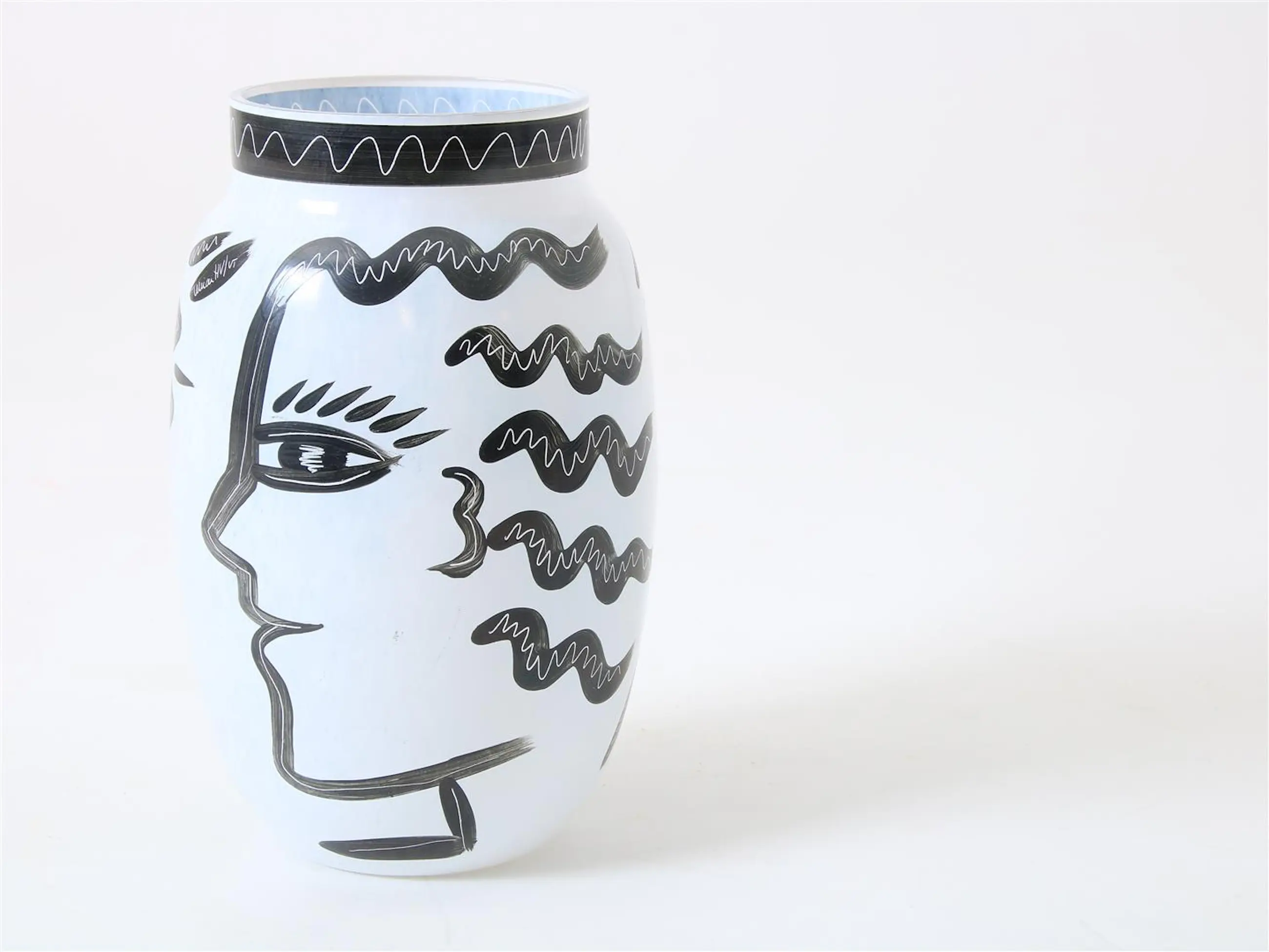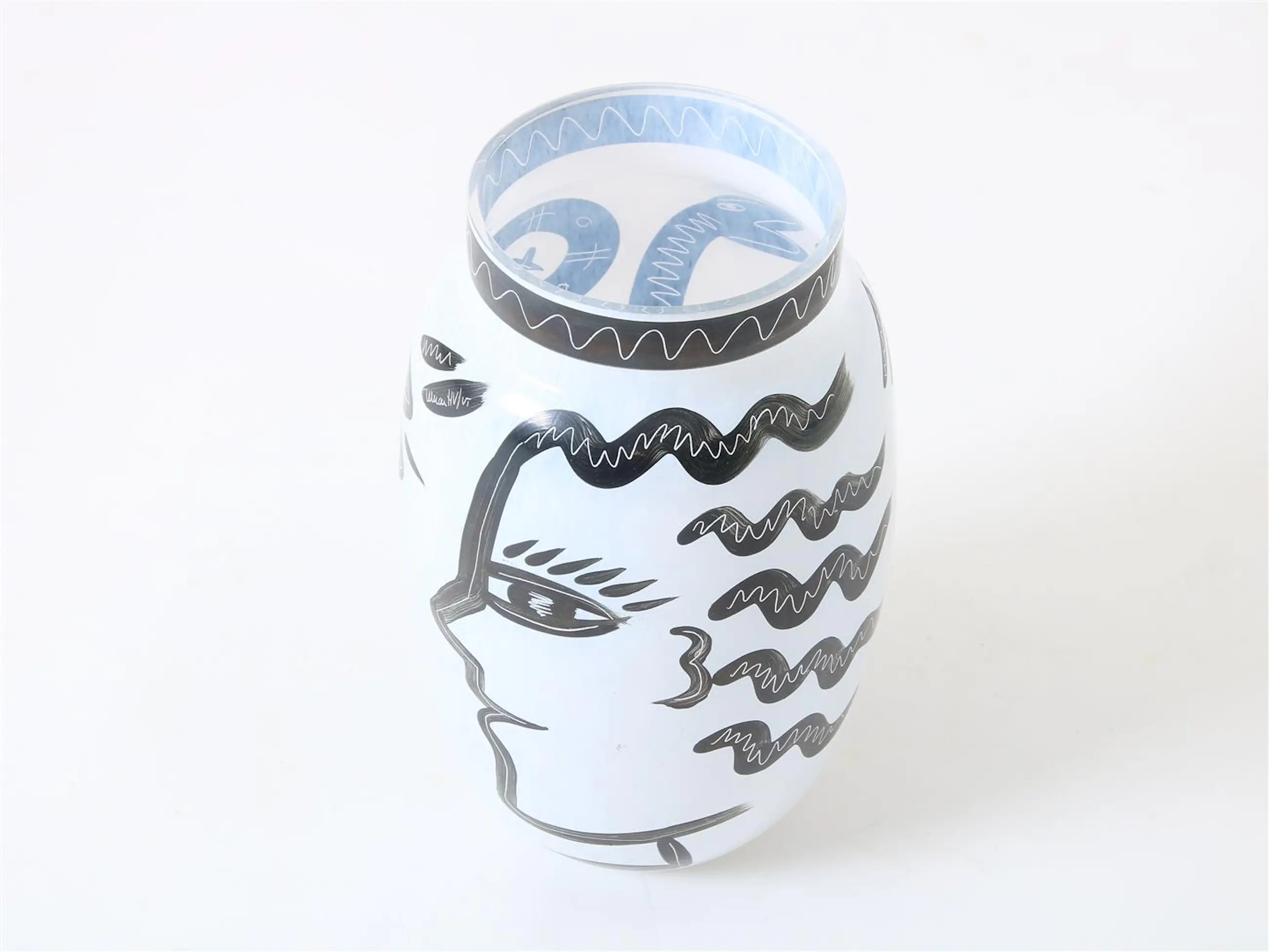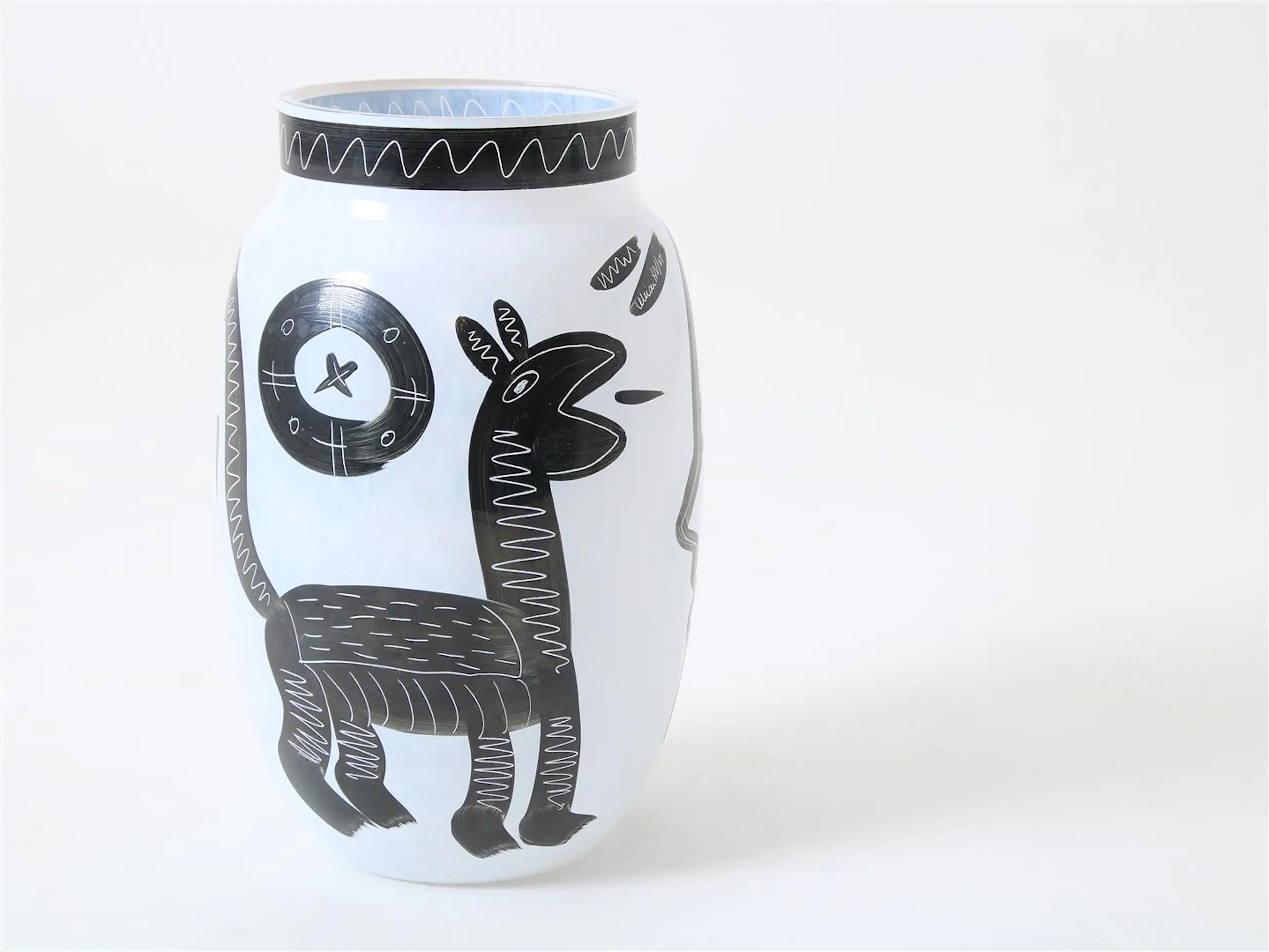 Matglazen design vaas met decor van gezicht en dier, gesigneerd Ulrica Hydman-Vallien (1938-2018), uit de serie "Caramba" voor Kosta Boda,