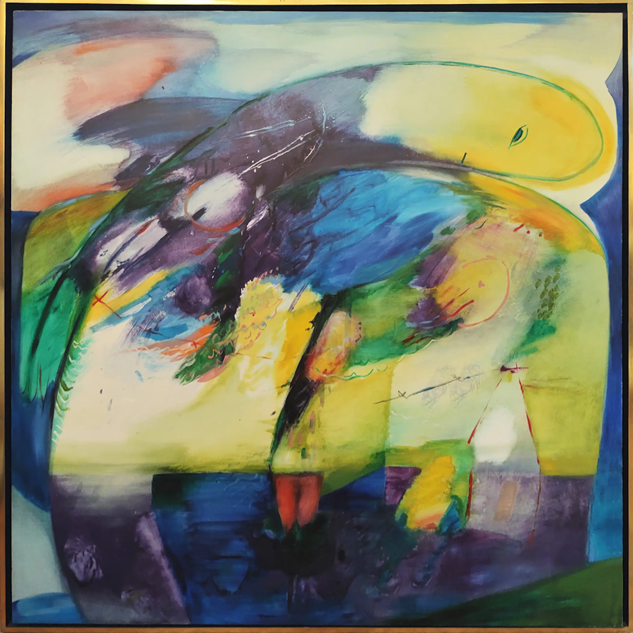 Groot abstract werk op doek van Unamore (Marijke van Velzen). Het werk is achterop gesigneerd met 'Marijke van Velzen'.