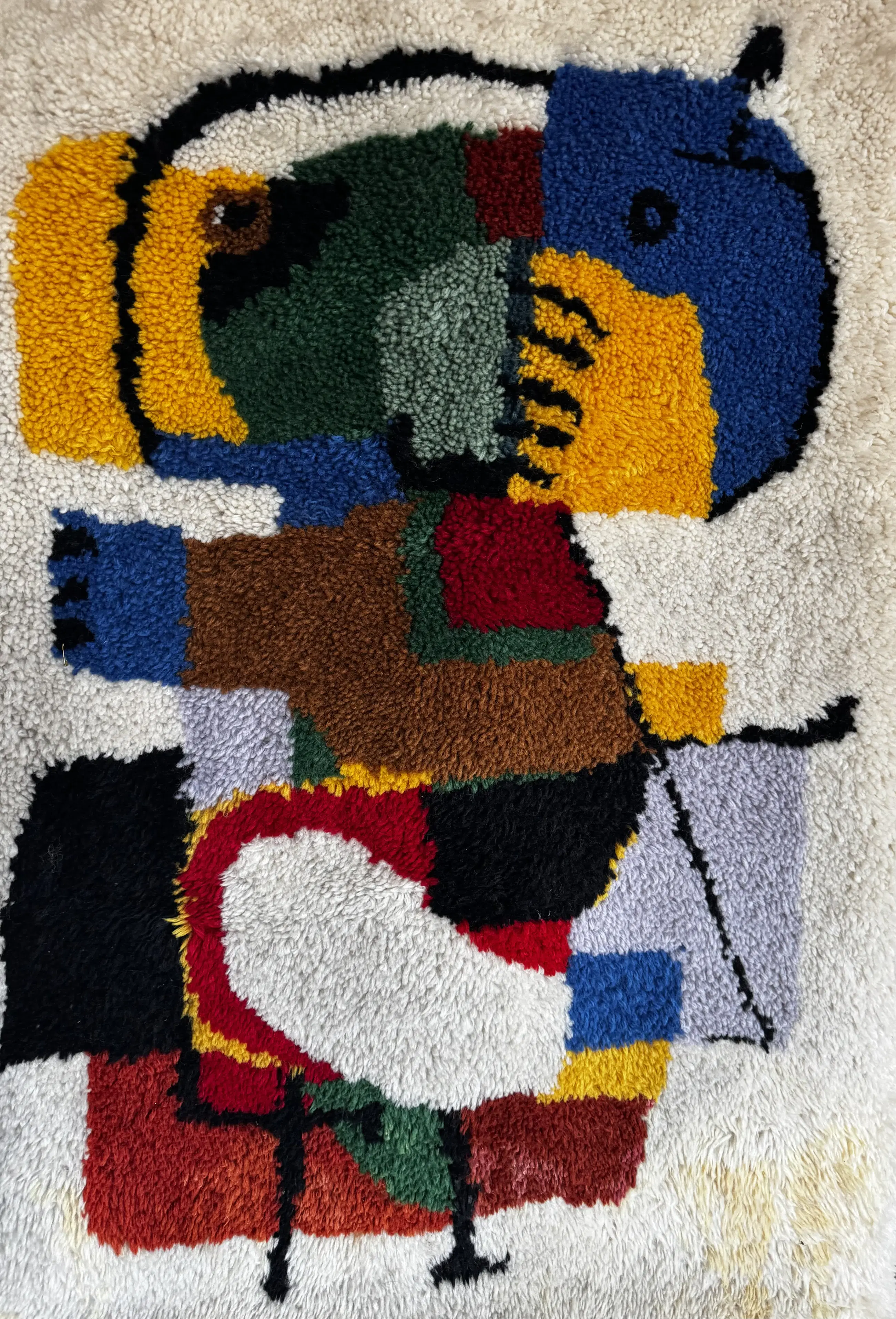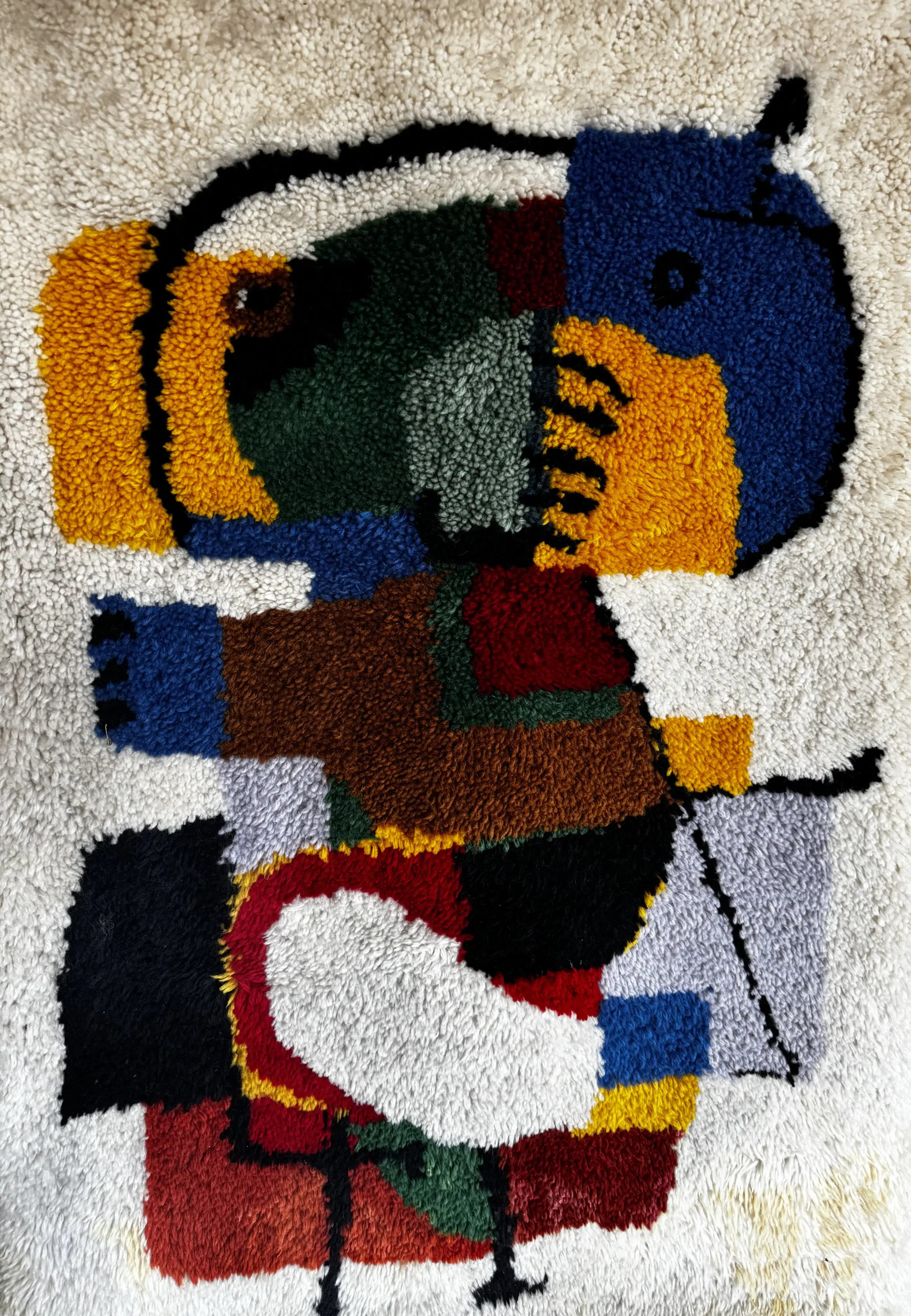 Wandkleed met abstracte figuur. Kleurrijk. Volgens de laatste eigenaar is samenwerking met Jan Wolkers gemaakt. Hiervoor is helaas geen bewijs. Moet nog wel gereinigd worden voor het mooiste resultaat.