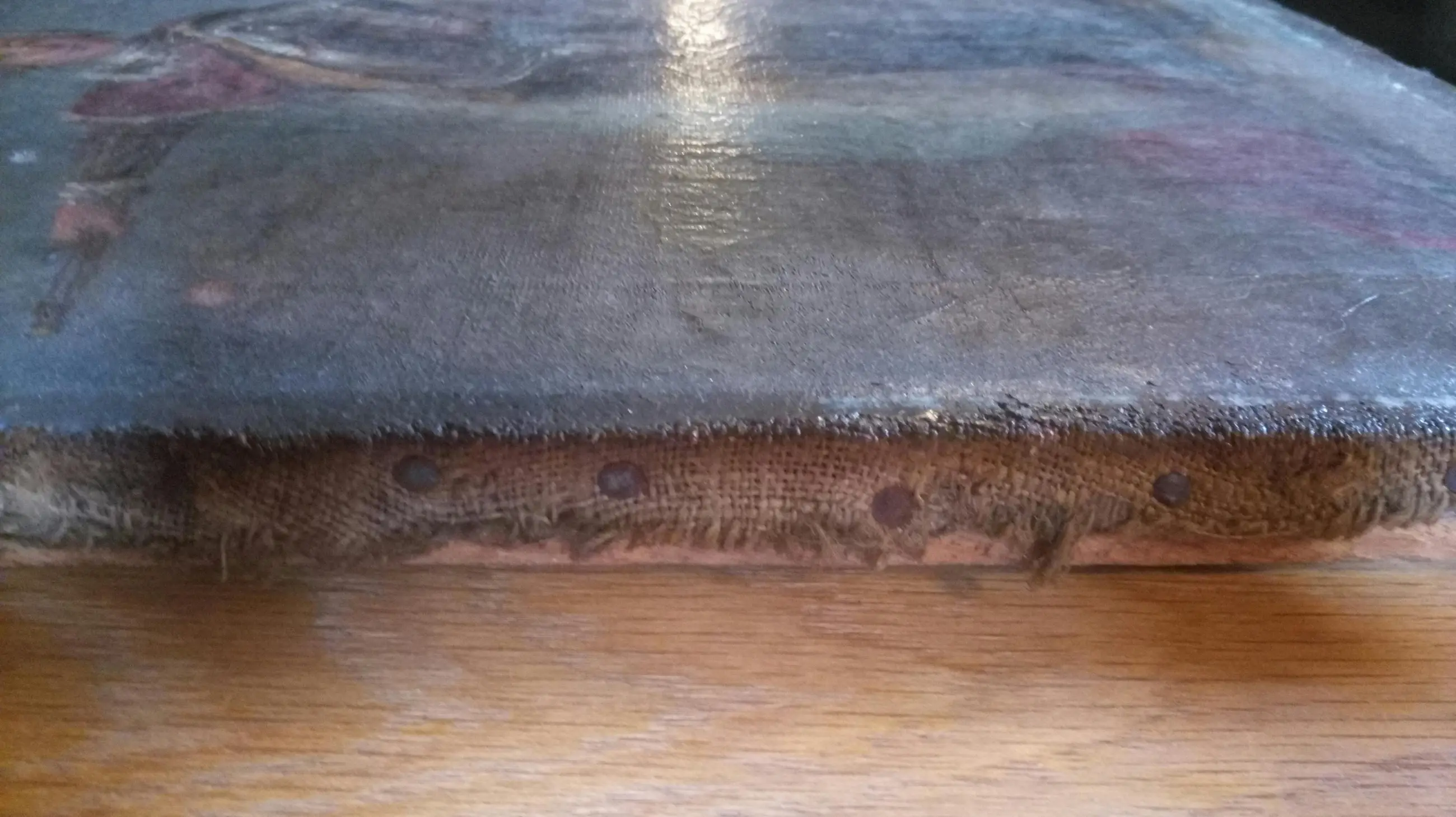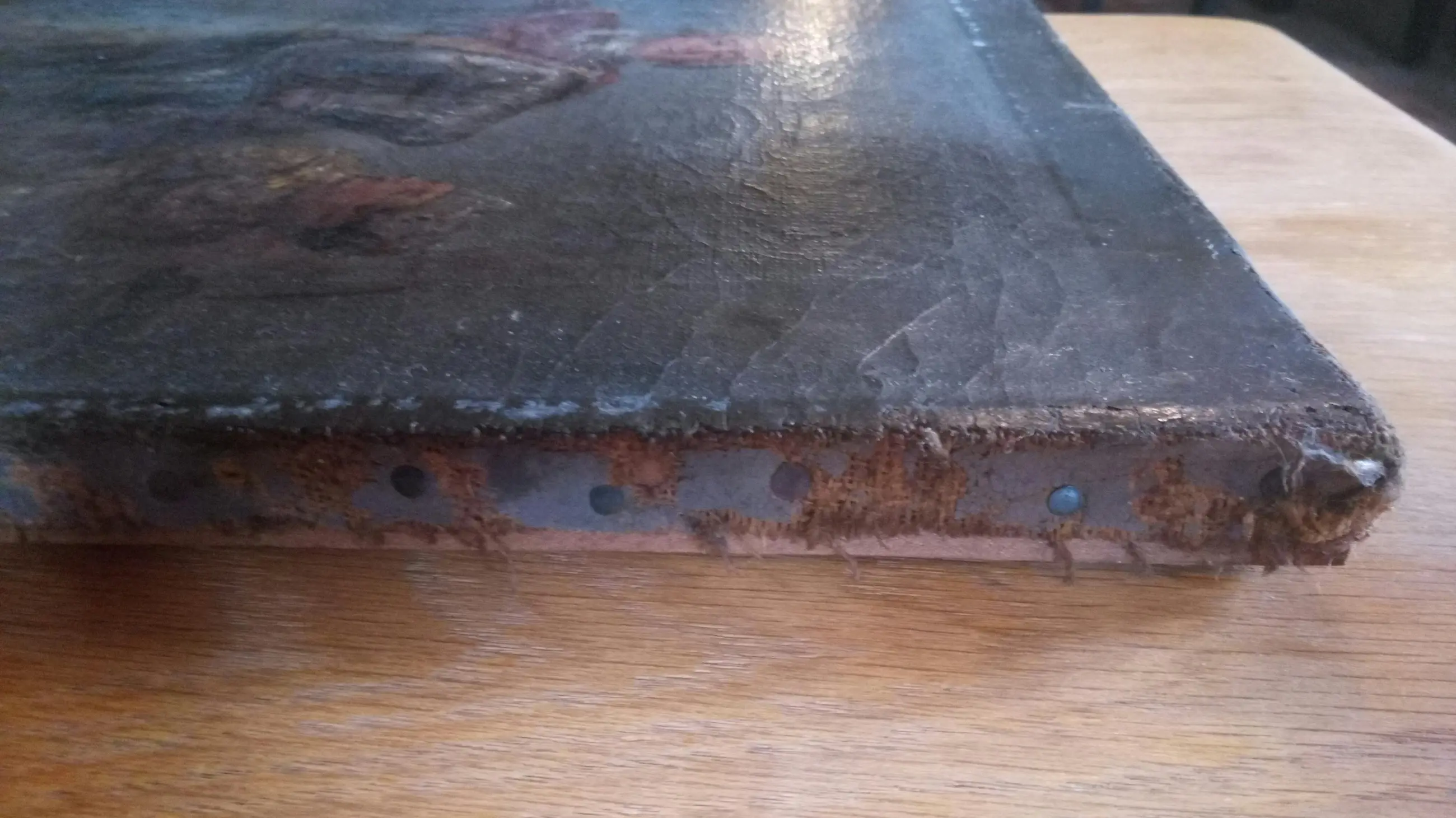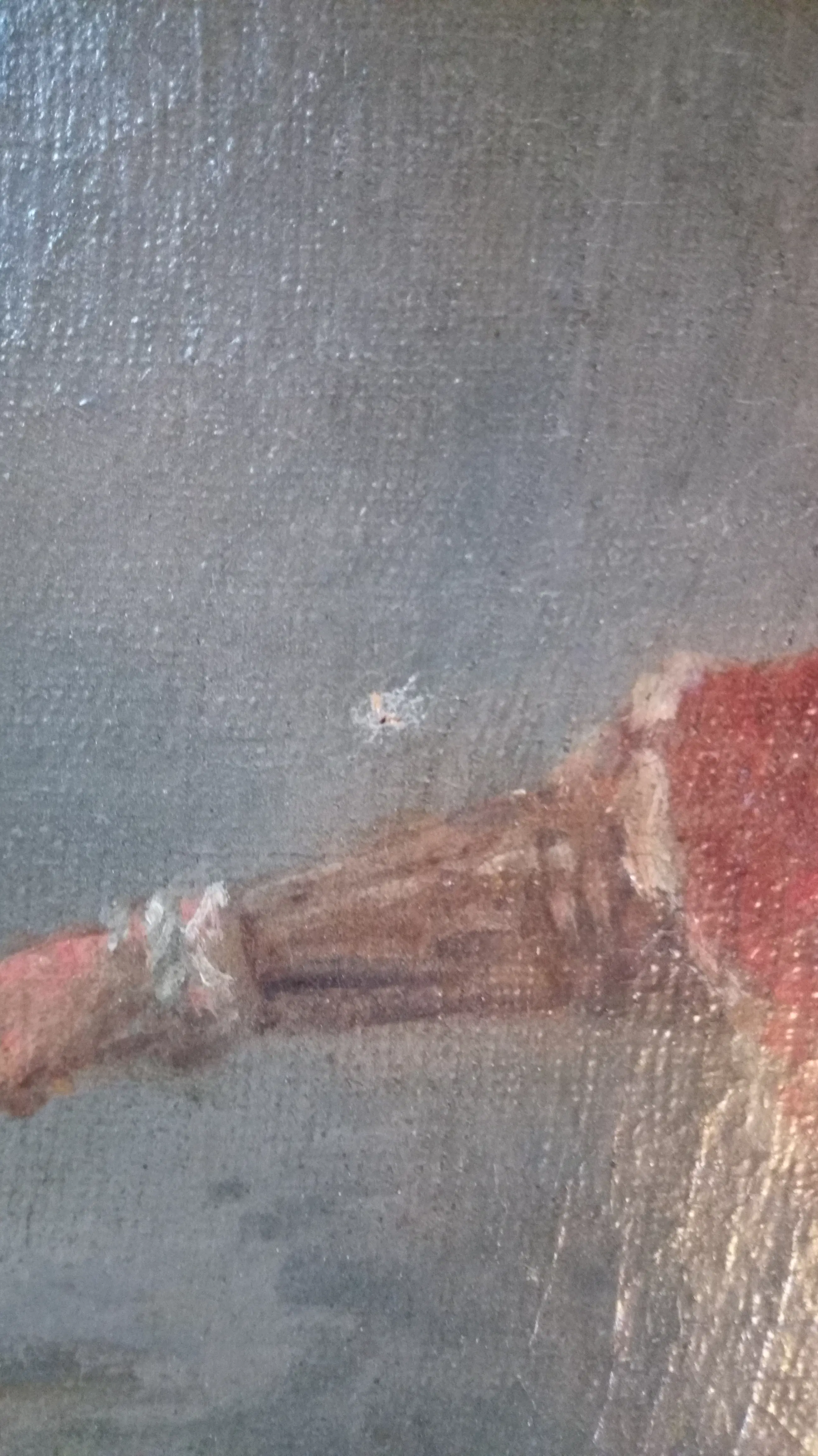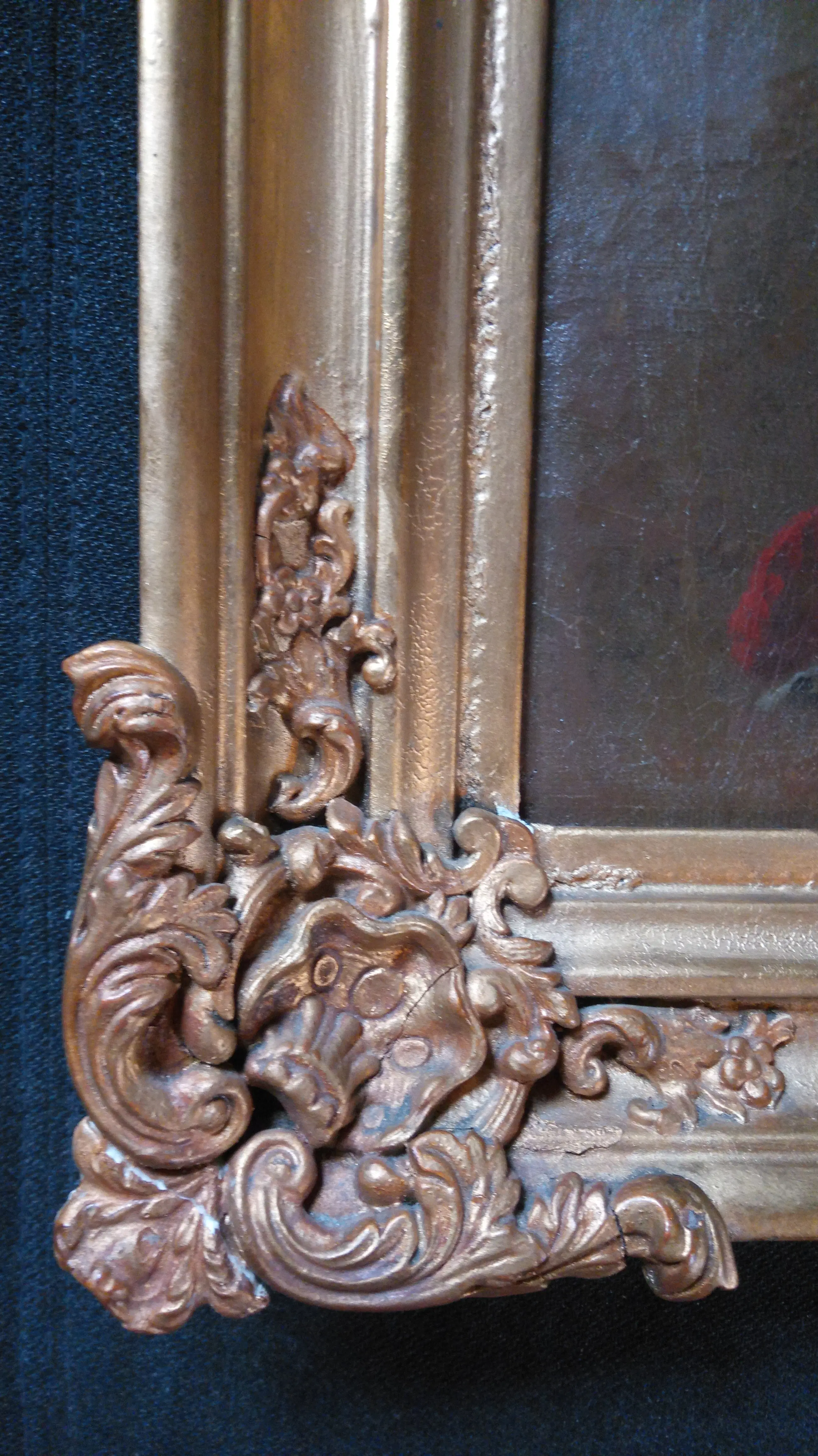Het schilderij/doek is oud, maar vertoont geen grote schade. Een klein plekje op het doek (boven de uitgestrekte arm, zie bijbehorende afbeelding) is licht beschadigd. De lijst, met zijn uitgebreide versieringen, vertoont diverse tekenen van schade, zoals verlijmde onderdelen op de hoeken en ontbrekende kleine stukjes (zie ook detailfoto's).