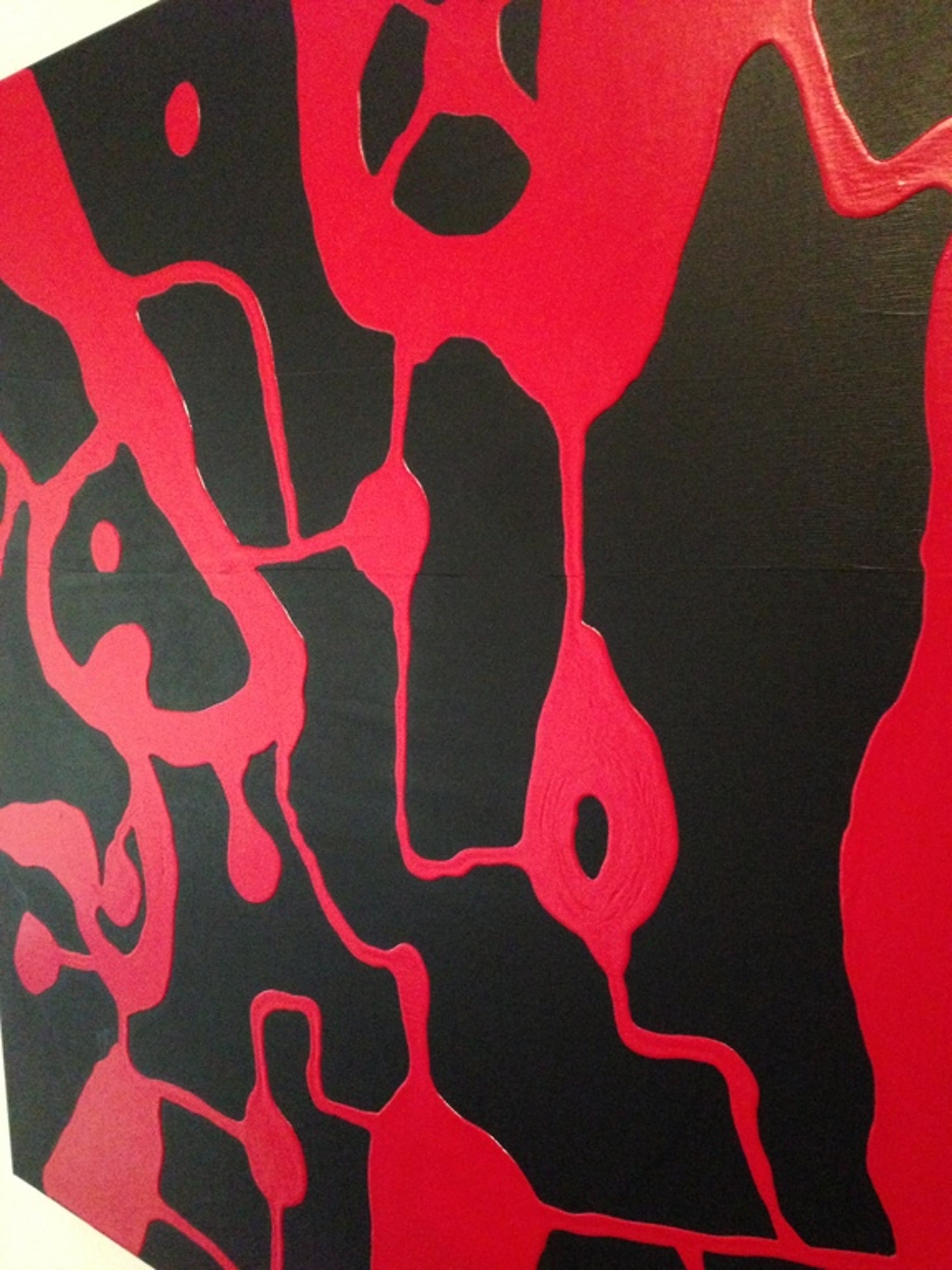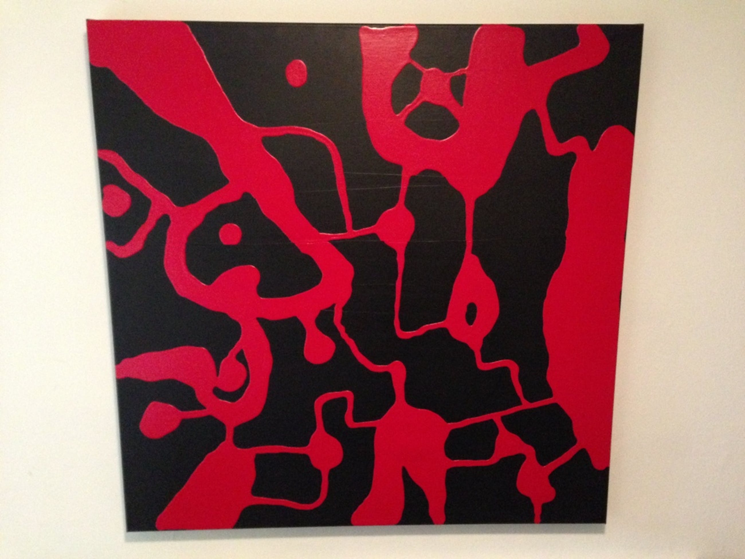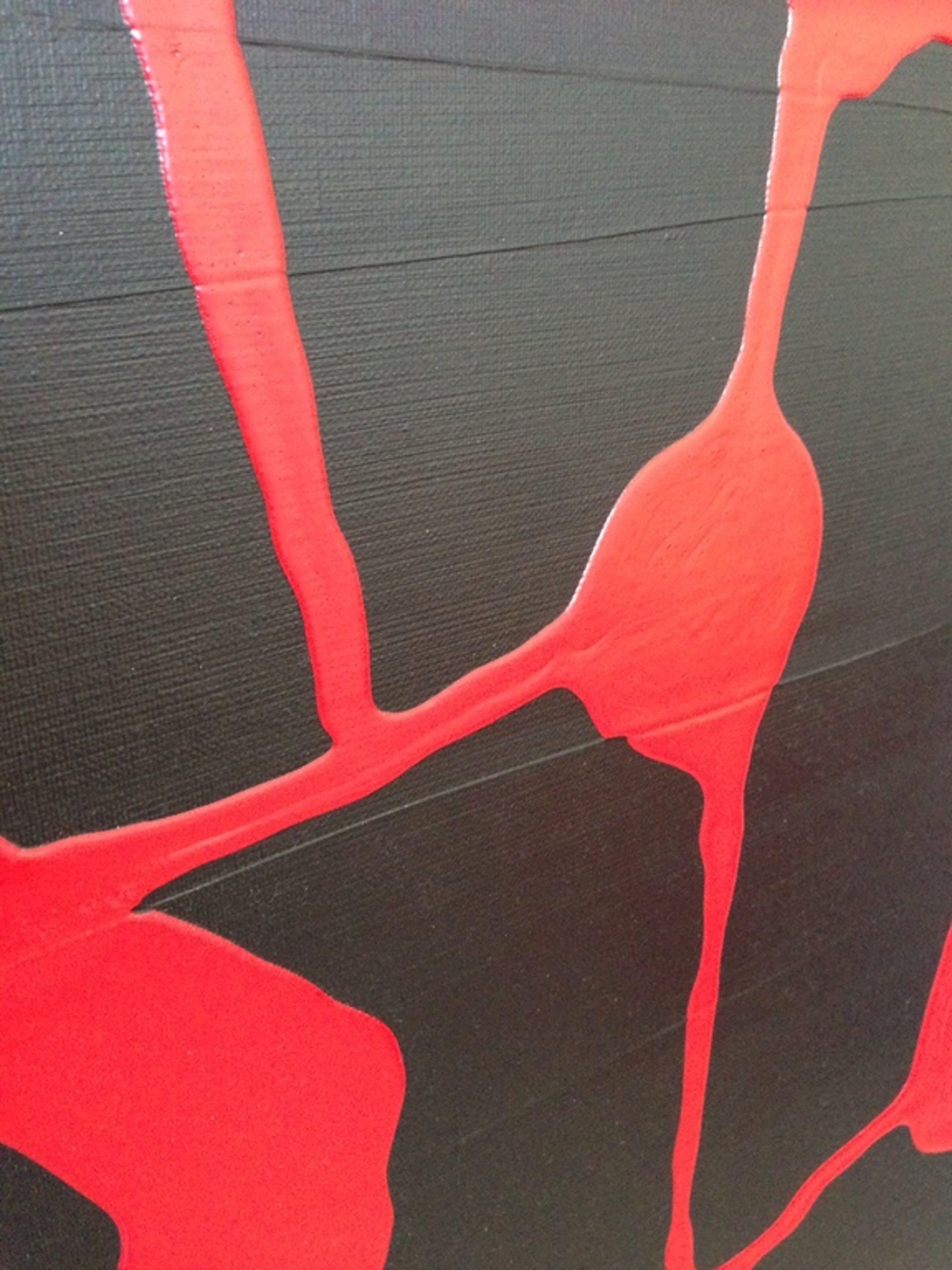 Techniek: zijn nieuwe 'schenk techniek'= verf vanuit een theepot op het doek glooien