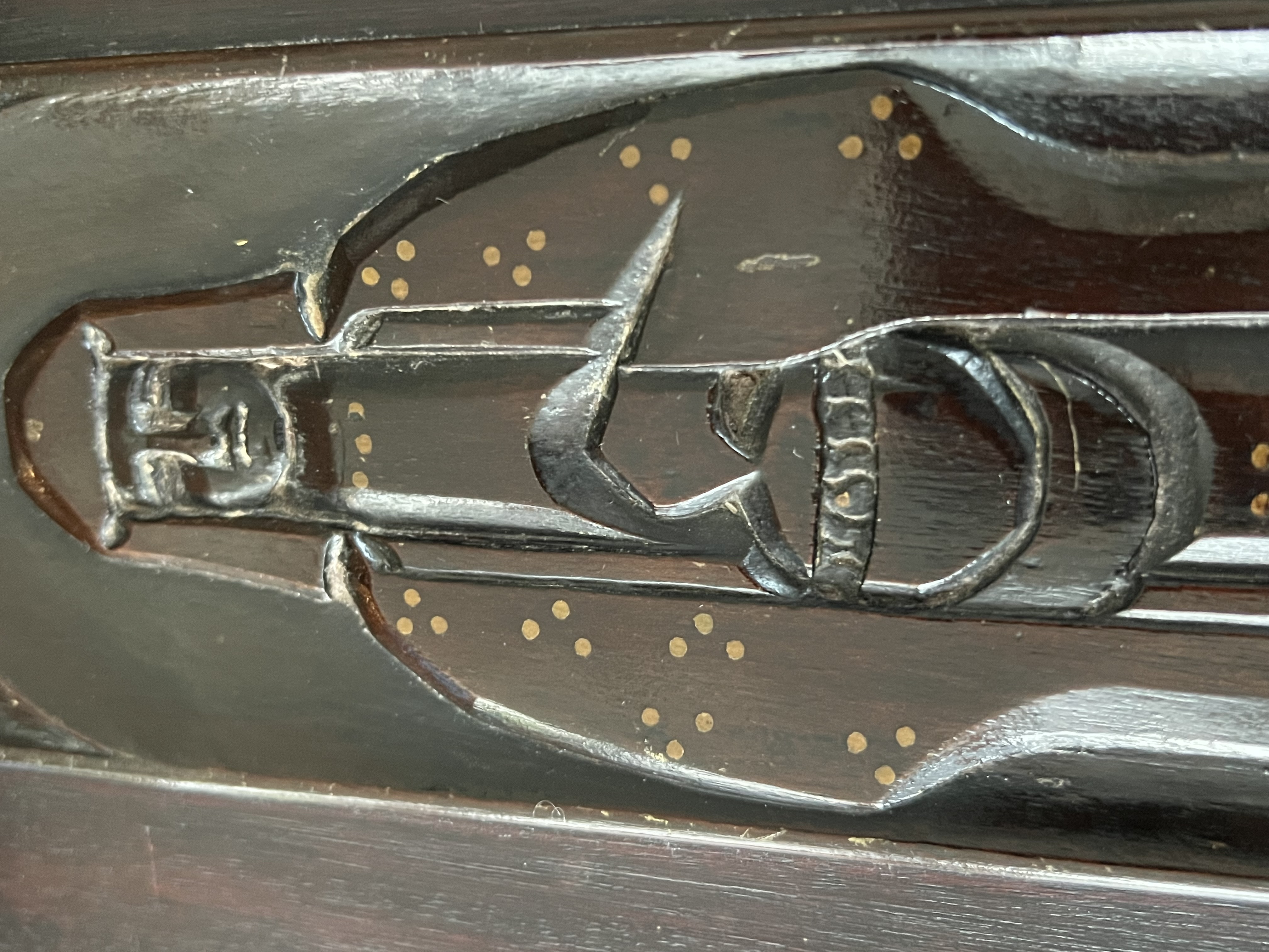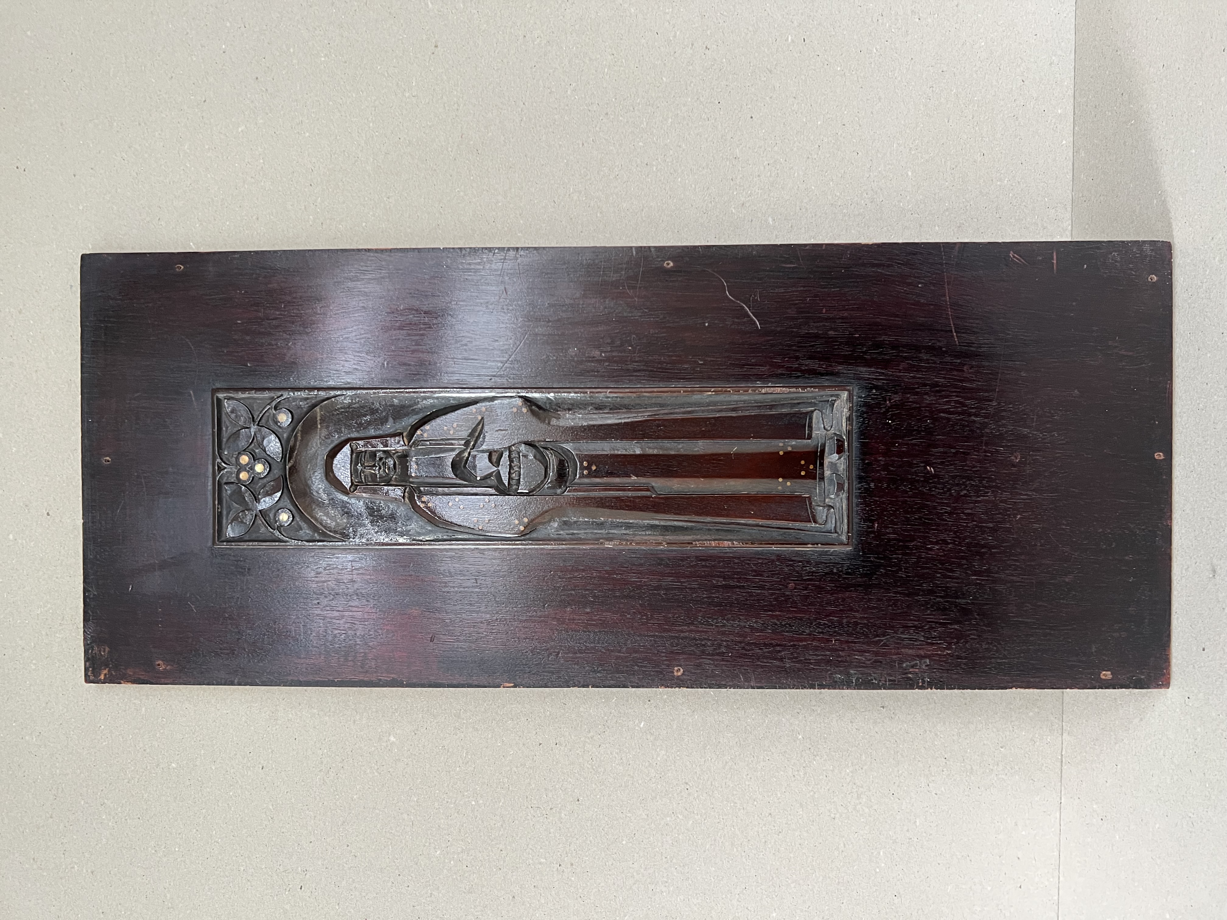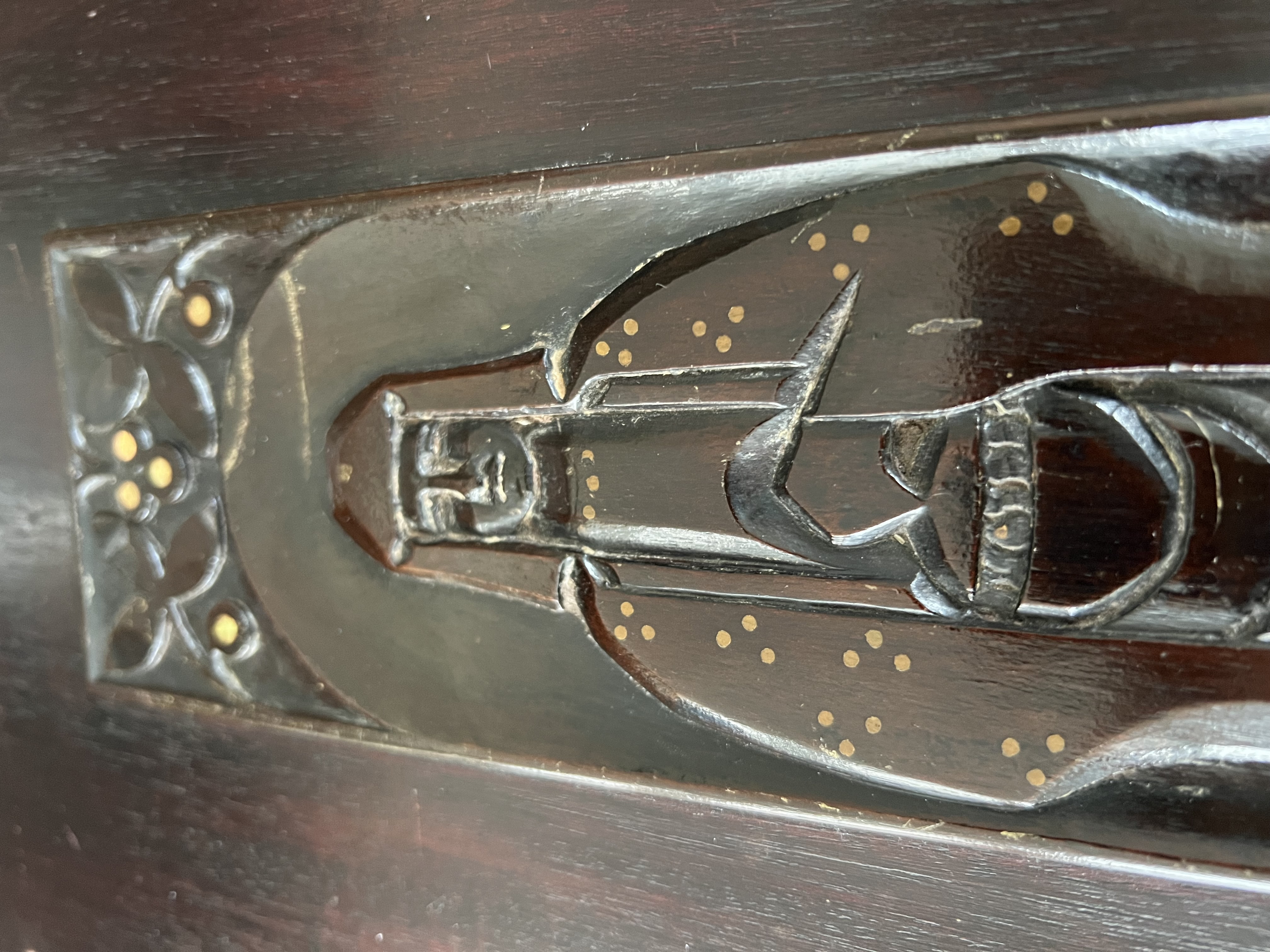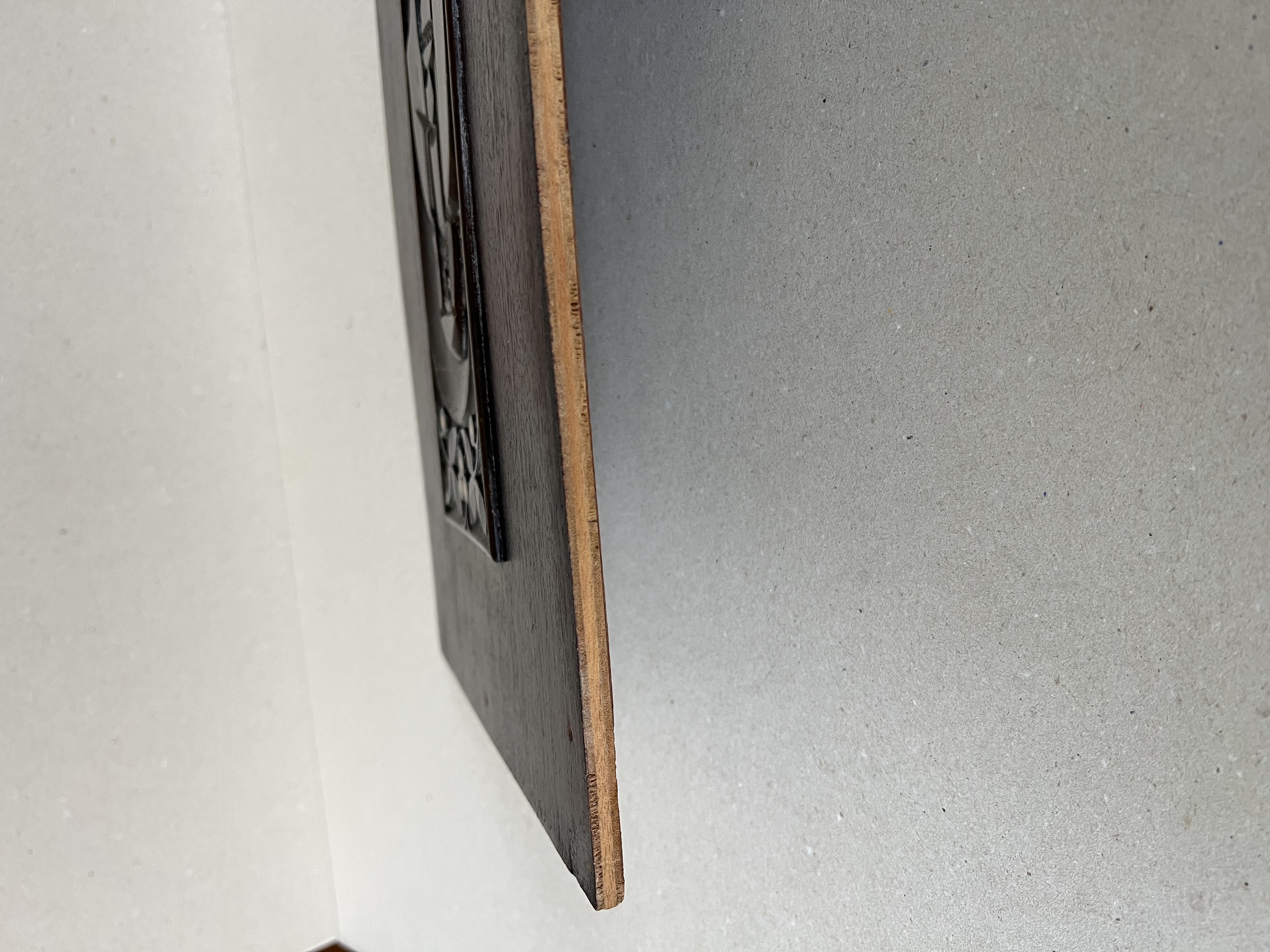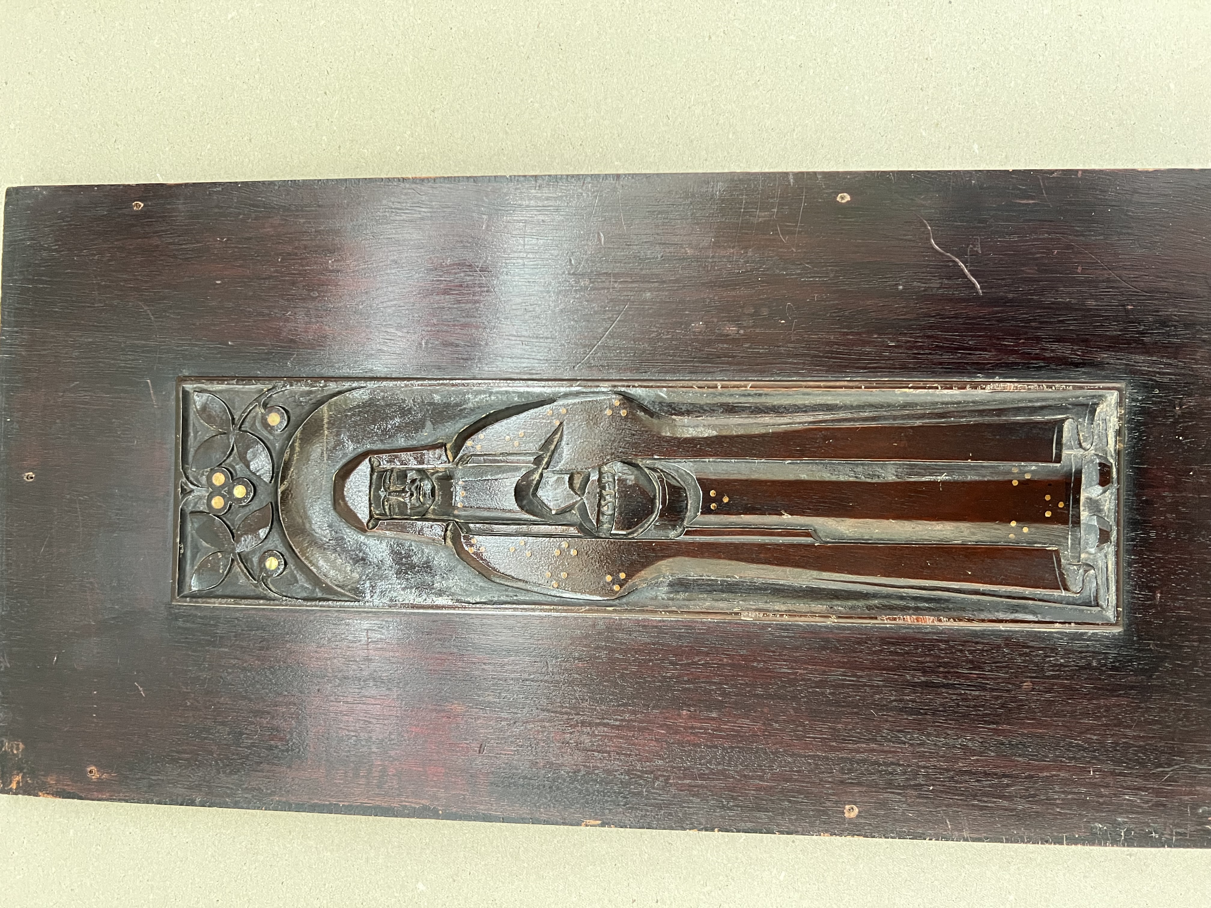 Art Deco Paneel houtsnijwerk opgelegd op multiplex ingelegd met parelmoer Maker onbekend. Een uniek stuk
