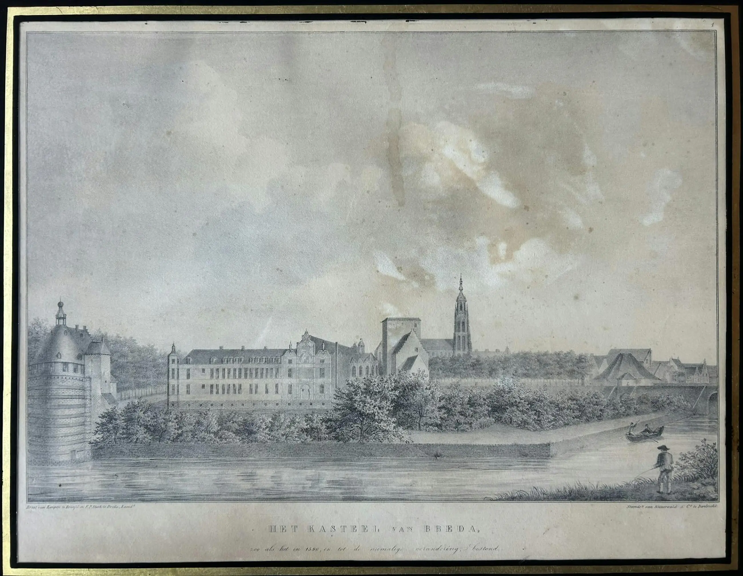 Uitgegeven ter gelegenheid van de restauratie van het kasteel van Breda in 1830 Datering: Circa 1830-1847 Uitgevers: Brest van Kempen (Brussel) en F.P. Sterk (Breda) Drukker: Steendruk (lithografie) Afmetingen: Ongeveer 33 x 43 cm Niet genummerd