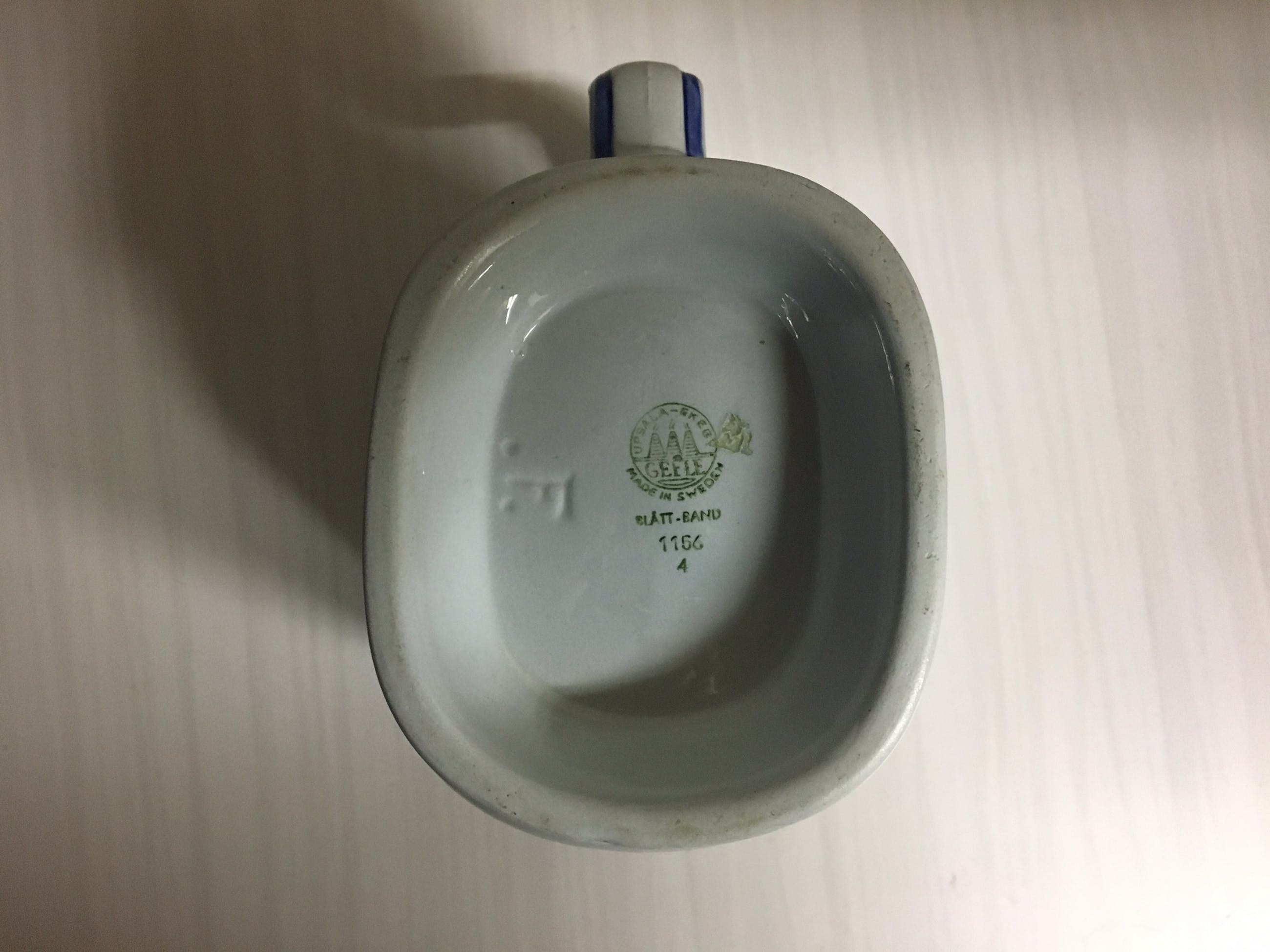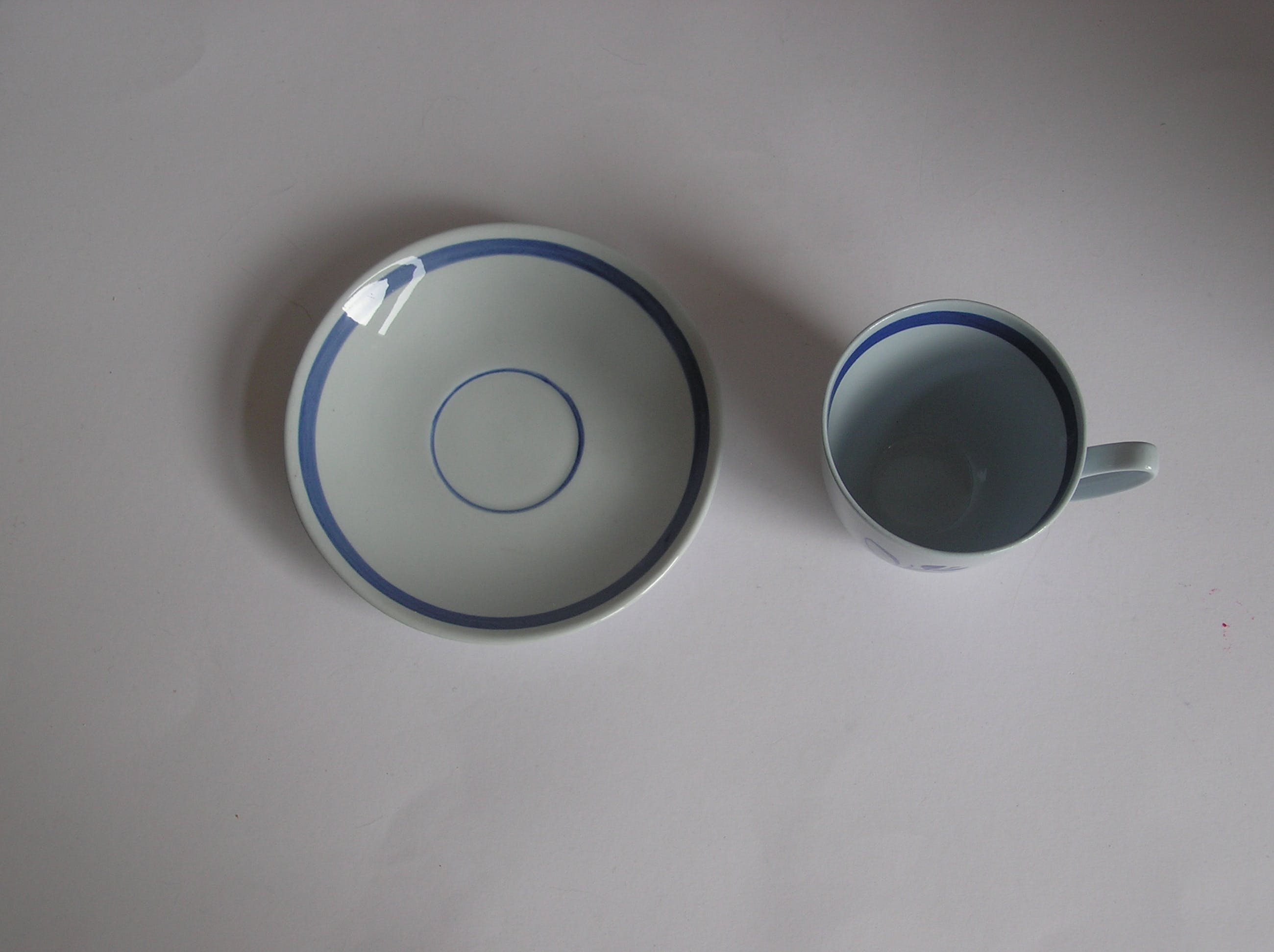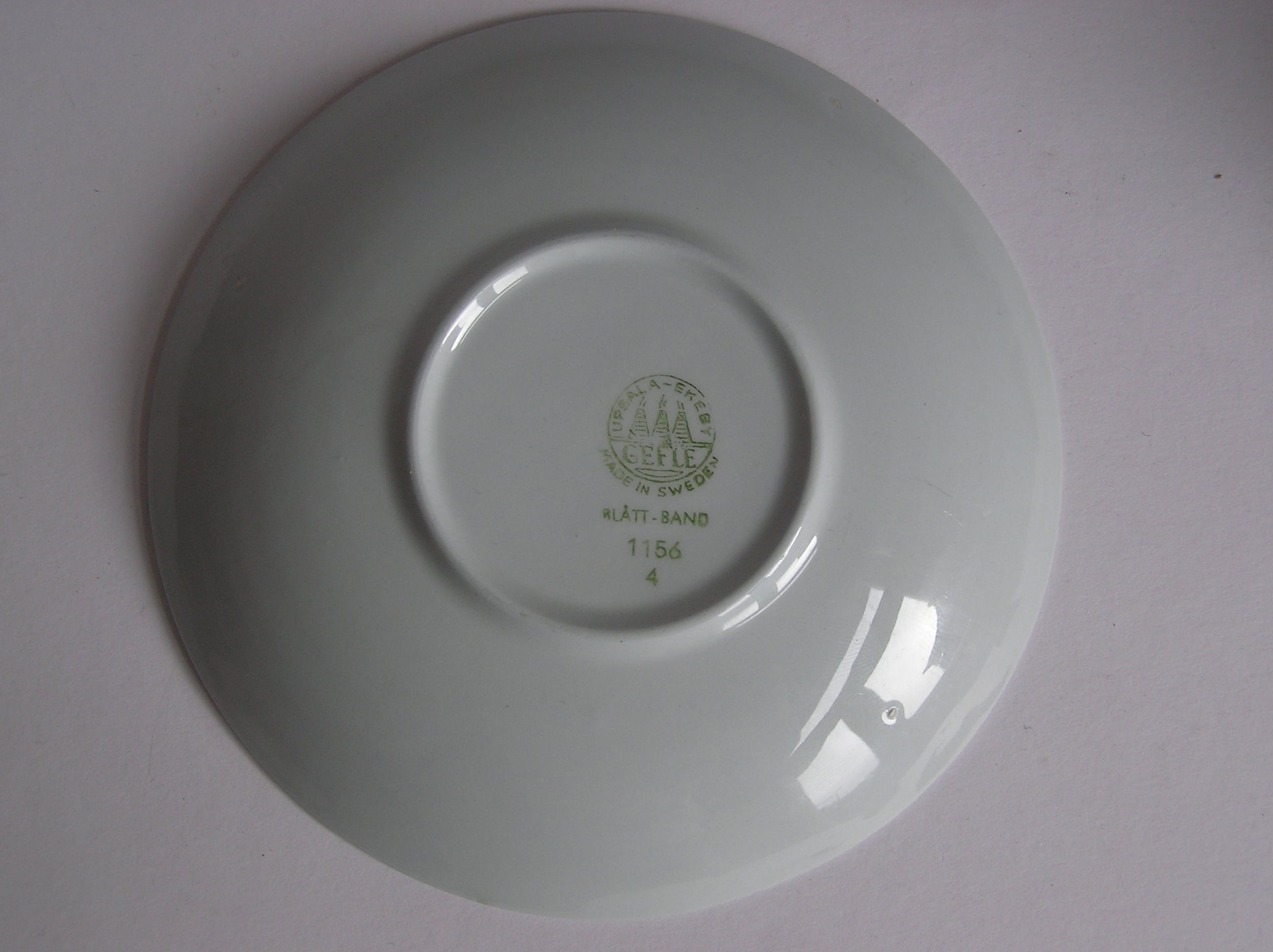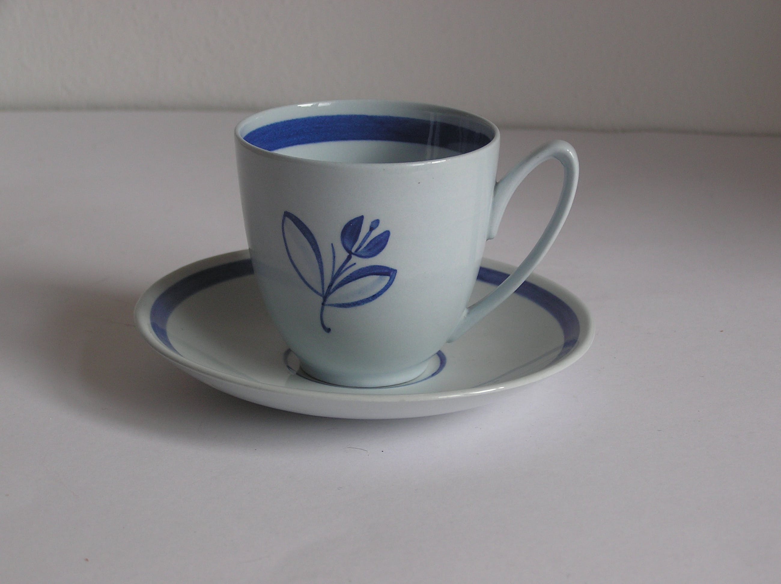 Upsala Ekeby Gefle demitasse cup and saucer. The Blatt band range was designed by Arthur Percy in 1930 for the world exhibition in Stockholm Sweden. The name Blatt band stands for the band of blue colour, the only colourway this design is available in. The items are all handpainted, so not one cup and saucer is exactly the same as another. In excellent condition, see pictures. Excellent Christmas gift or anniversary present.Size cup: