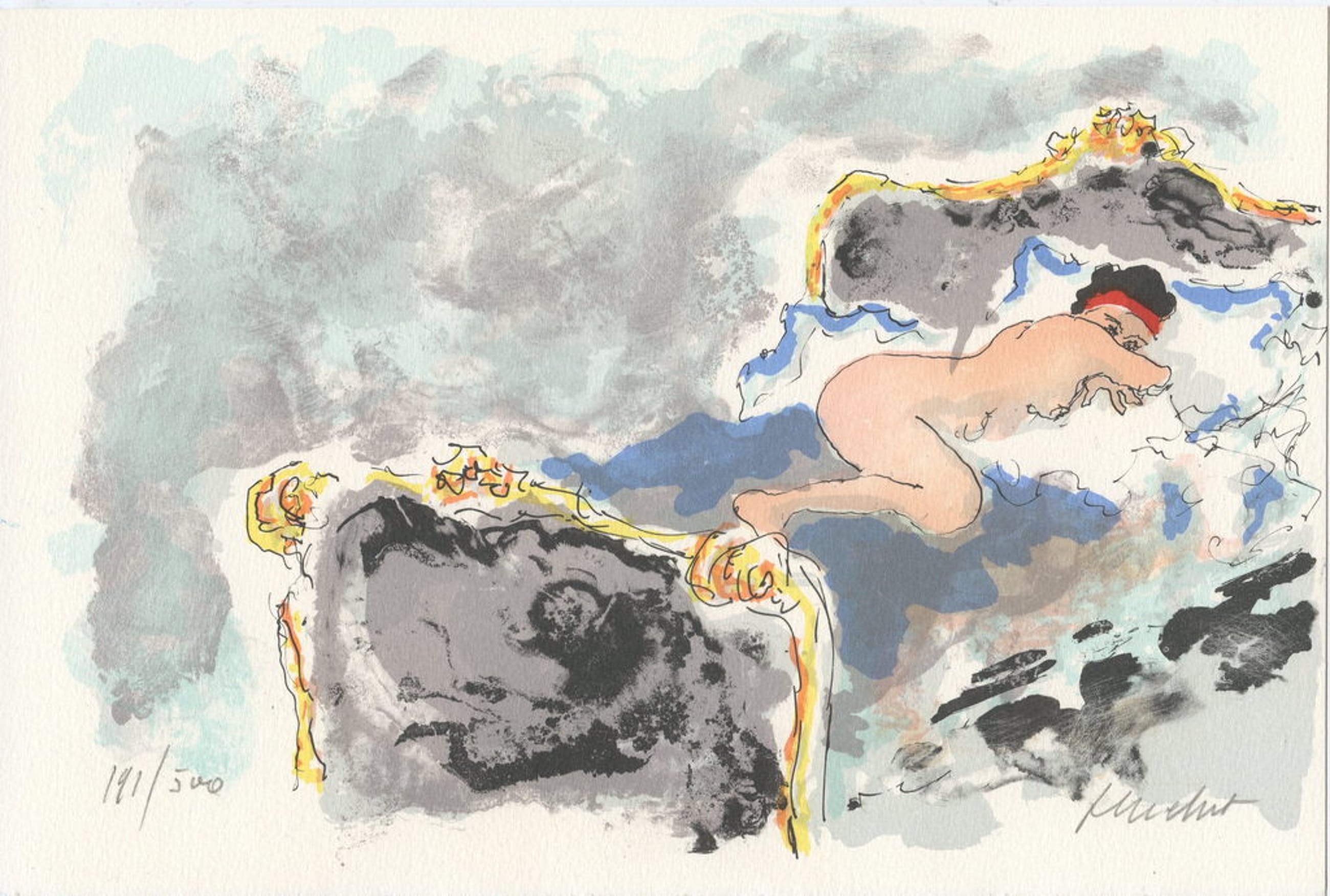 Kleurenlitho, genummerd 145/500 linksonder en gesigneerd rechtsonder met potlood Huchet: voorstelling "De zwarte verleidster", van de Franse kunstenaar Urbain Huchet.