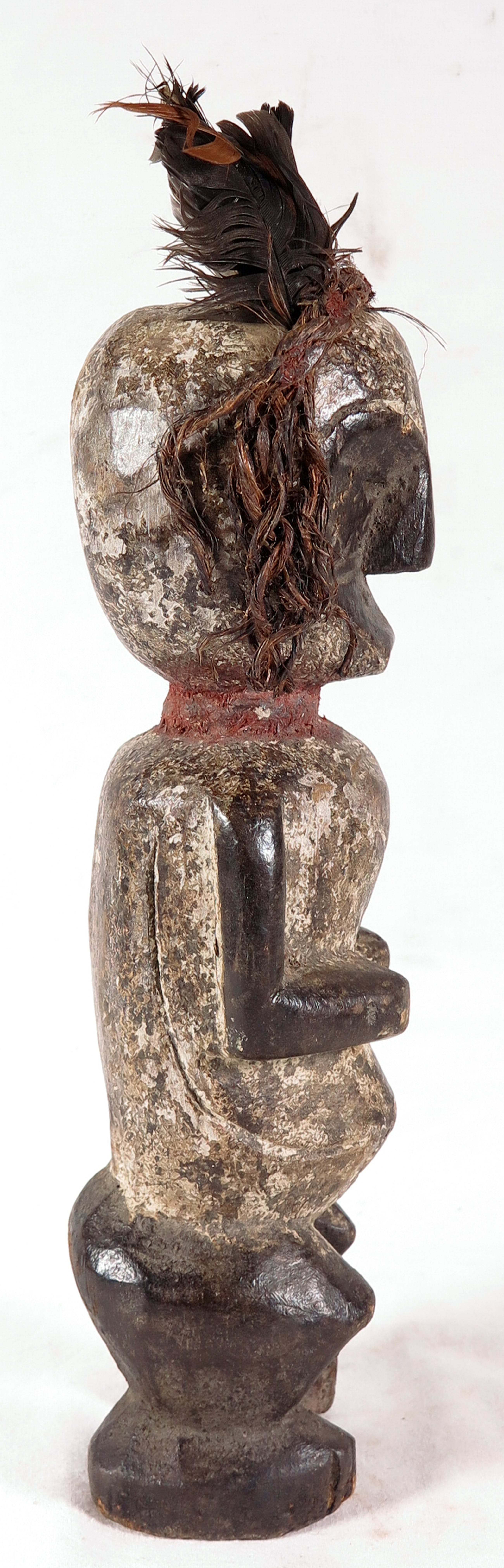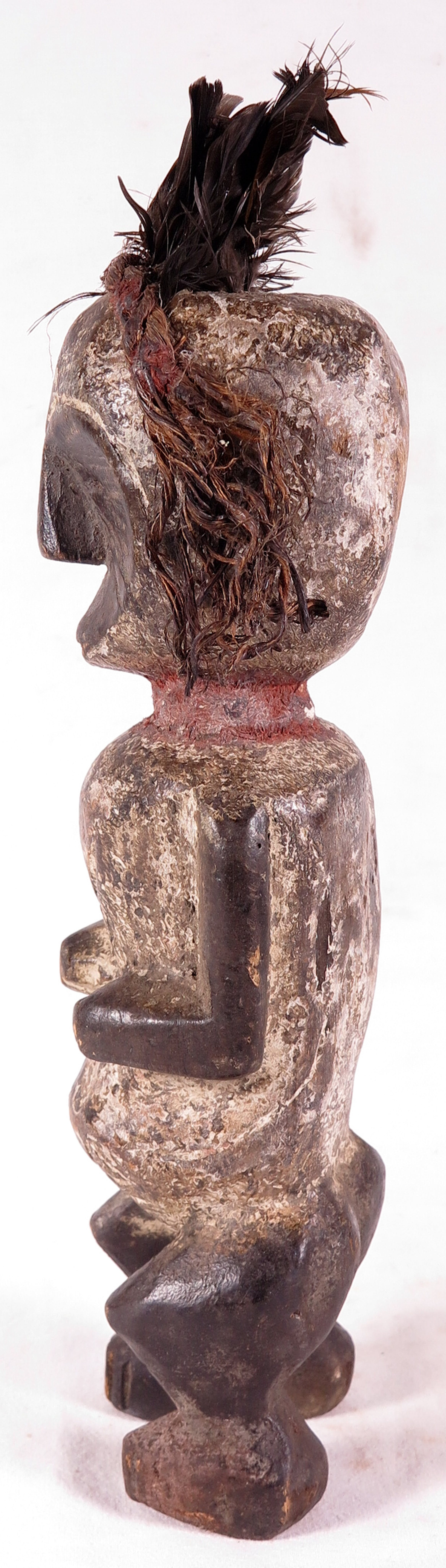 | Lichte gebruikssporen. Paar kleine scheurtjes in het hout. De veren en het touw op het hoofd zijn wat versleten. | |||||||||||