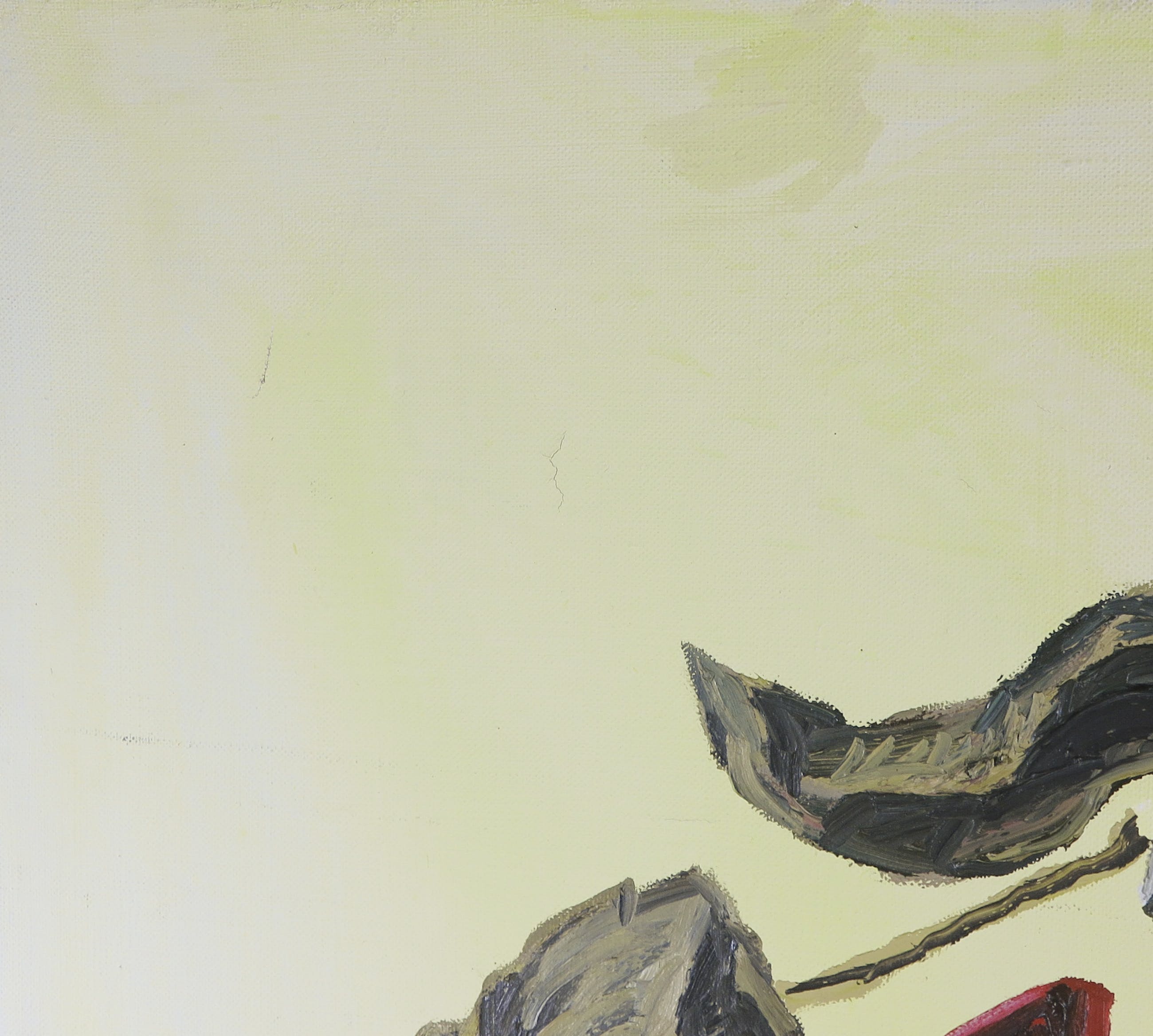 | Wat lichte slijtage langs de randen. Rechtsboven een scheurtje in de verflaag. | |