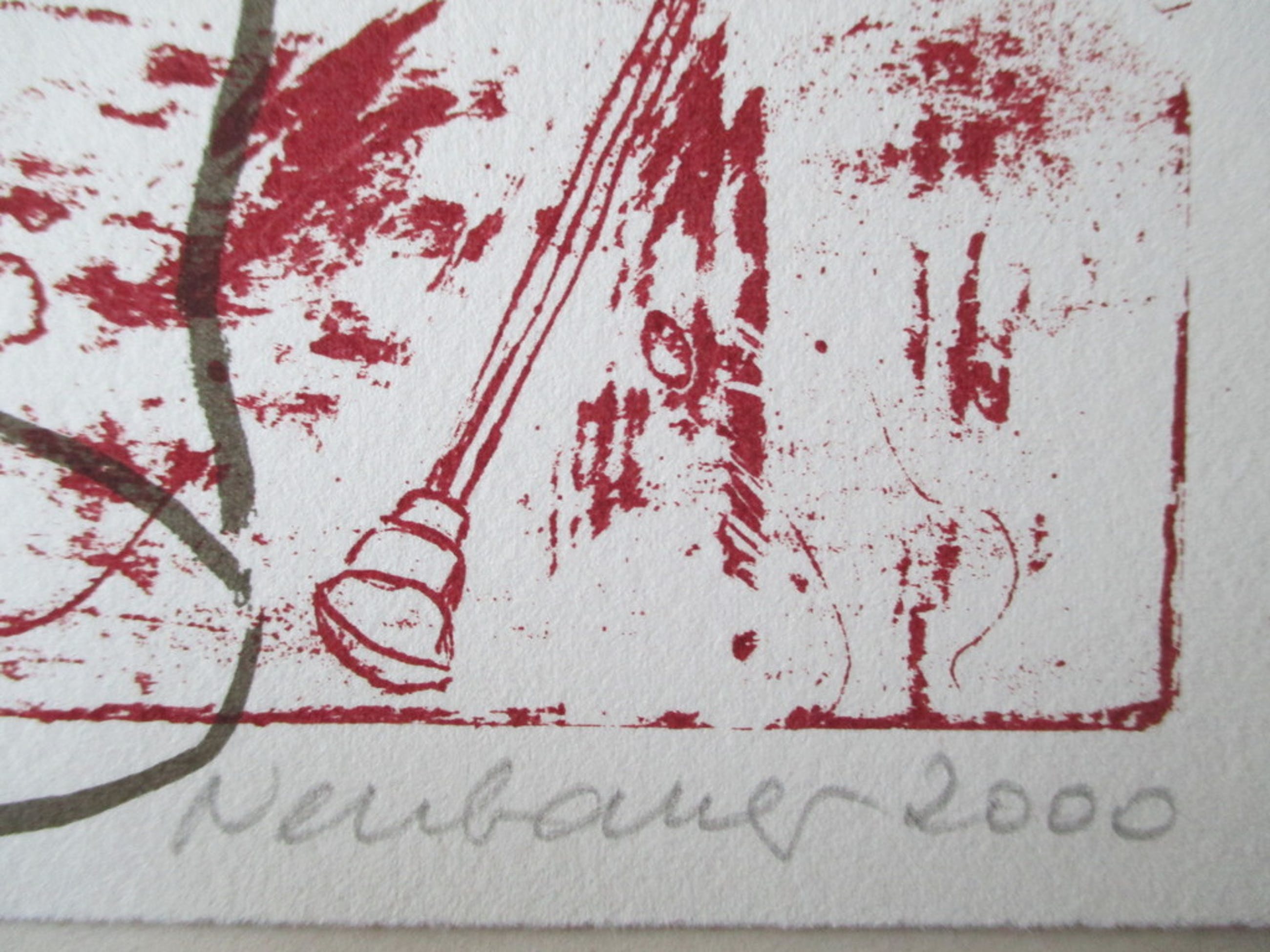 Zeefdruk van Ursula Neubauer uit 2000 op geschept papier, met de titel "Over flamingo's dromen", genummerd 41/100. Gesigneerd en genummerd in potlood. Afmetingen 29x29 cm. In perfecte staat. Wordt verstuurd tussen twee plaatjes. Aangetekend 10 euro, gewoon 8,50. Onaangetekend verzending is op risico van de koper.