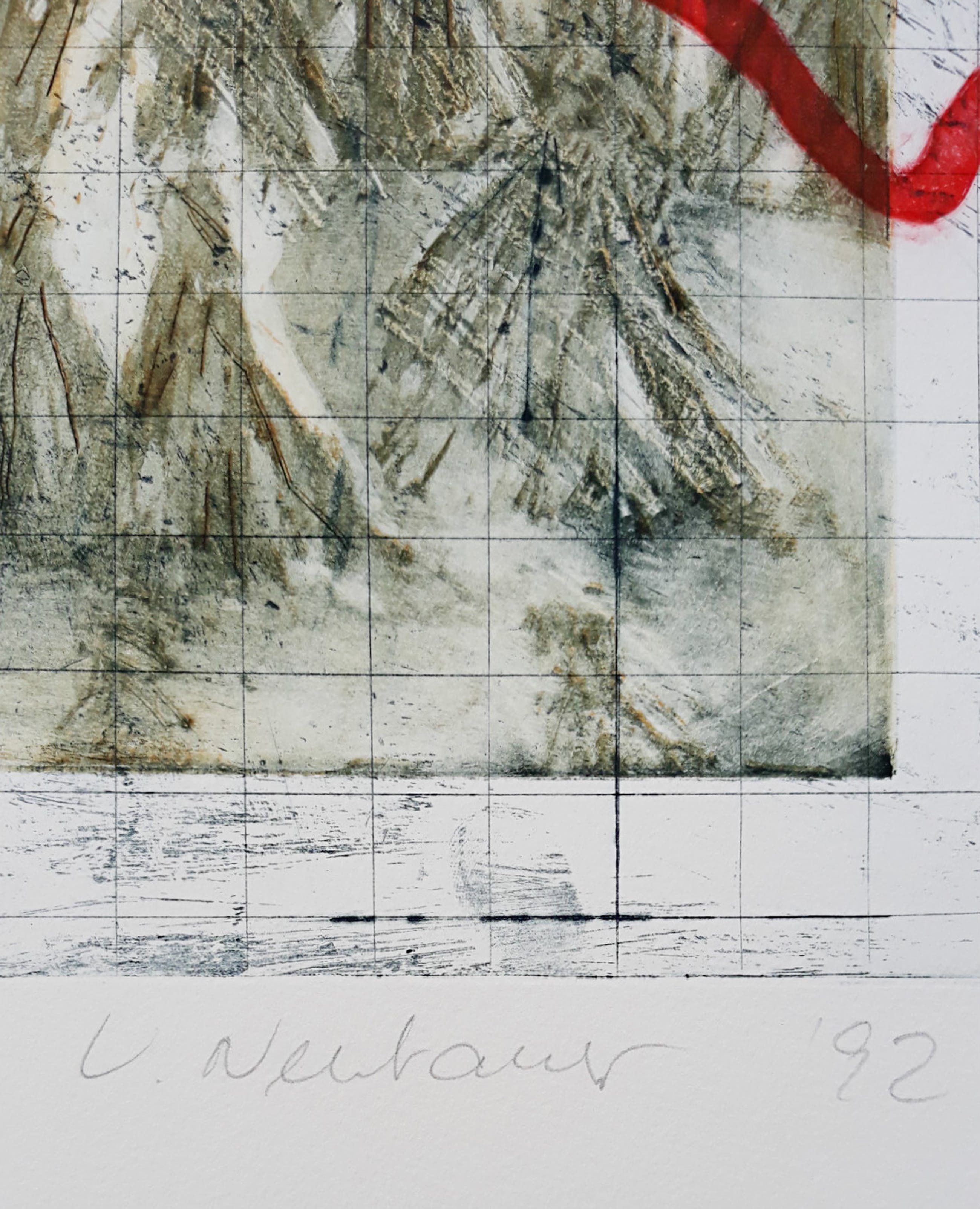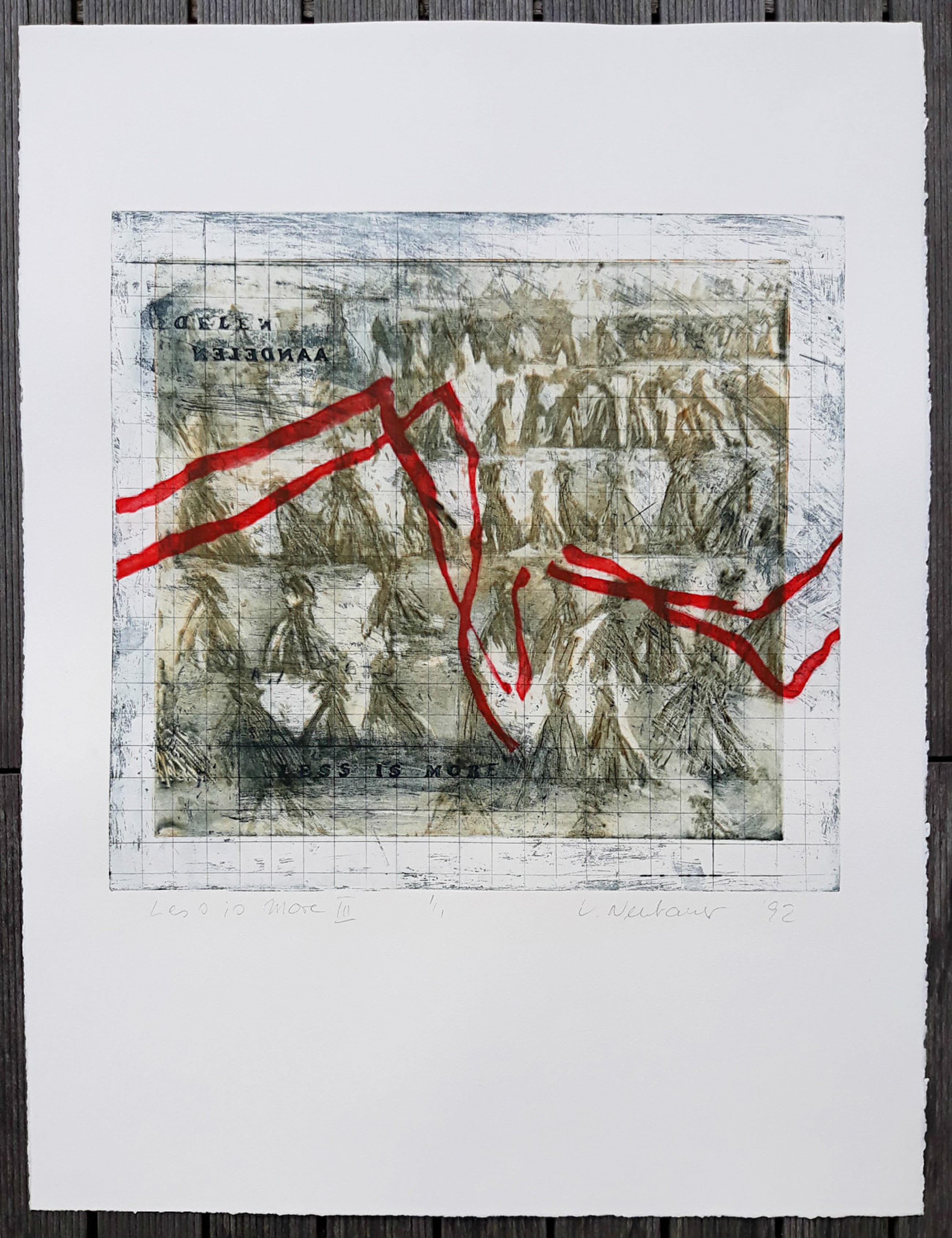 Karakteristiek werk van Ursula Neubauer. Aquatint ets op Arches papier, met potlood gesigneerd, gedateerd (‘92), getiteld en genummerd (1/1). Afkomstig uit de kunstcollectie van ABNAMRO, in mint conditie.