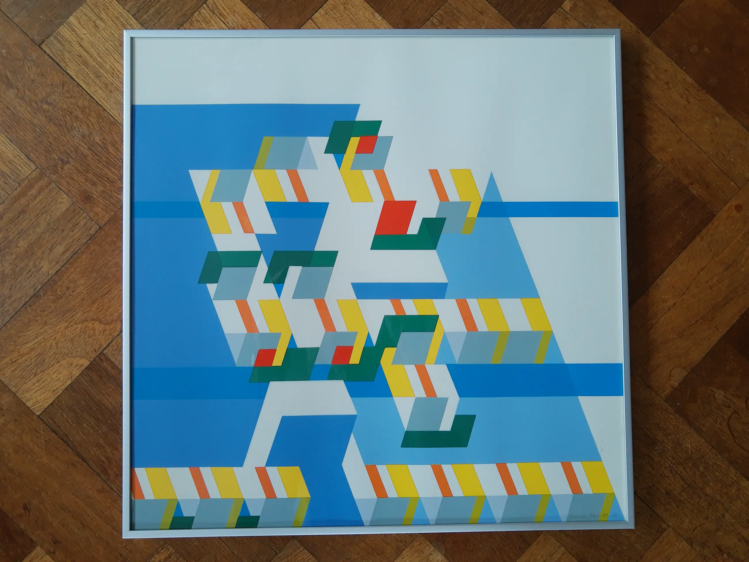 Mooie zeefdruk in heldere kleuren. Met potlood getekend: Ursula Pless '89 IX. In aluminium lijst.