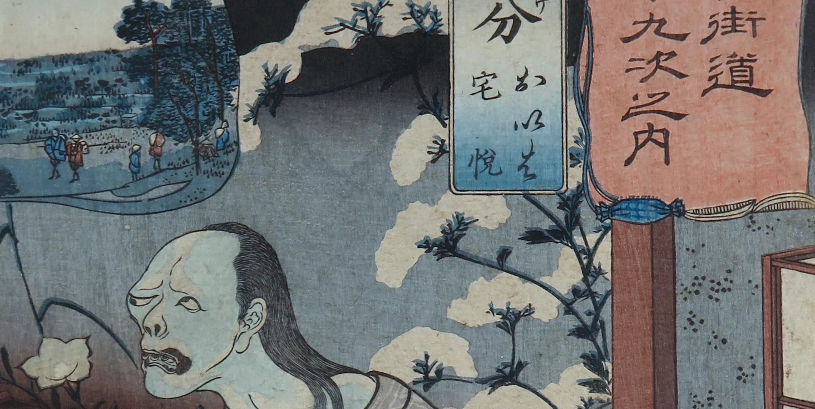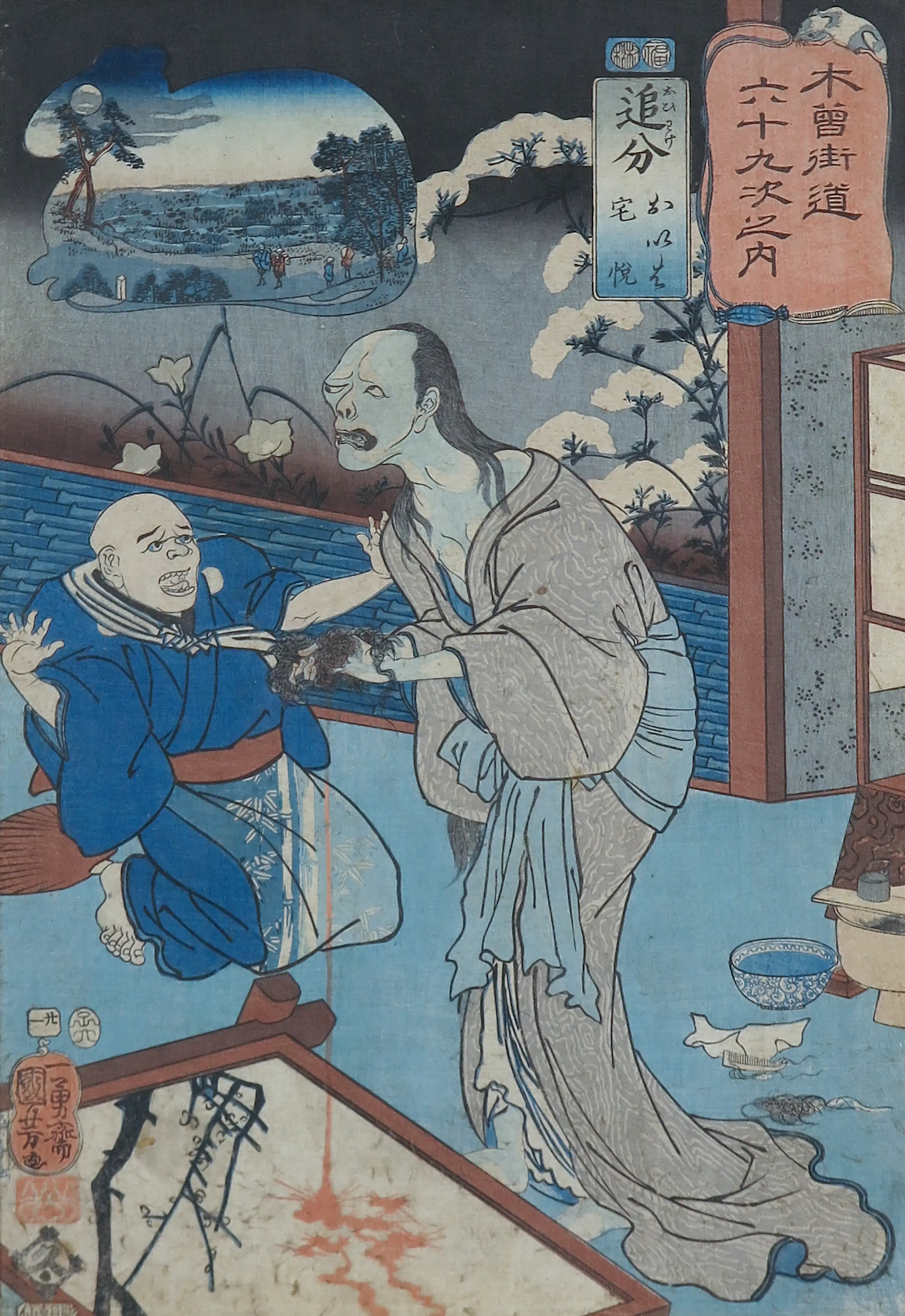 Deze prent vertelt het verhaal van Oiwa. Oiwa is het belangrijkste personage uit het spookverhaal Yotsuya Kaidan, een beroemd kabuki toneelstuk waarbij veel gebruikt werd gemaakt van special-effects.