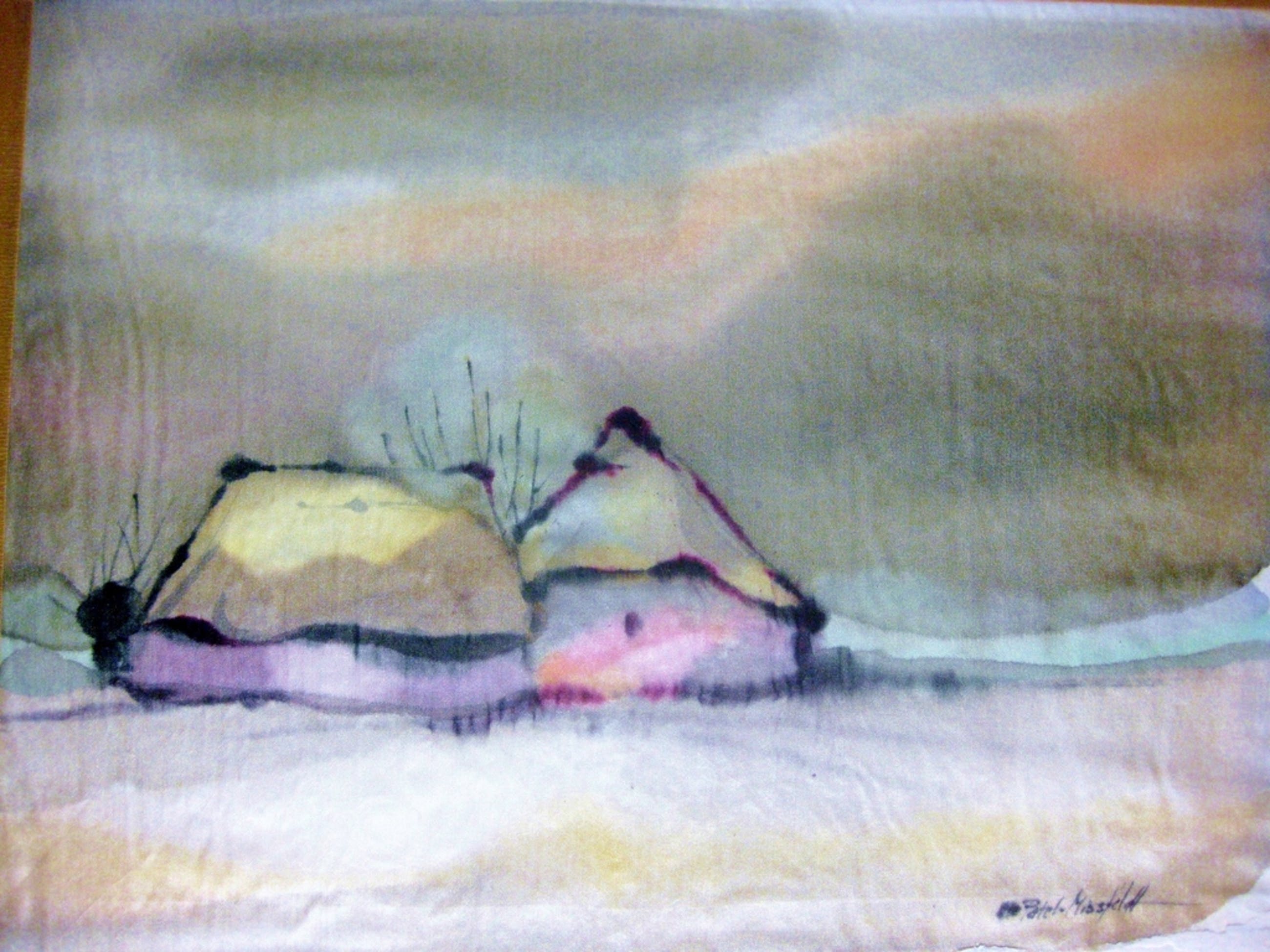 Schildering met voorstelling van een boerderij.